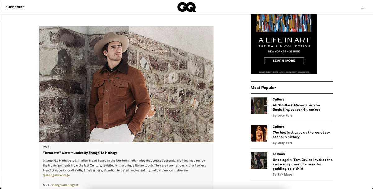 We’re proud to be featured in the Selection of GQ Shops (UK), June 2023. They showcase the Masterpiece “Terracotta” Western Jacket