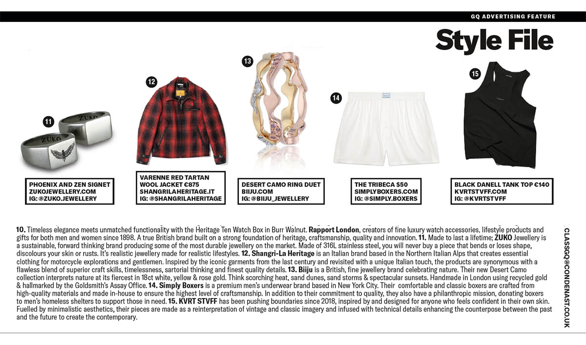 We’re proud to be featured on GQ (UK), October 2023 Issue. They showcase the Masterpiece “Varenne” Red Tartan Wool Jacket