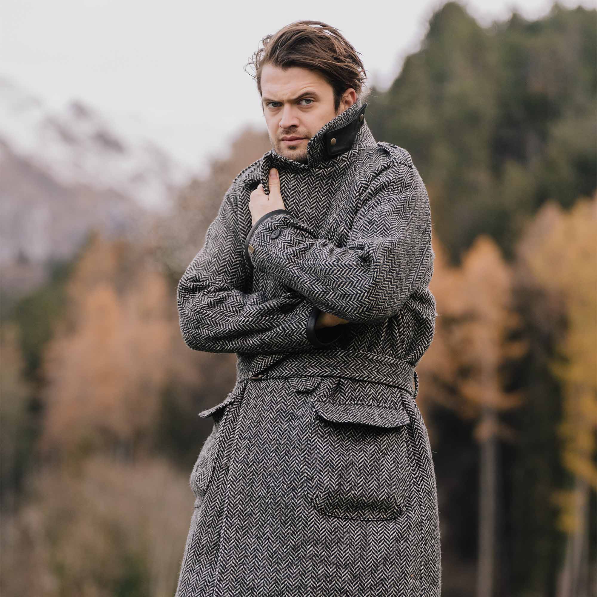 “Stelvio” Grey Herringbone Wool Dispatch Rider Coat