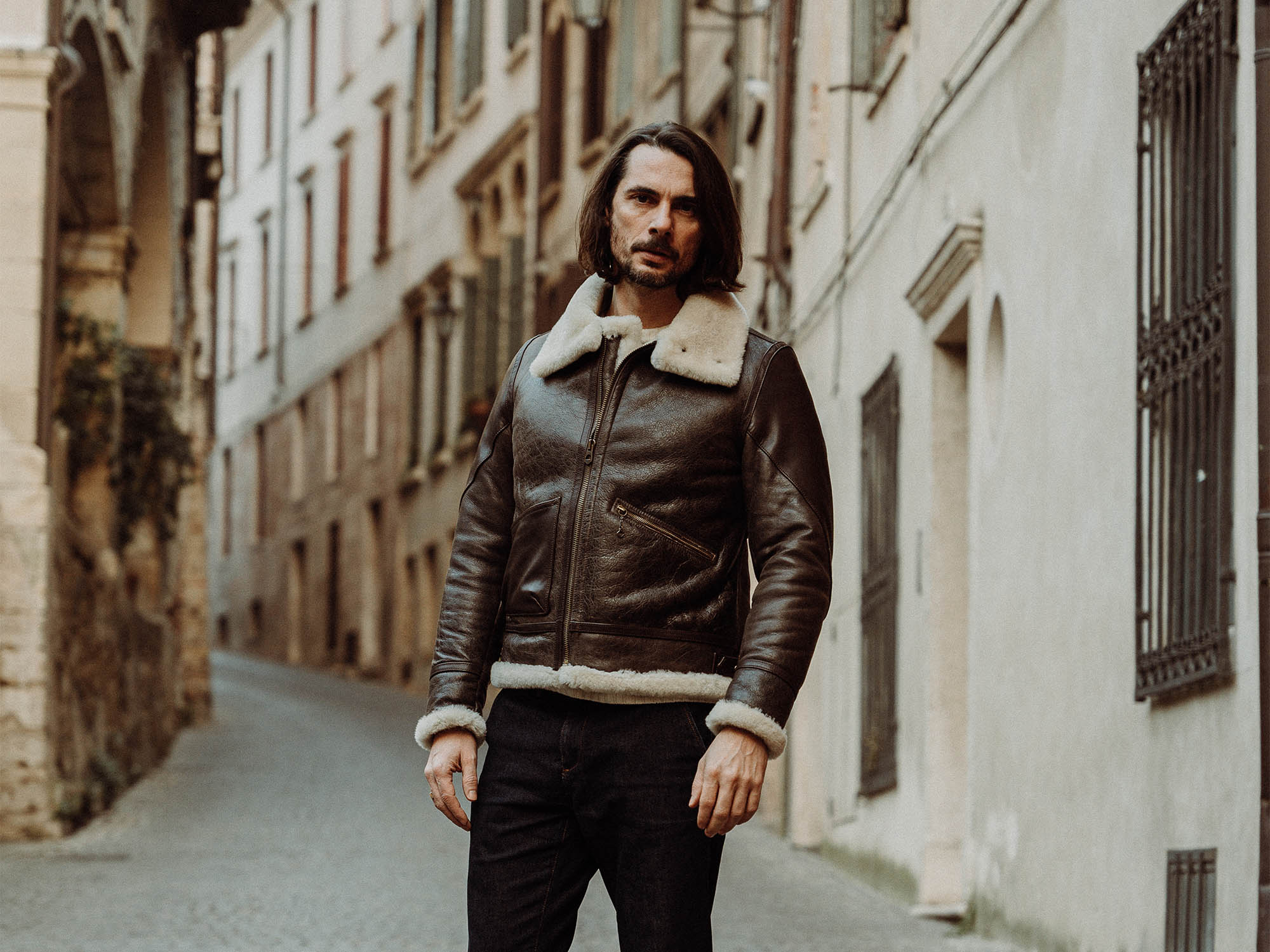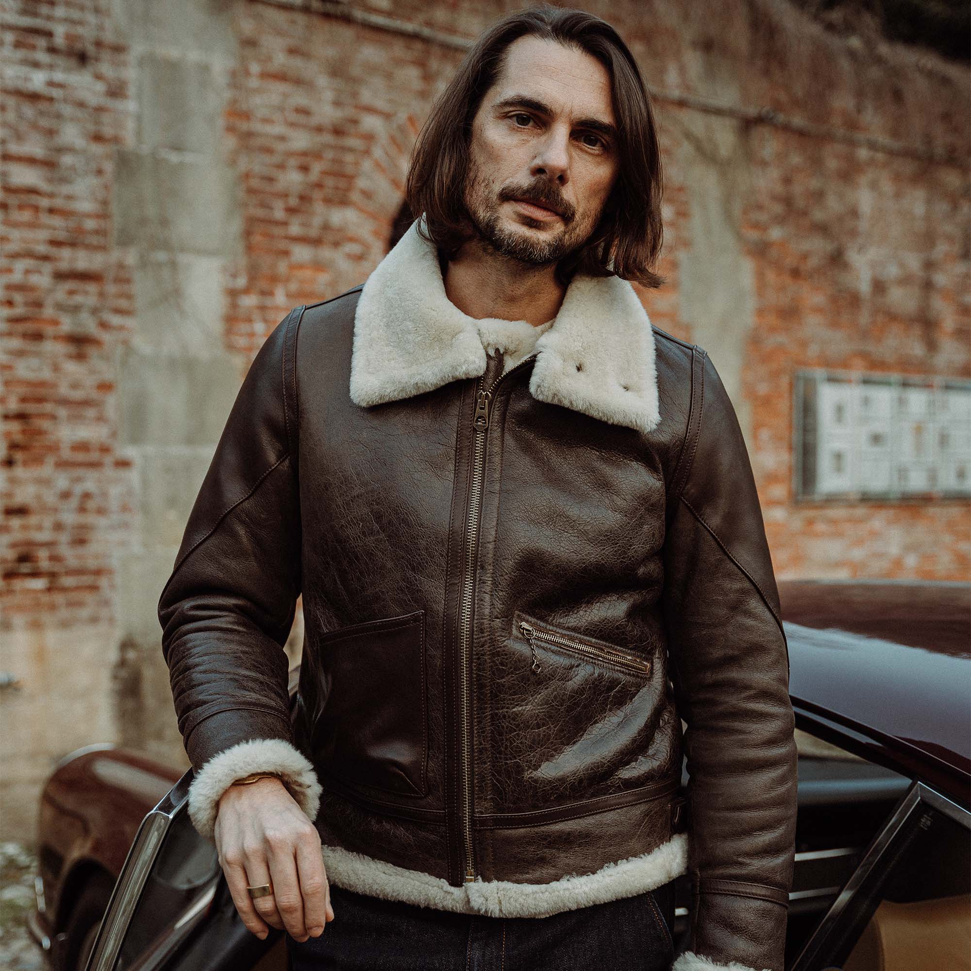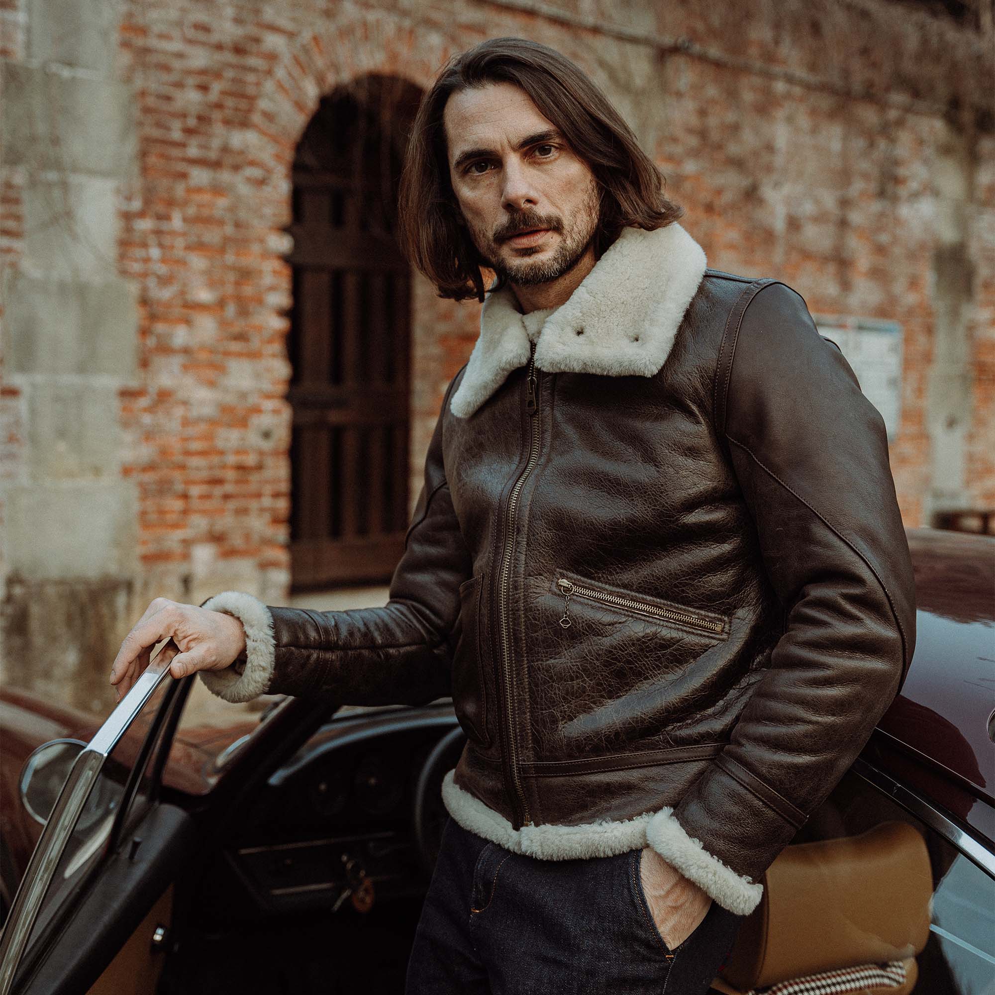 Inspired by early 40s type B-3 Flight jackets from the Second World War and revisited with a unique Italian touch, the “Aviatore” B-3 Shearling Jacket represents an authentic garment made of Italian Shearling Sheepskin reinforced with leather trimmings in vegetable tanned Lambskin from Tuscany (Italy).
