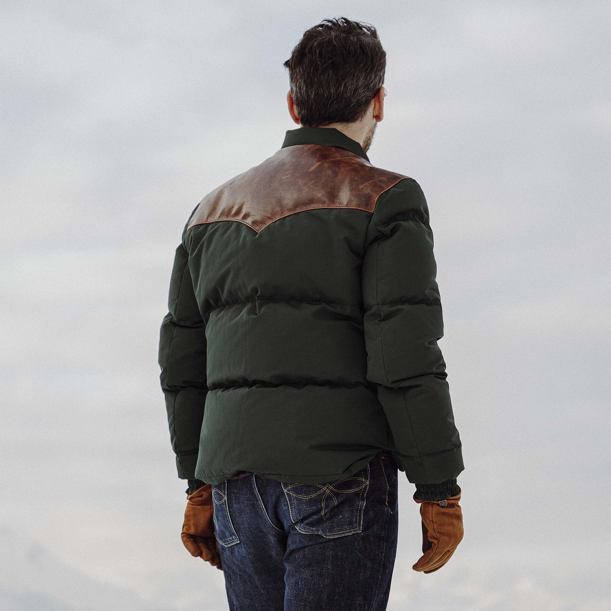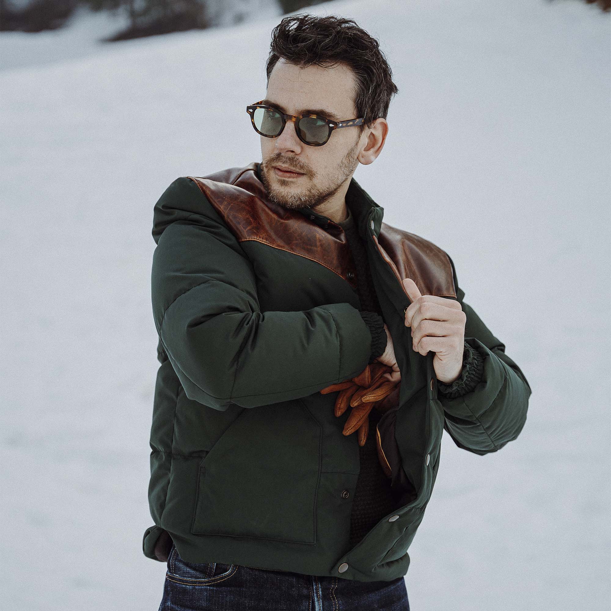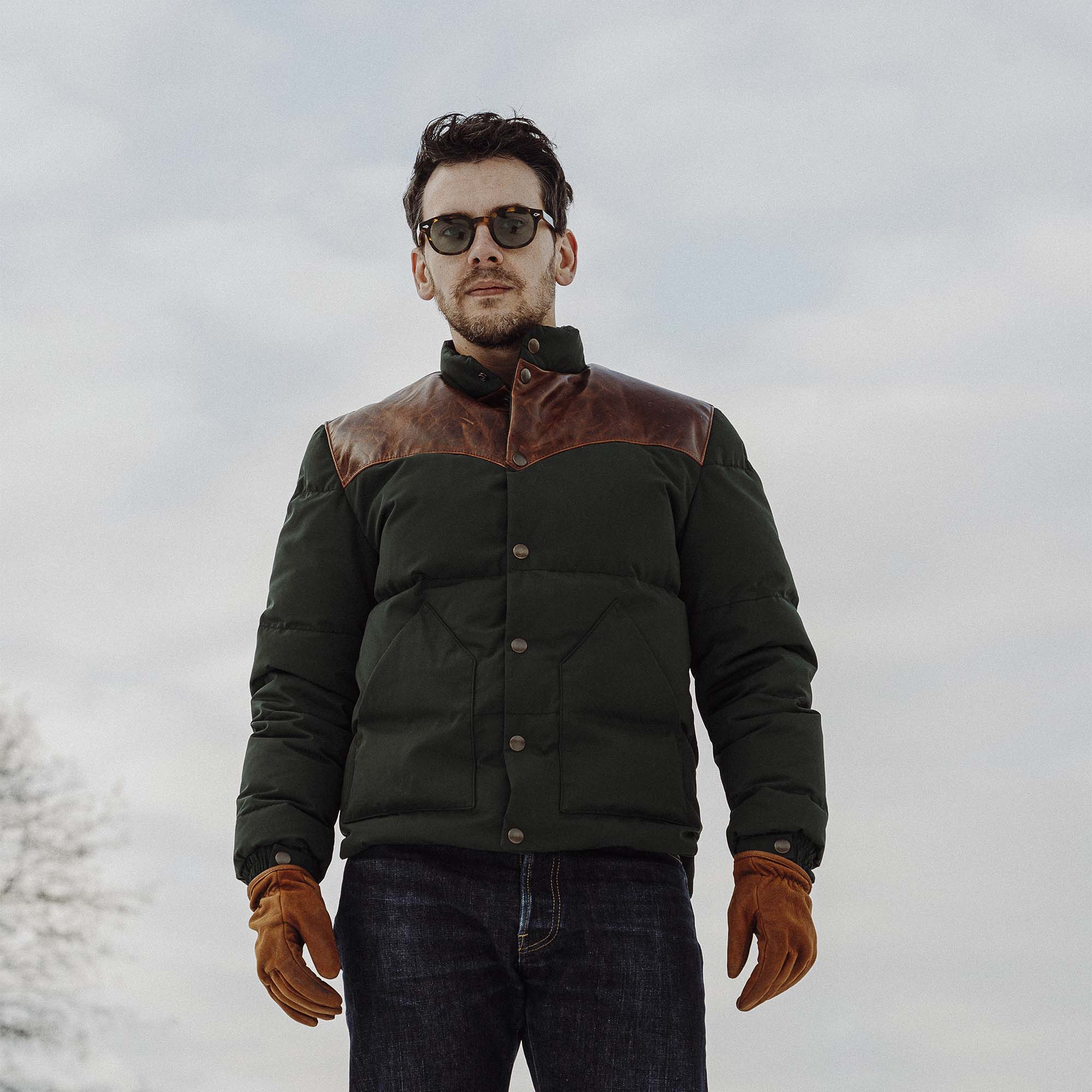 Inspired by 1960s Cowboy Jackets and revisited with a unique Italian touch, the “Bivacco” Forest Green Western Down Jacket represents an authentic garment made of Recycled 80% Goose Down / 20% Feather from Tuscany (Italy) with the traditional western yoke made with Front Quarter Pull-up Horsehide by Charles F. Stead, one of the oldest tanneries in the UK (since 1890s in Leeds, United Kingdom).
