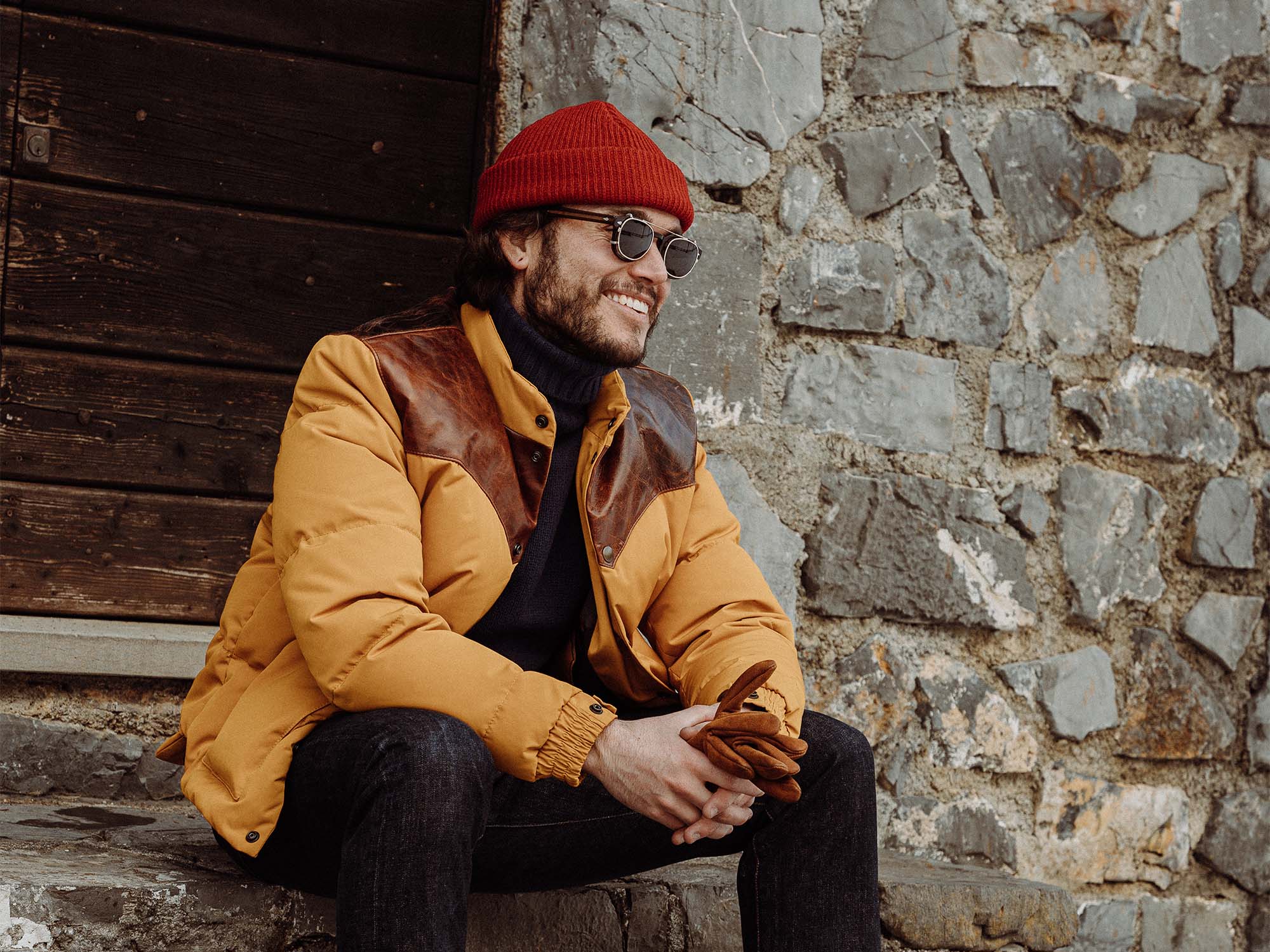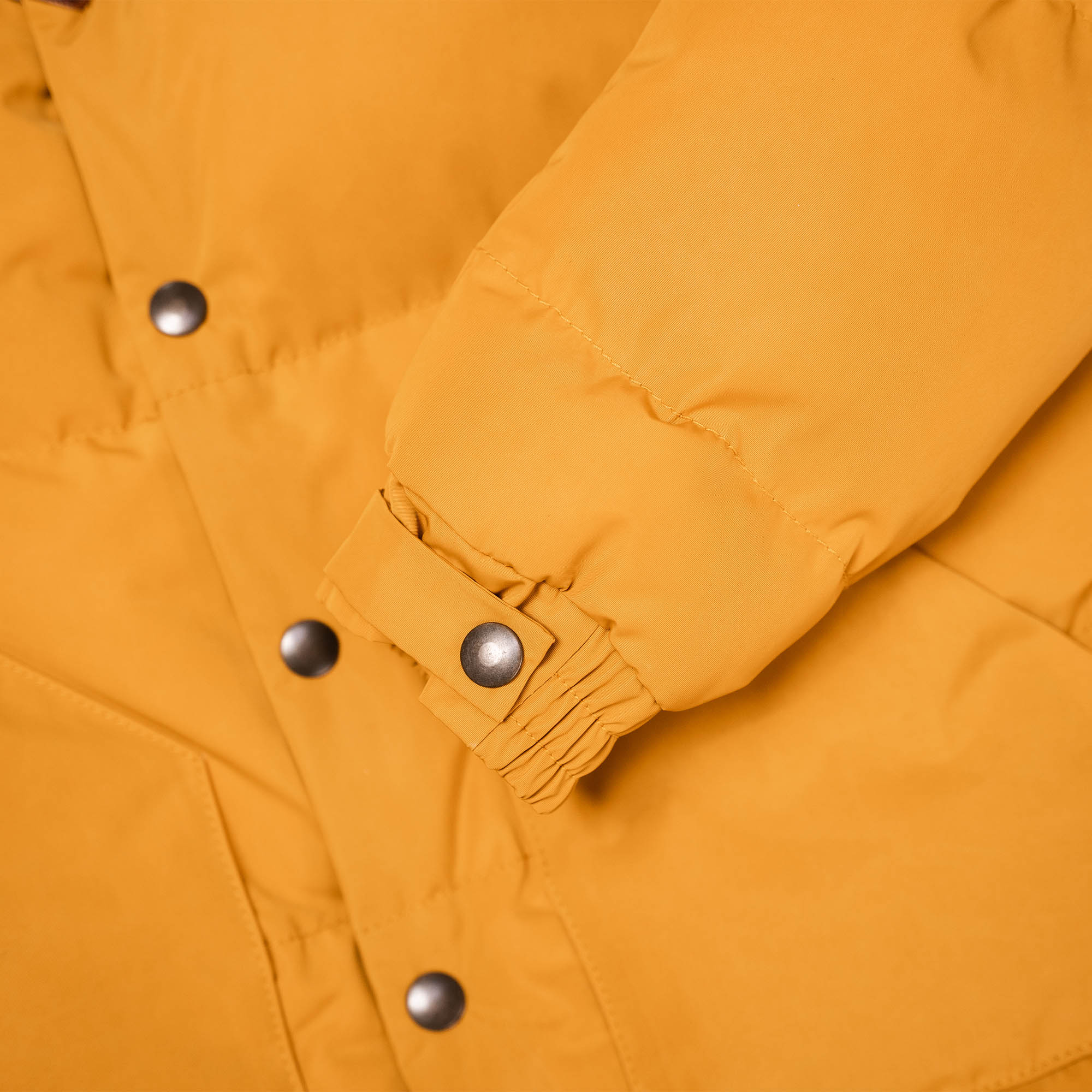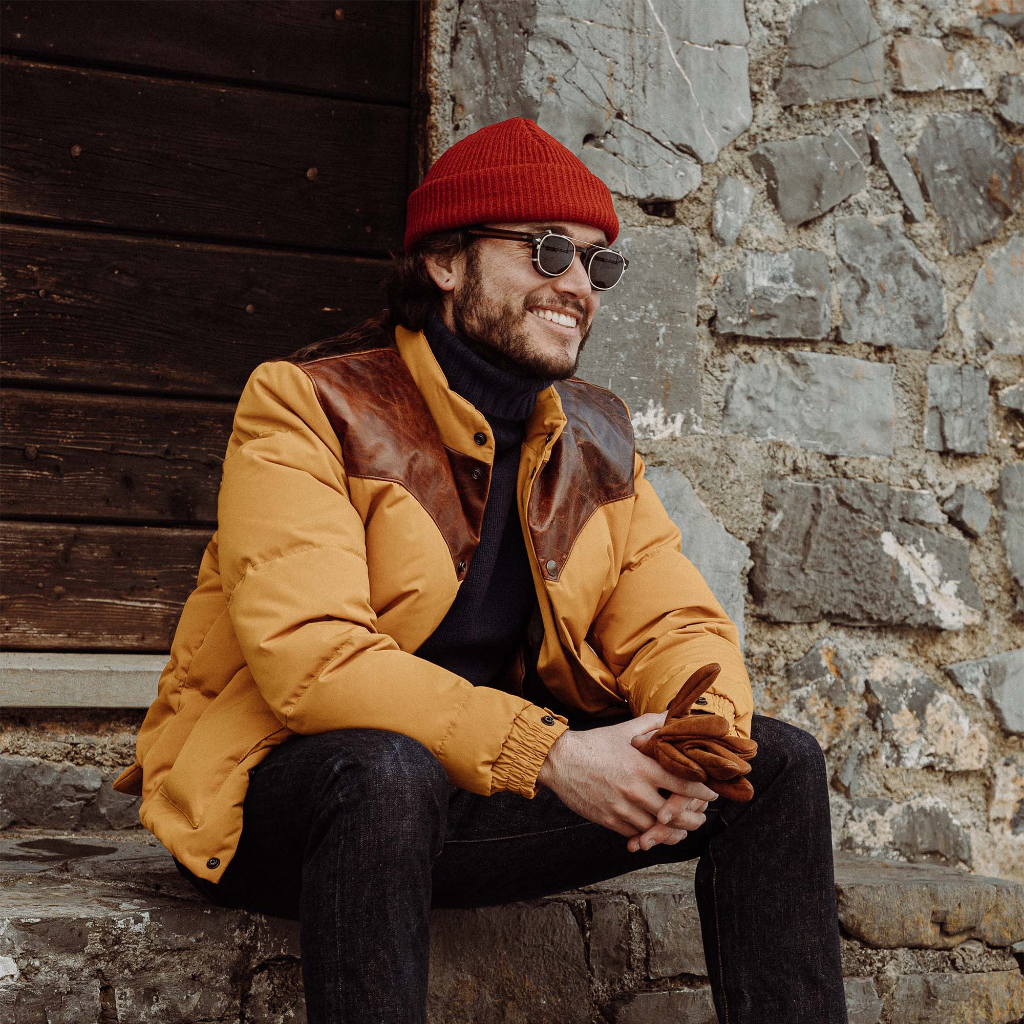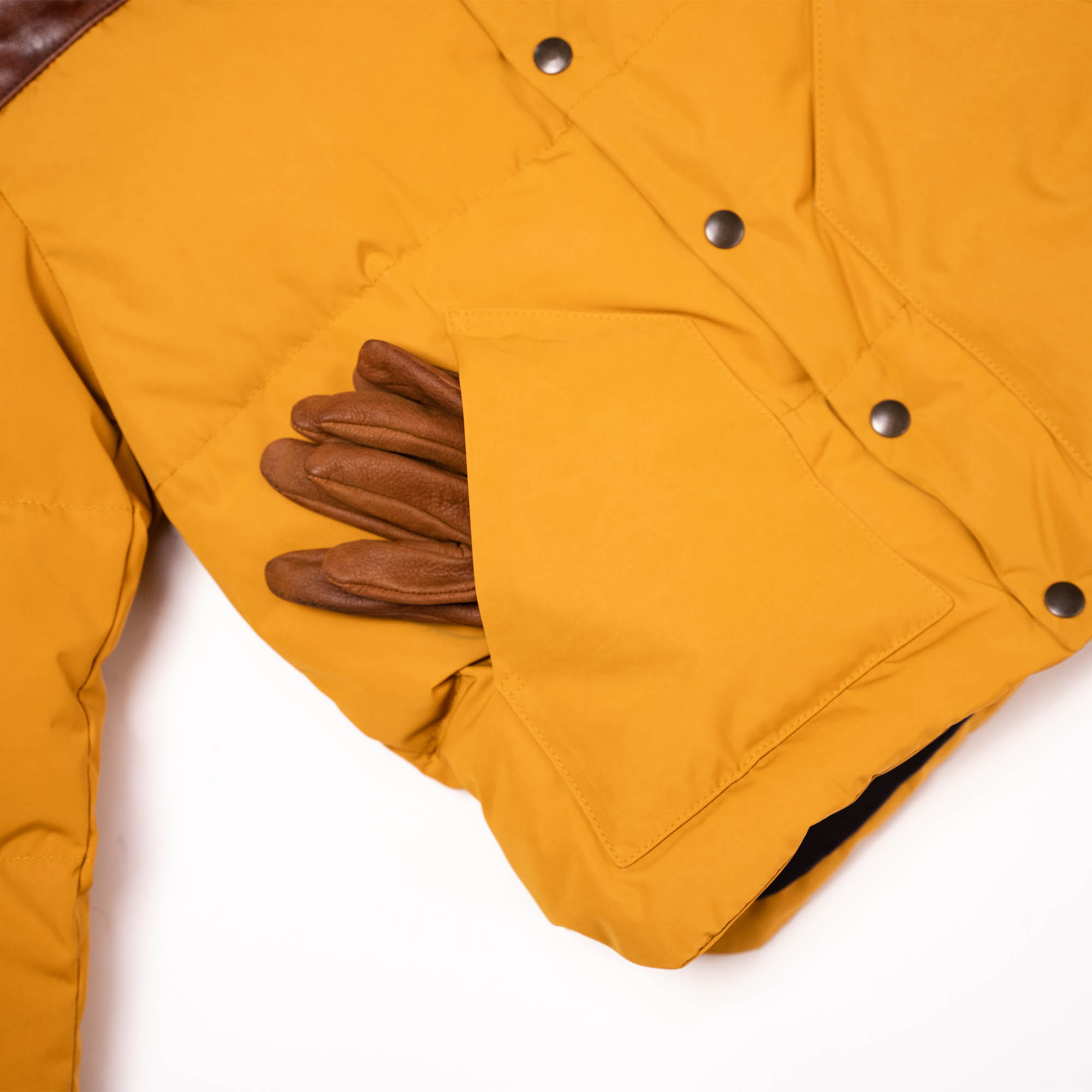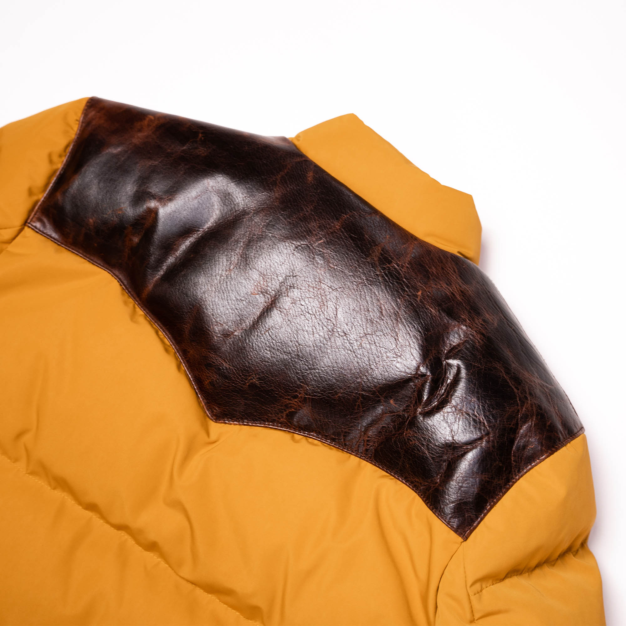 Inspired by 1960s Cowboy Jackets and revisited with a unique Italian touch, the “Bivacco” Yellow Western Down Jacket represents an authentic garment made of Recycled 80% Goose Down / 20% Feather from Tuscany (Italy) with the traditional western yoke made with Front Quarter Pull-up Horsehide by Charles F. Stead, one of the oldest tanneries in the UK (since 1890s in Leeds, United Kingdom).