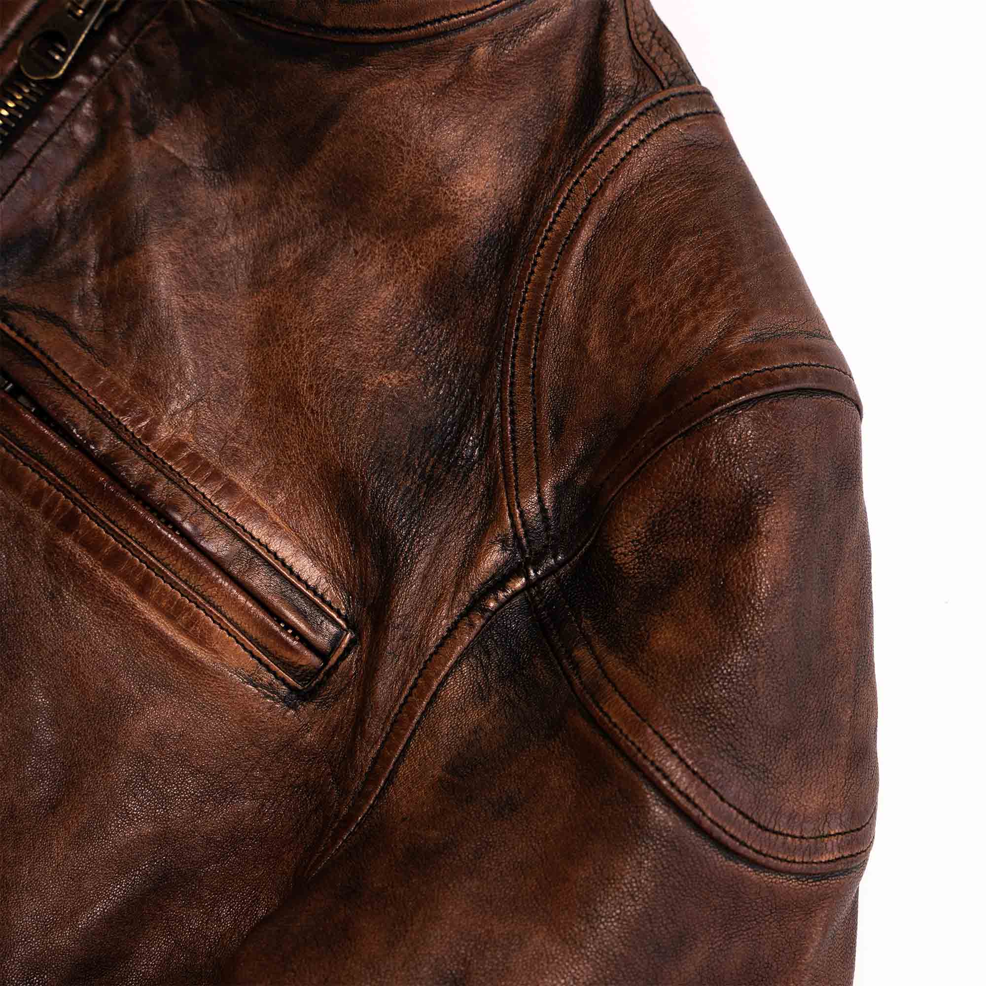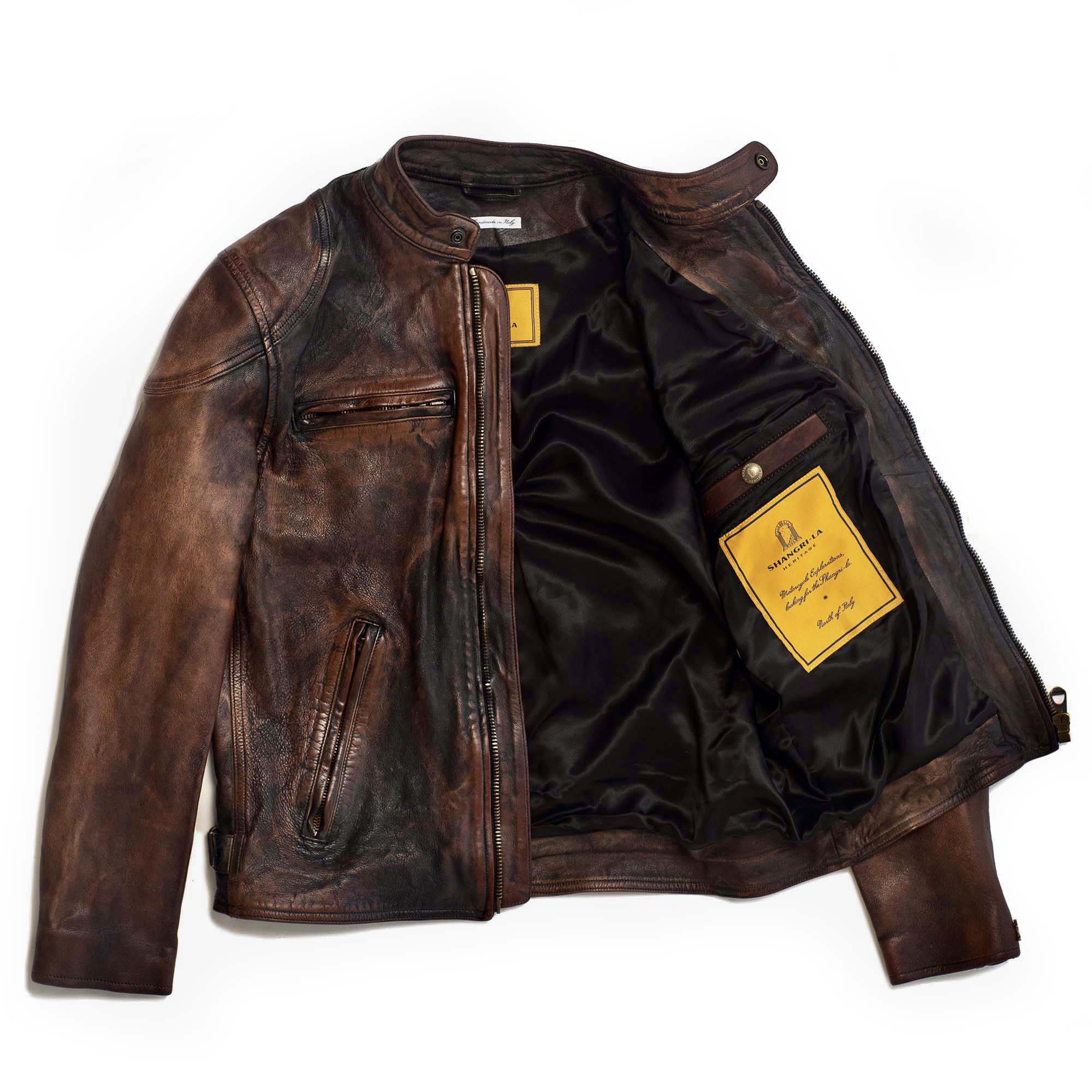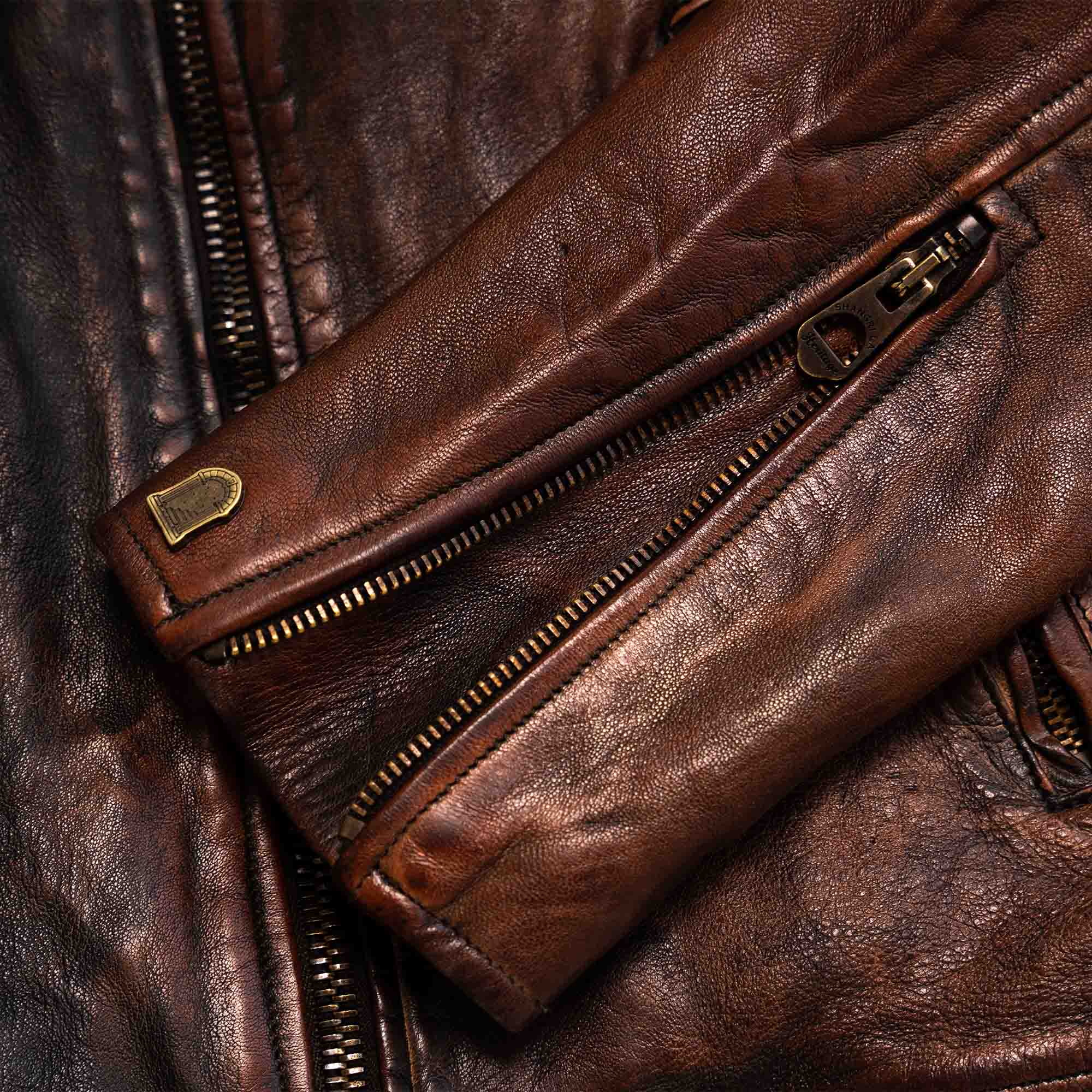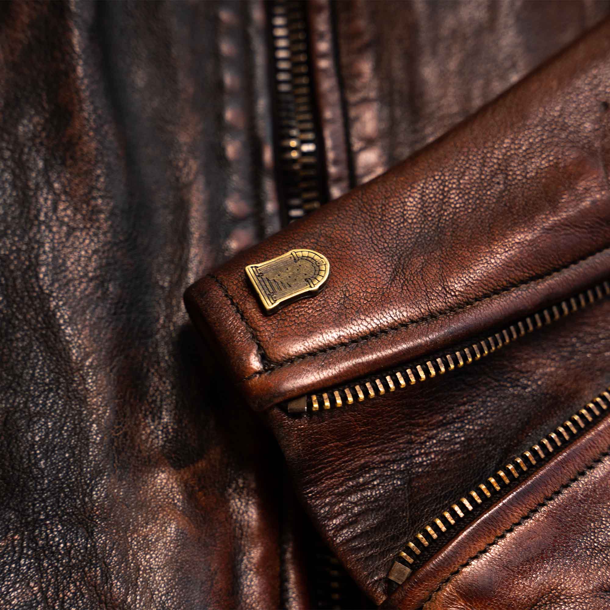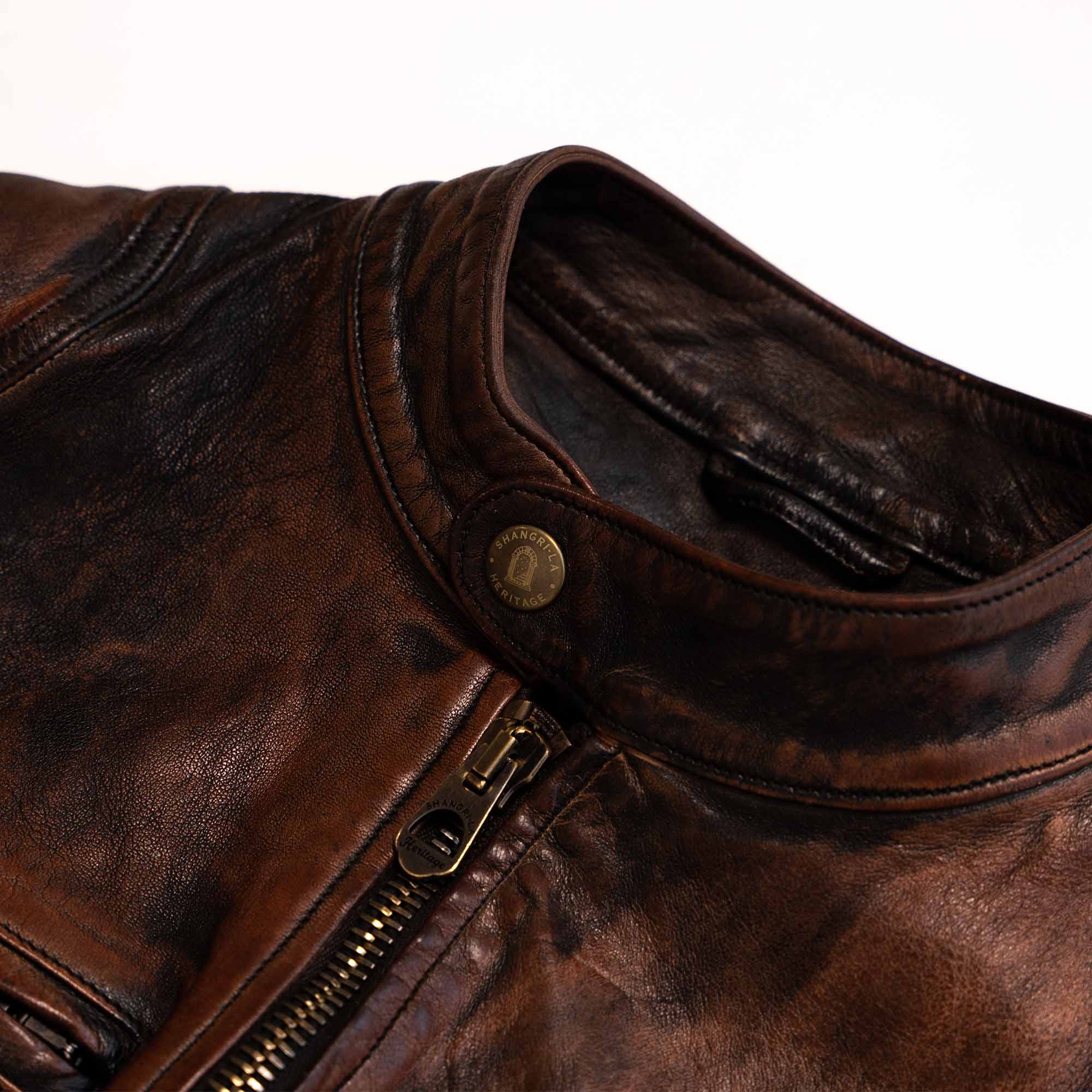 Inspired by late 70s Racing jackets and revisited with a unique Italian touch, the “Café Racer” Bruciato Leather Jacket represents an authentic garment made of vegetable tanned full grain Lambskin from Tuscany (Italy) with “Bruciato” Treatment, and “Espresso Coffee” color viscose lining.