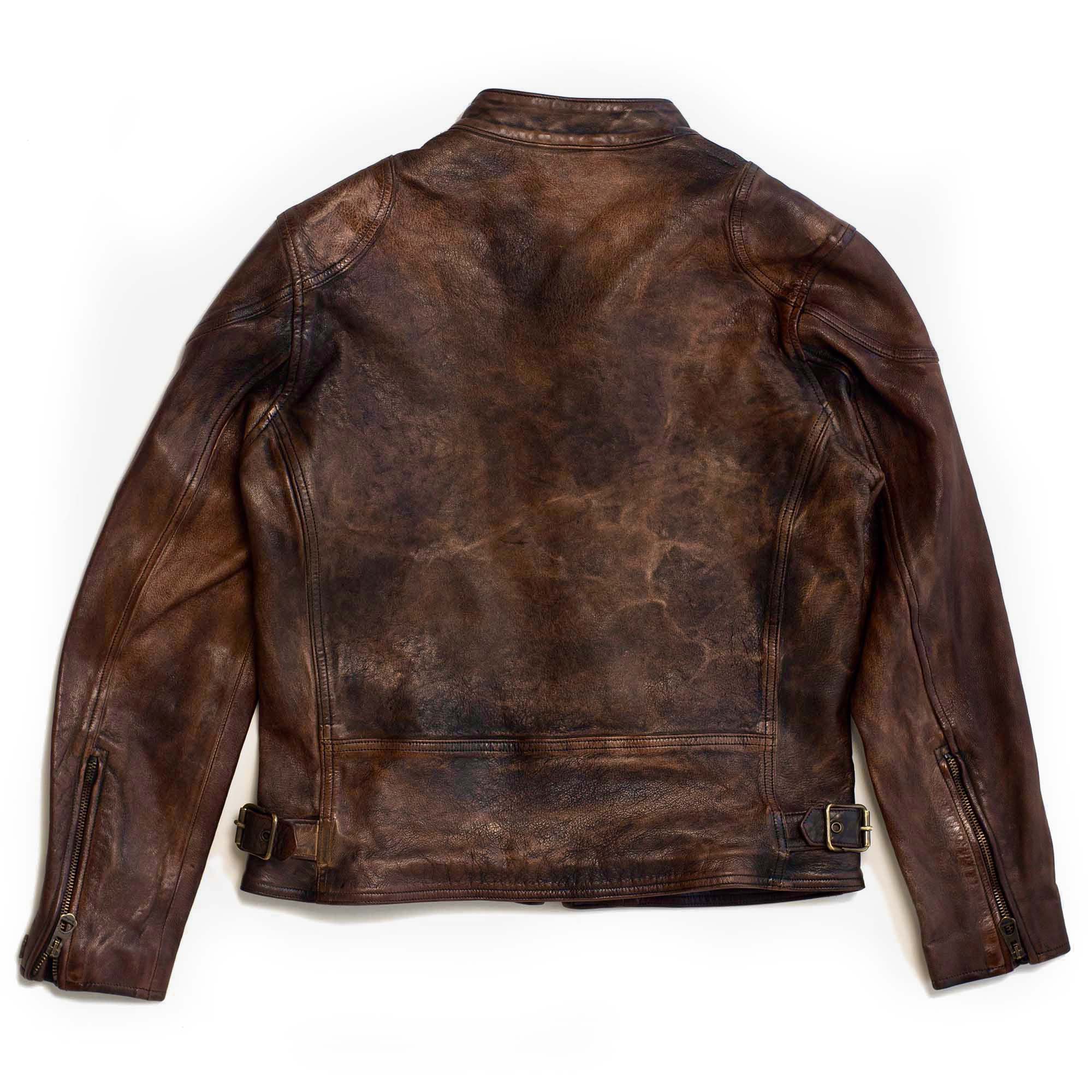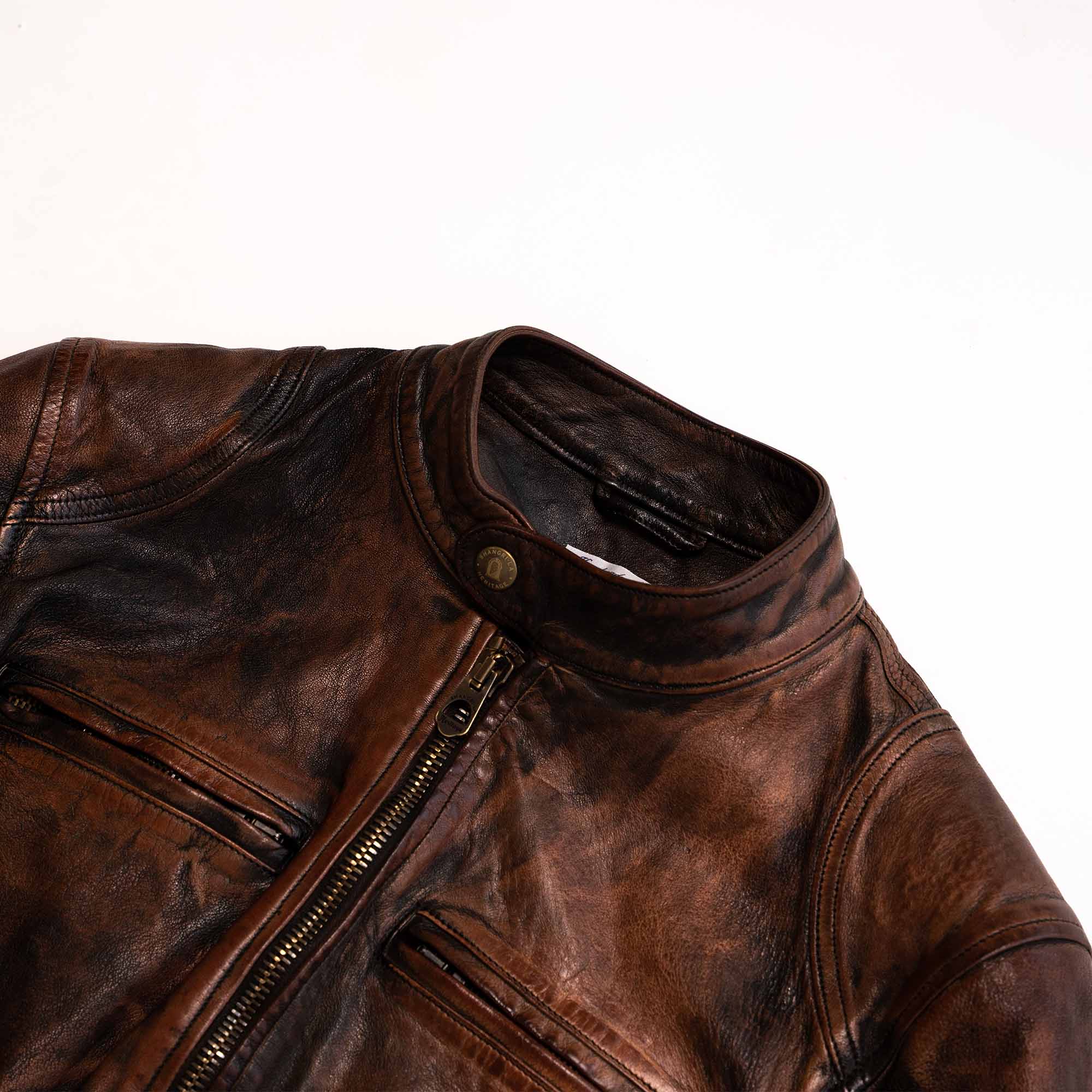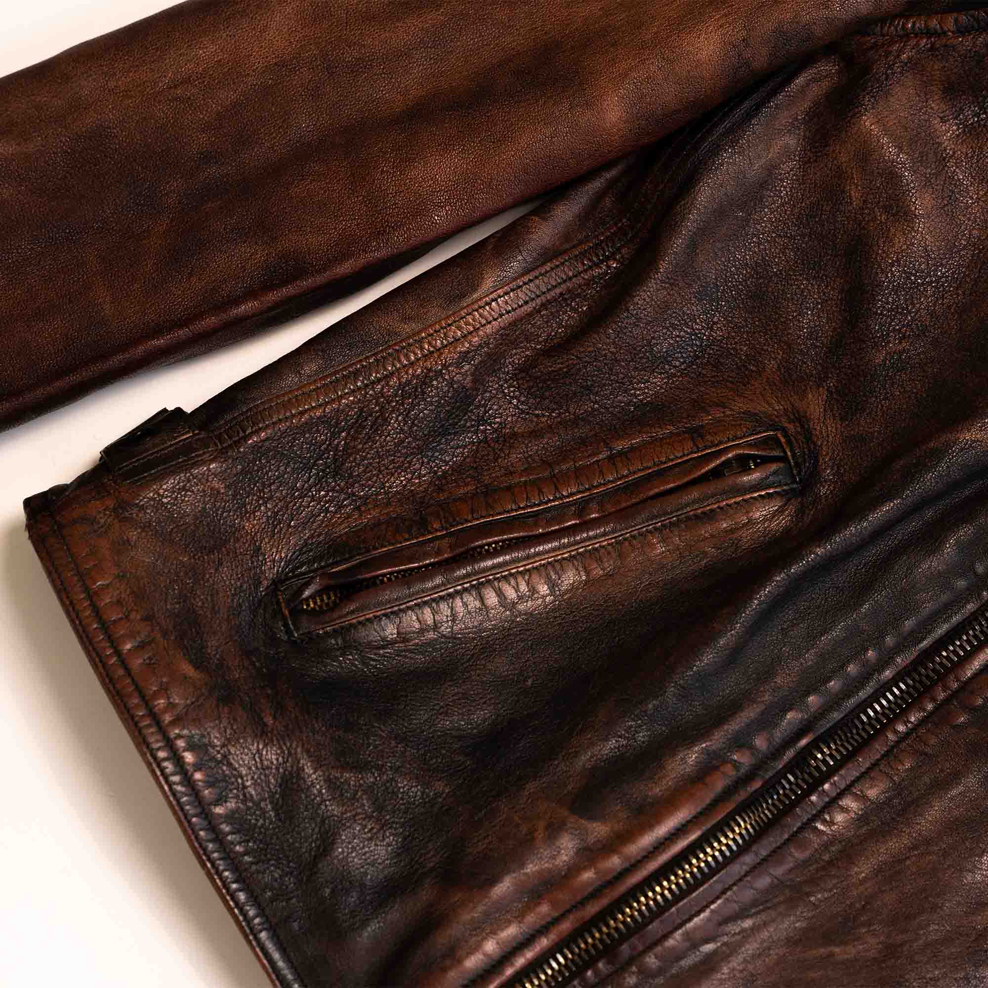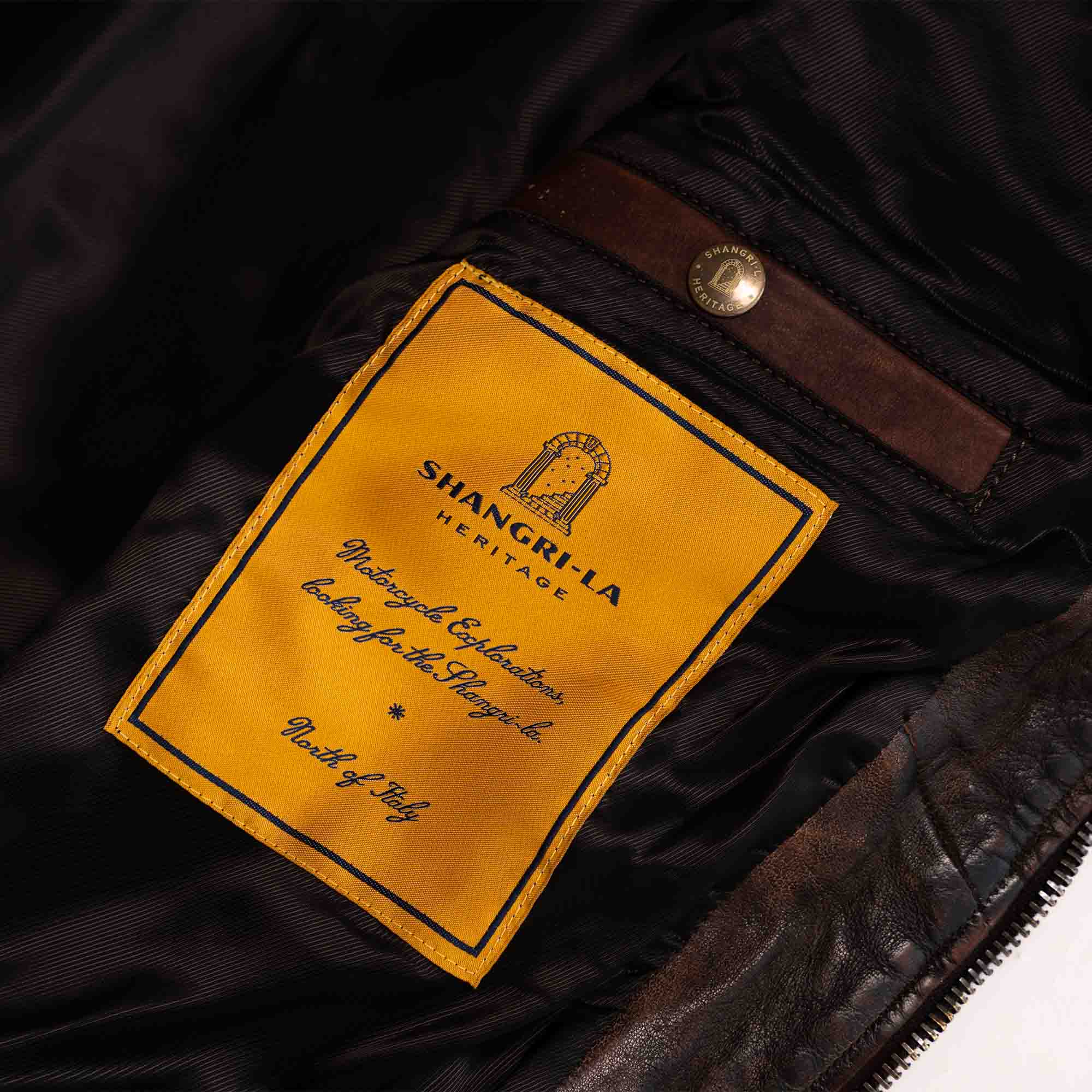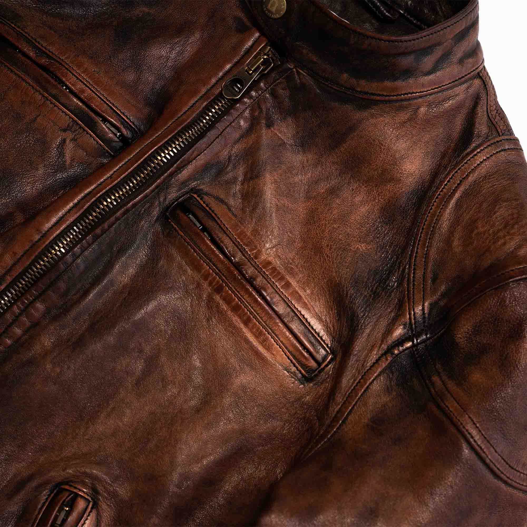 Inspired by late 70s Racing jackets and revisited with a unique Italian touch, the “Café Racer” Bruciato Leather Jacket represents an authentic garment made of vegetable tanned full grain Lambskin from Tuscany (Italy) with “Bruciato” Treatment, and “Espresso Coffee” color viscose lining.