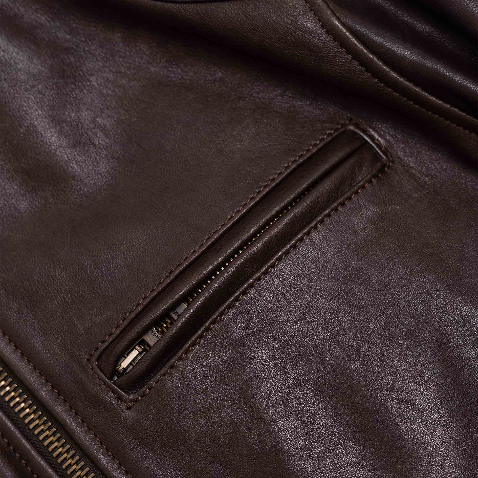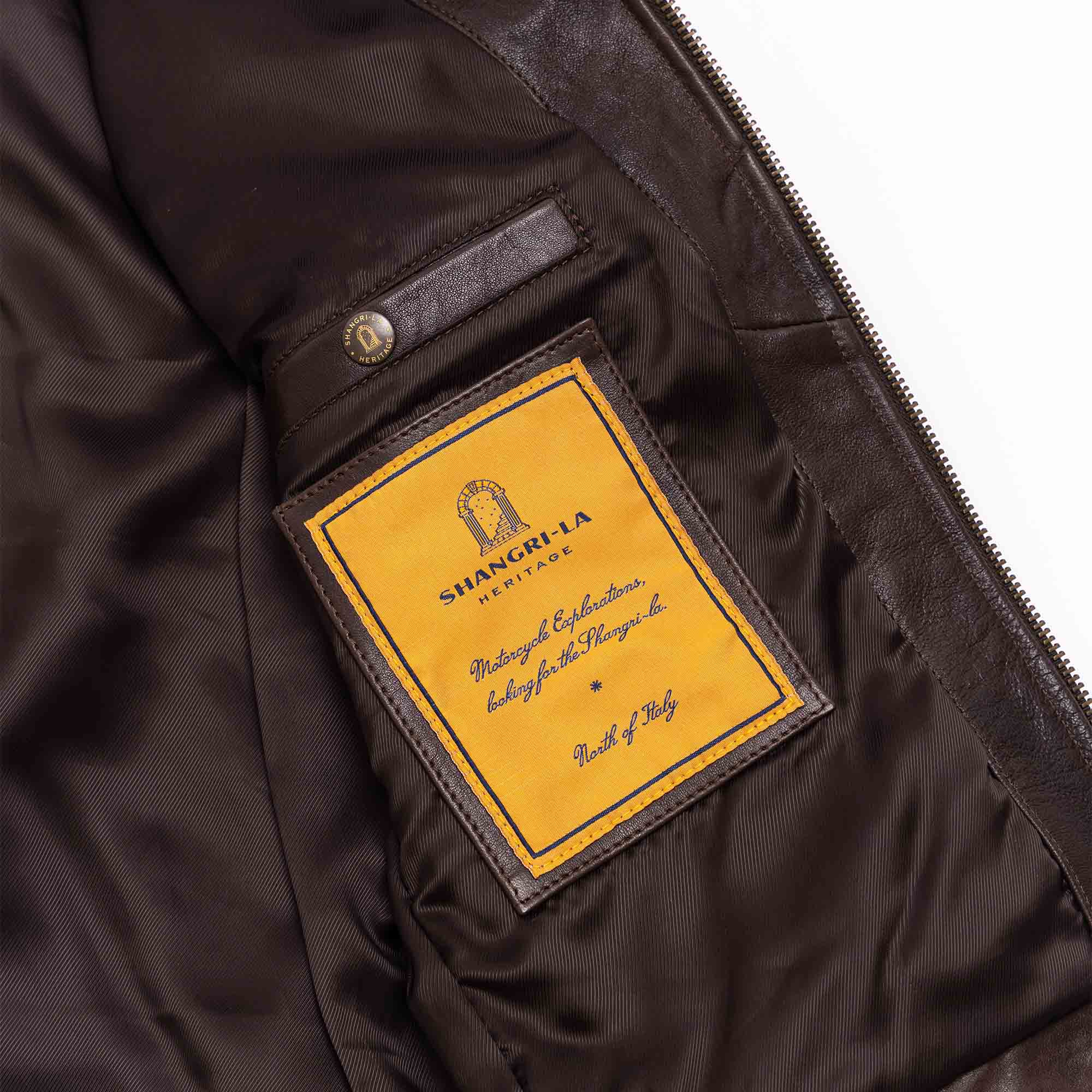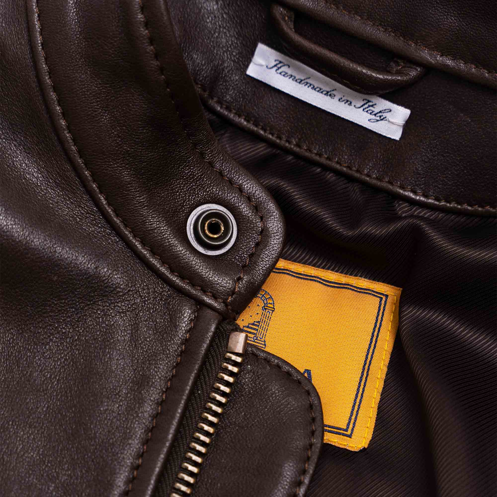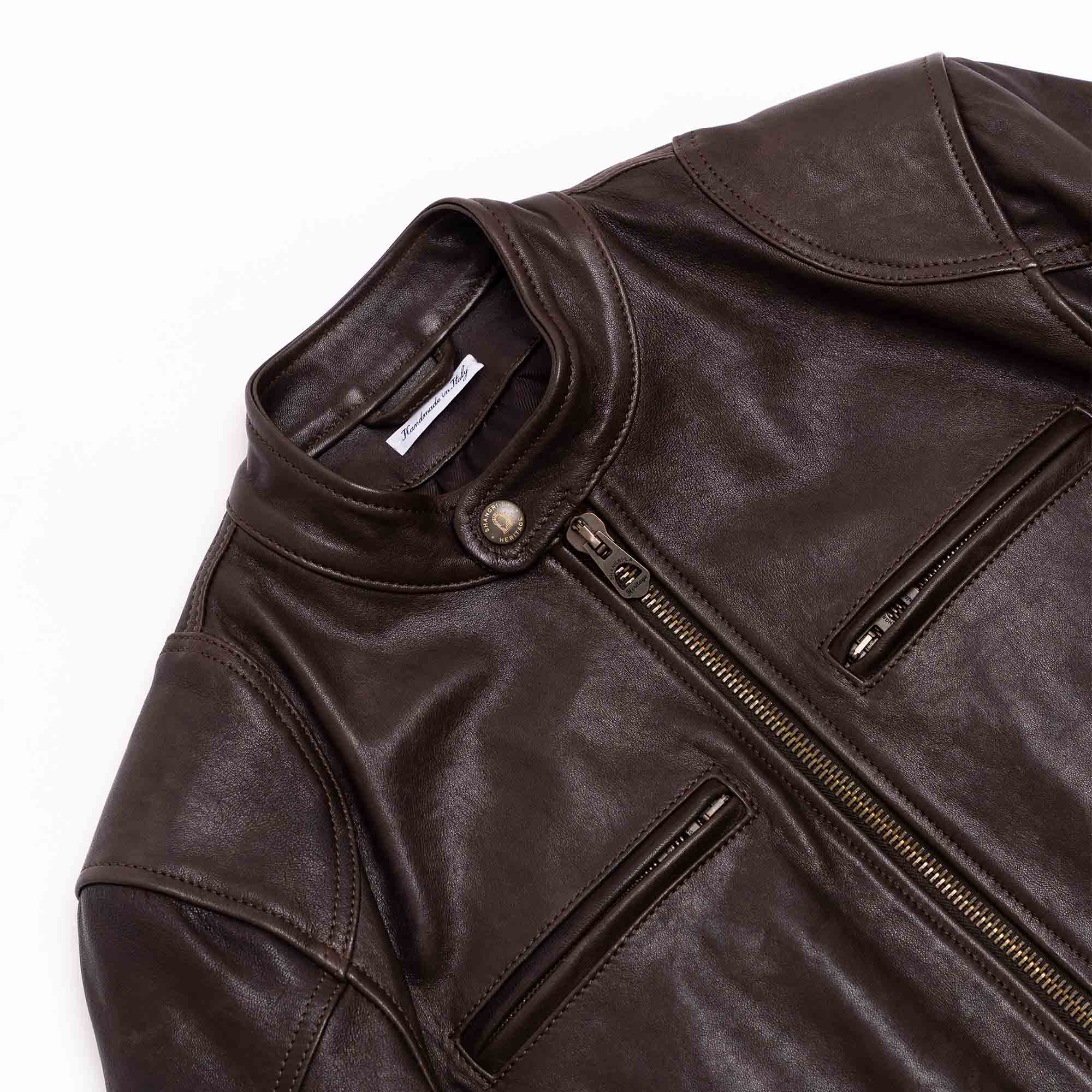 Inspired by late 70s Racing jackets and revisited with a unique Italian touch, the “Café Racer” represents an authentic garment made of vegetable tanned, drum dyed, full grain Lambskin from Tuscany (Italy) and “Espresso Coffee” color viscose lining.