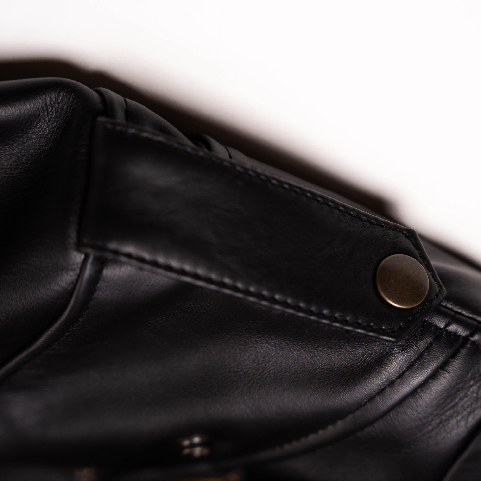 Inspired by 1950s Motorcycle jackets and revisited with a unique Italian touch, the “Chiodo” Black Steerhide Leather Jacket represents an authentic garment made of chrome tanned, drum dyed, full grain Steerhide from Vicenza (Italy).