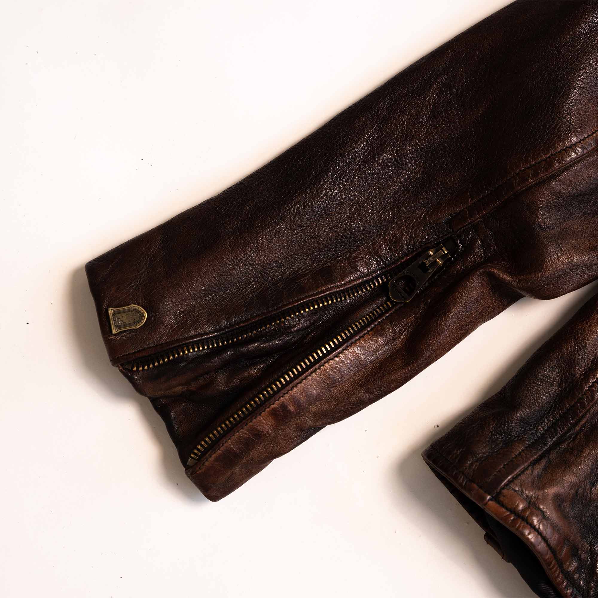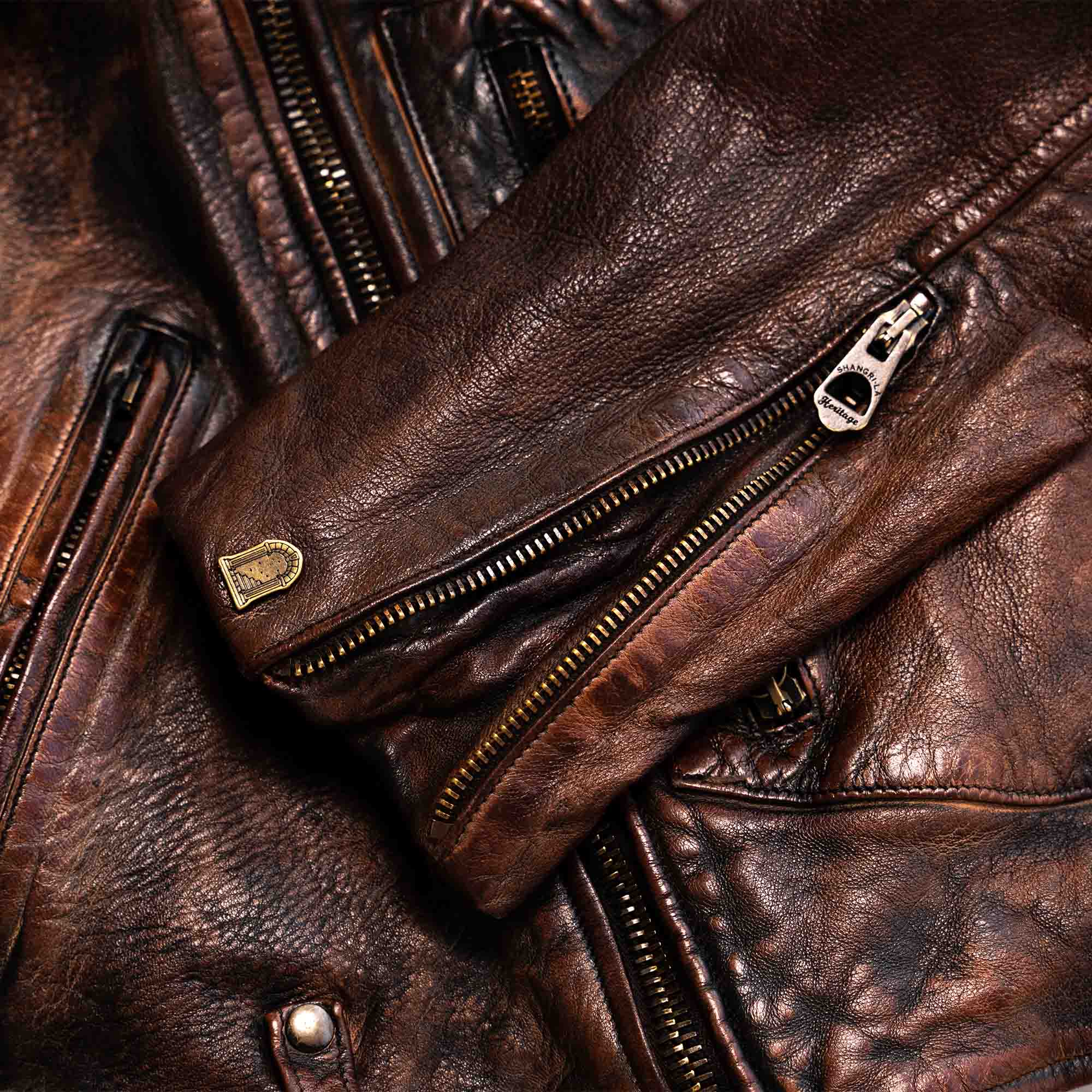 The metallic zippers are made of antique brass with engraved markings.