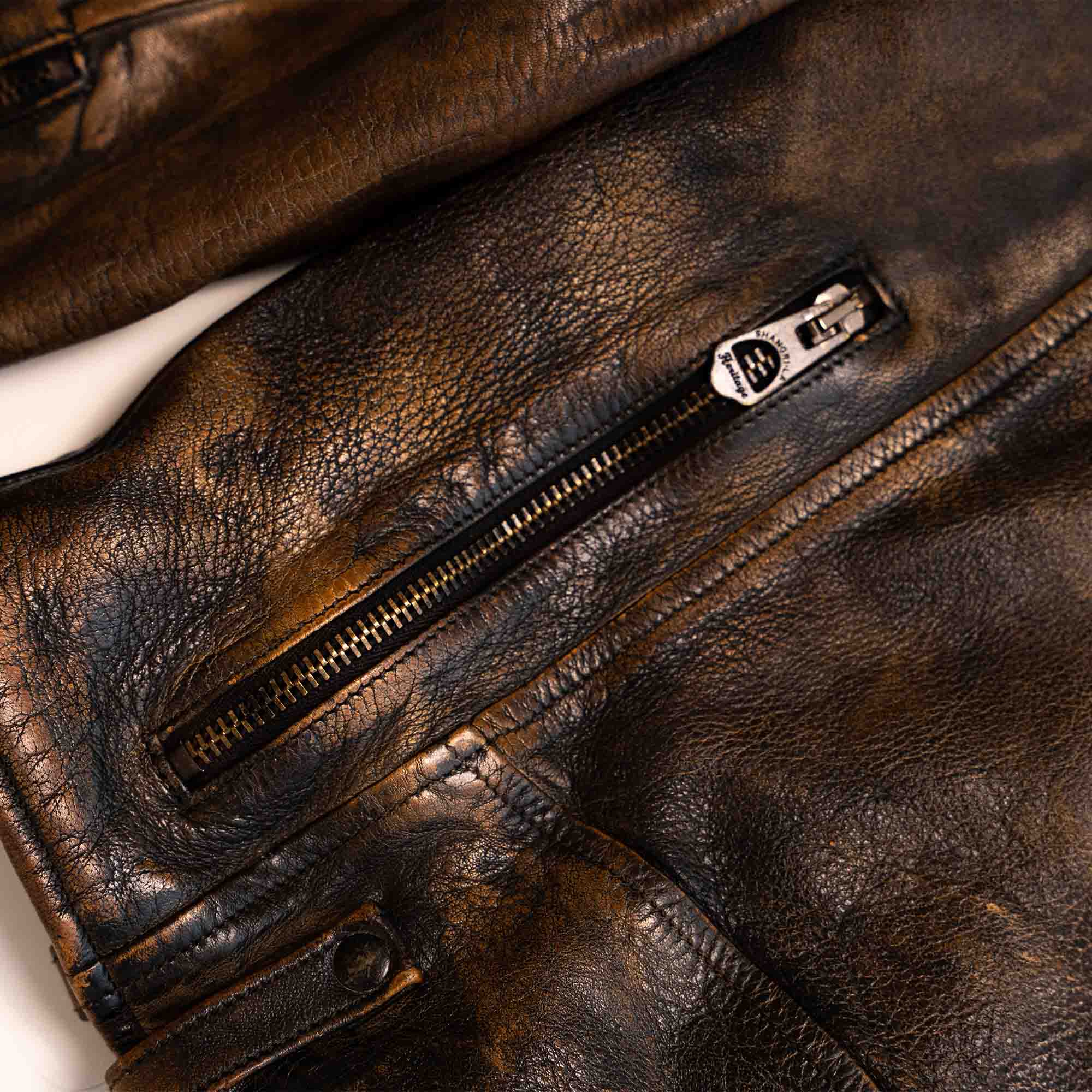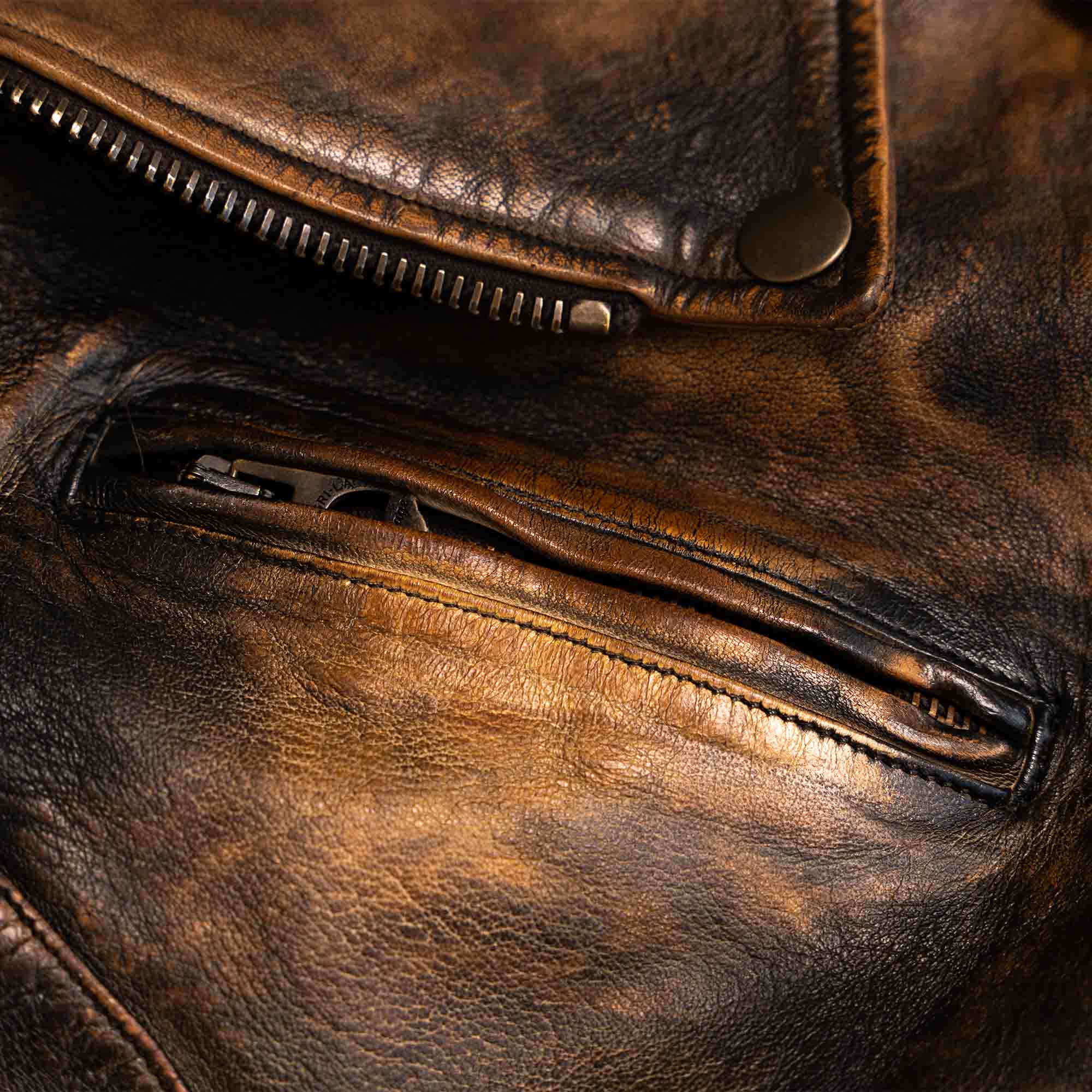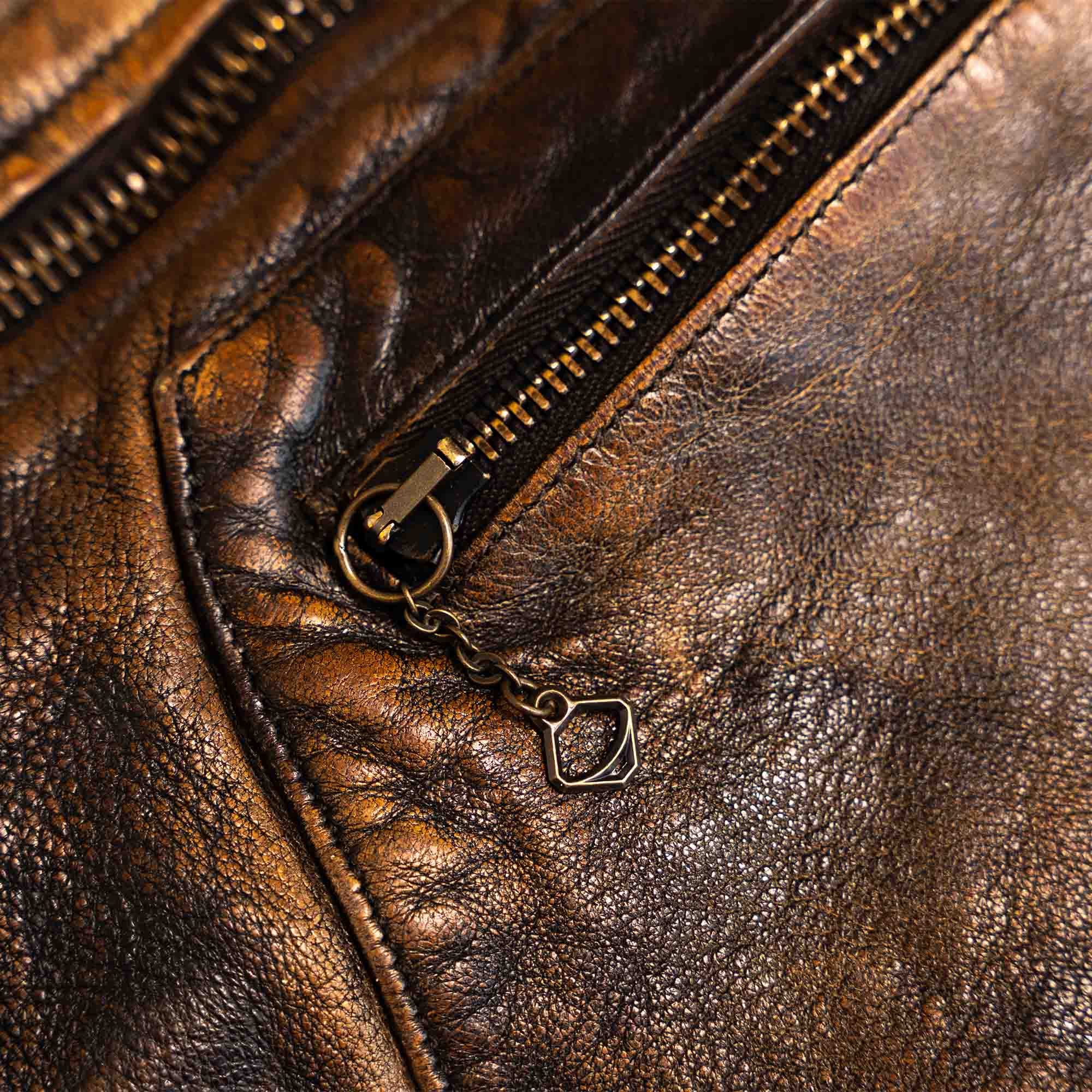 Inspired by late 50s Motorcycle jackets and revisited with a unique Italian touch, the “Chiodo” Deserto Leather Jacket represents an authentic garment made of vegetable tanned full grain Lambskin from Tuscany (Italy) with “Deserto””+ Treatment, and “Espresso Coffee” color viscose lining.