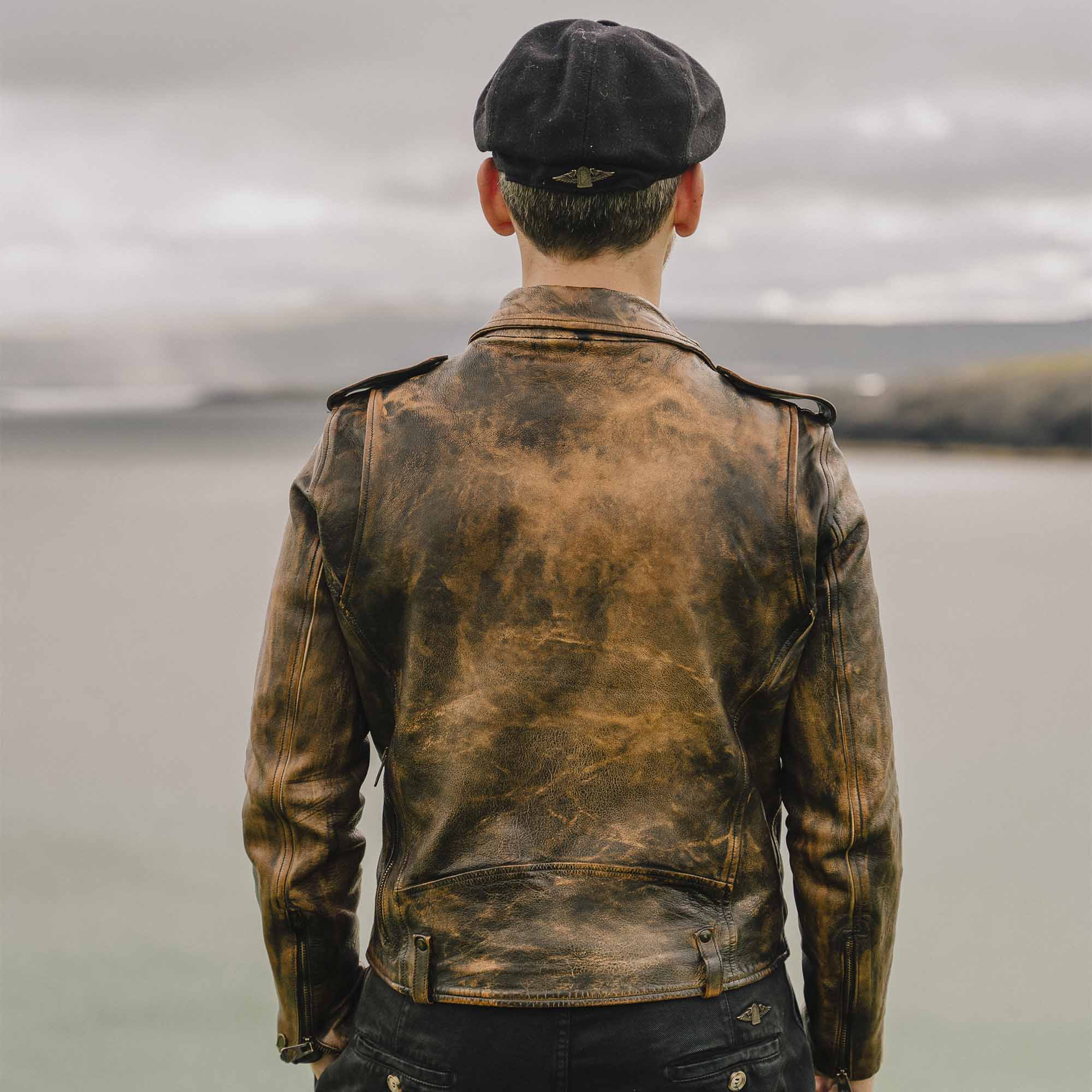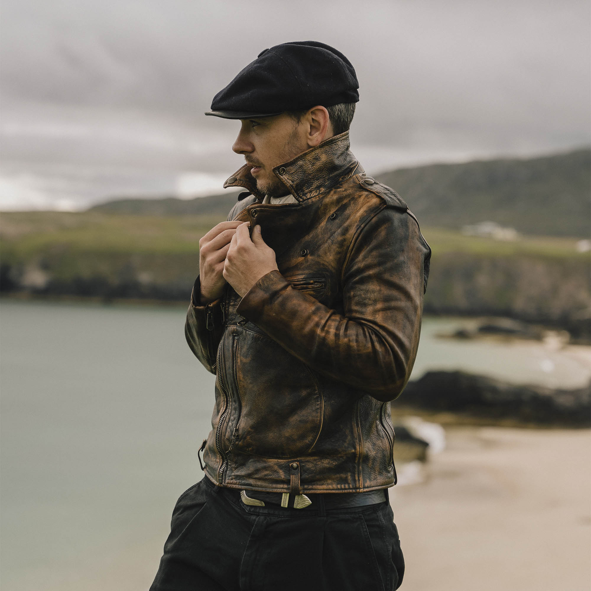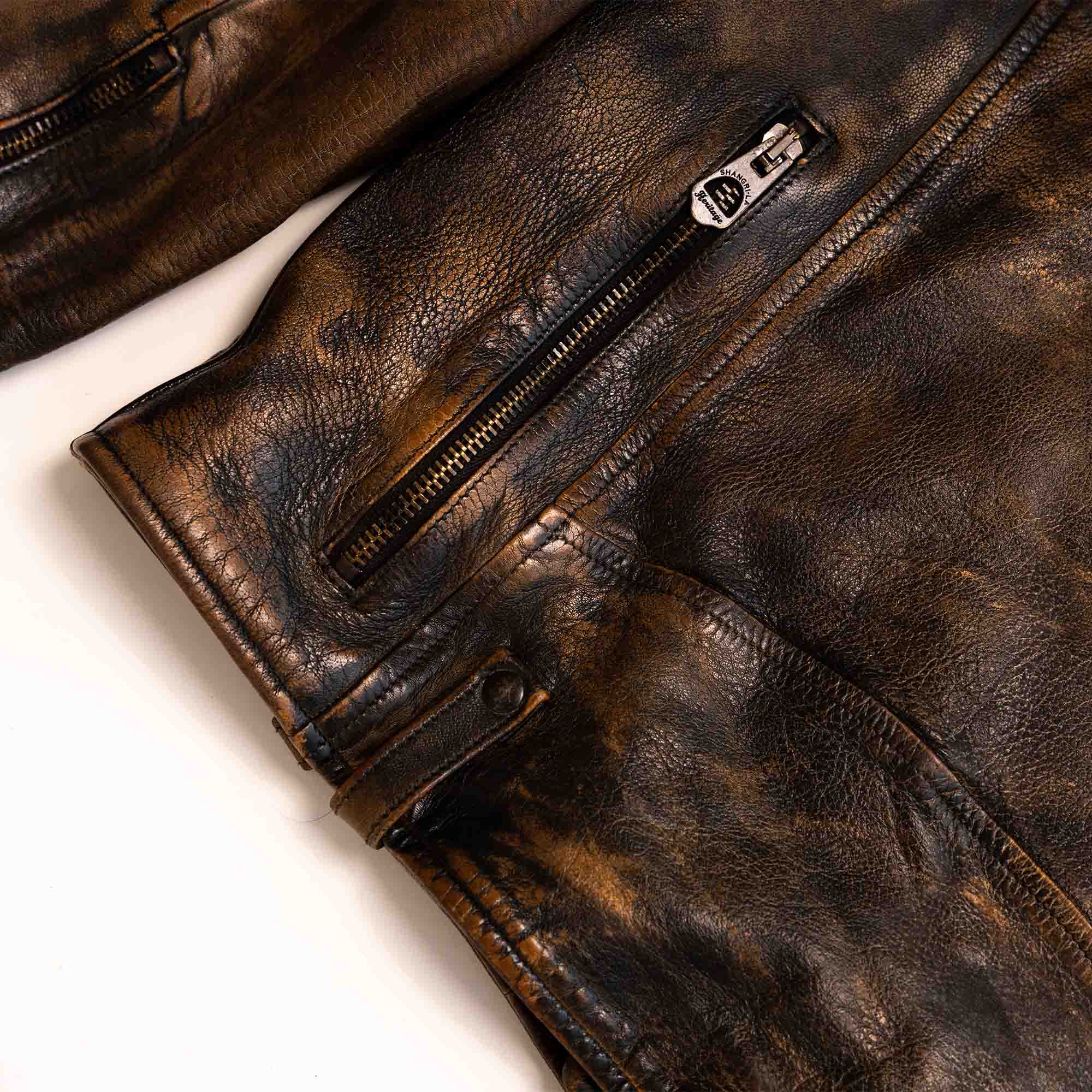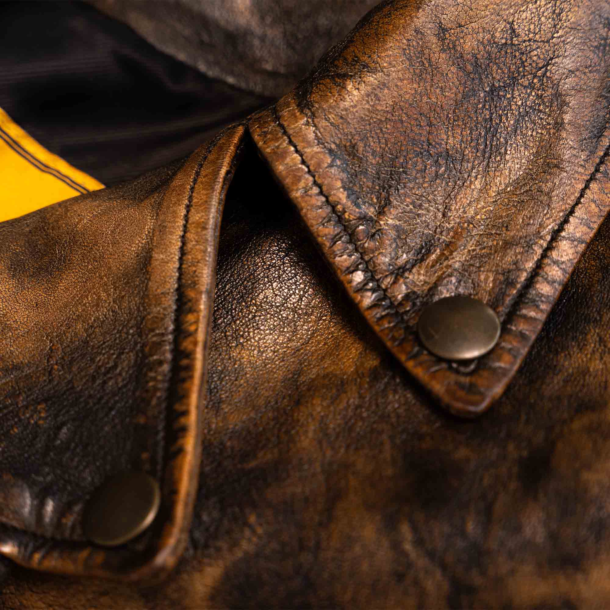 Inspired by late 50s Motorcycle jackets and revisited with a unique Italian touch, the “Chiodo” Deserto Leather Jacket represents an authentic garment made of vegetable tanned full grain Lambskin from Tuscany (Italy) with “Deserto””+ Treatment, and “Espresso Coffee” color viscose lining.