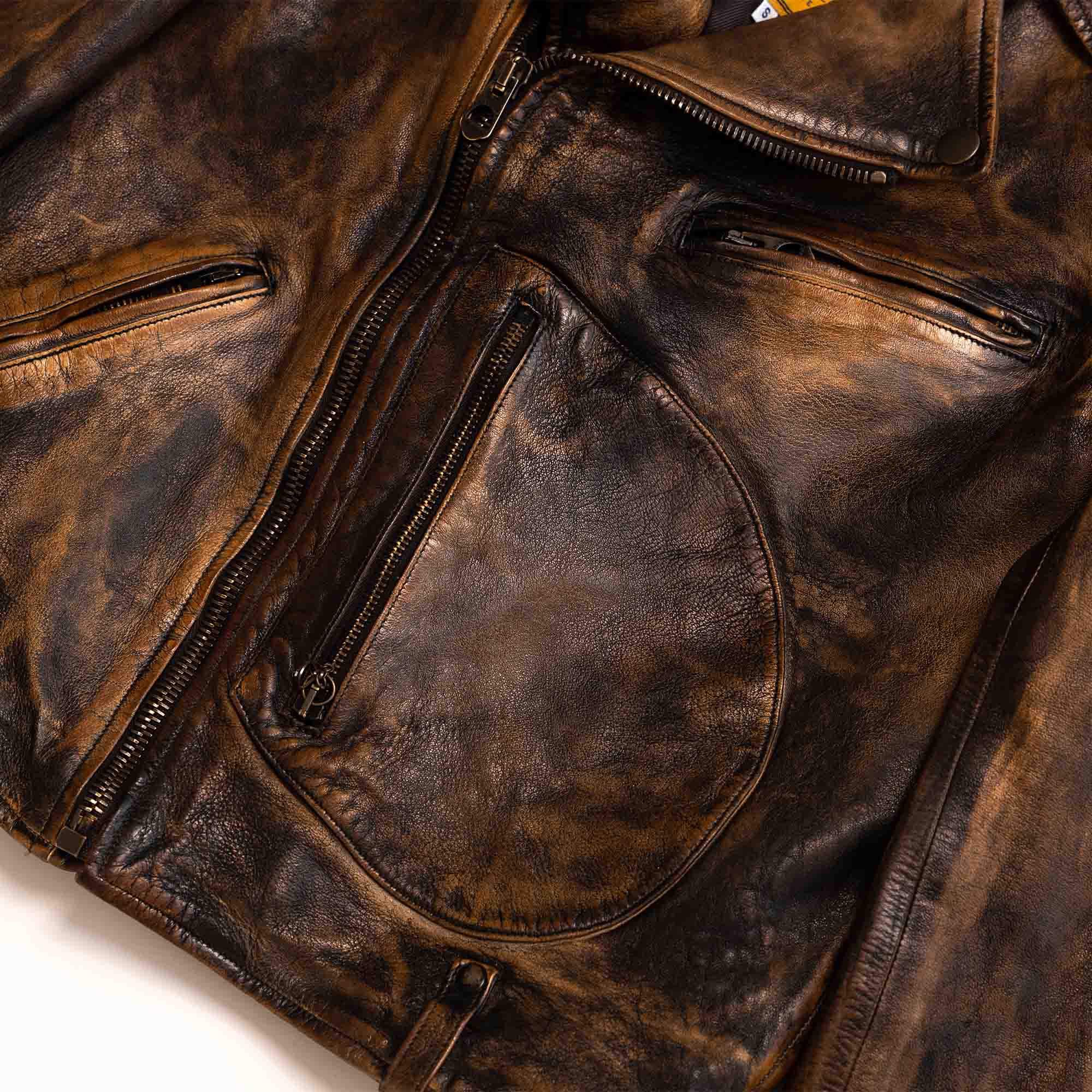 A double-breasted front provides an additional layer of protection to the chest, with a storm flap designed to keep water away from the body, protecting every Rider on the Storm. The most distinctive feature of the jacket, however, remains the legendary D-Pocket, also known as the “Gun,” or “Map” pocket.