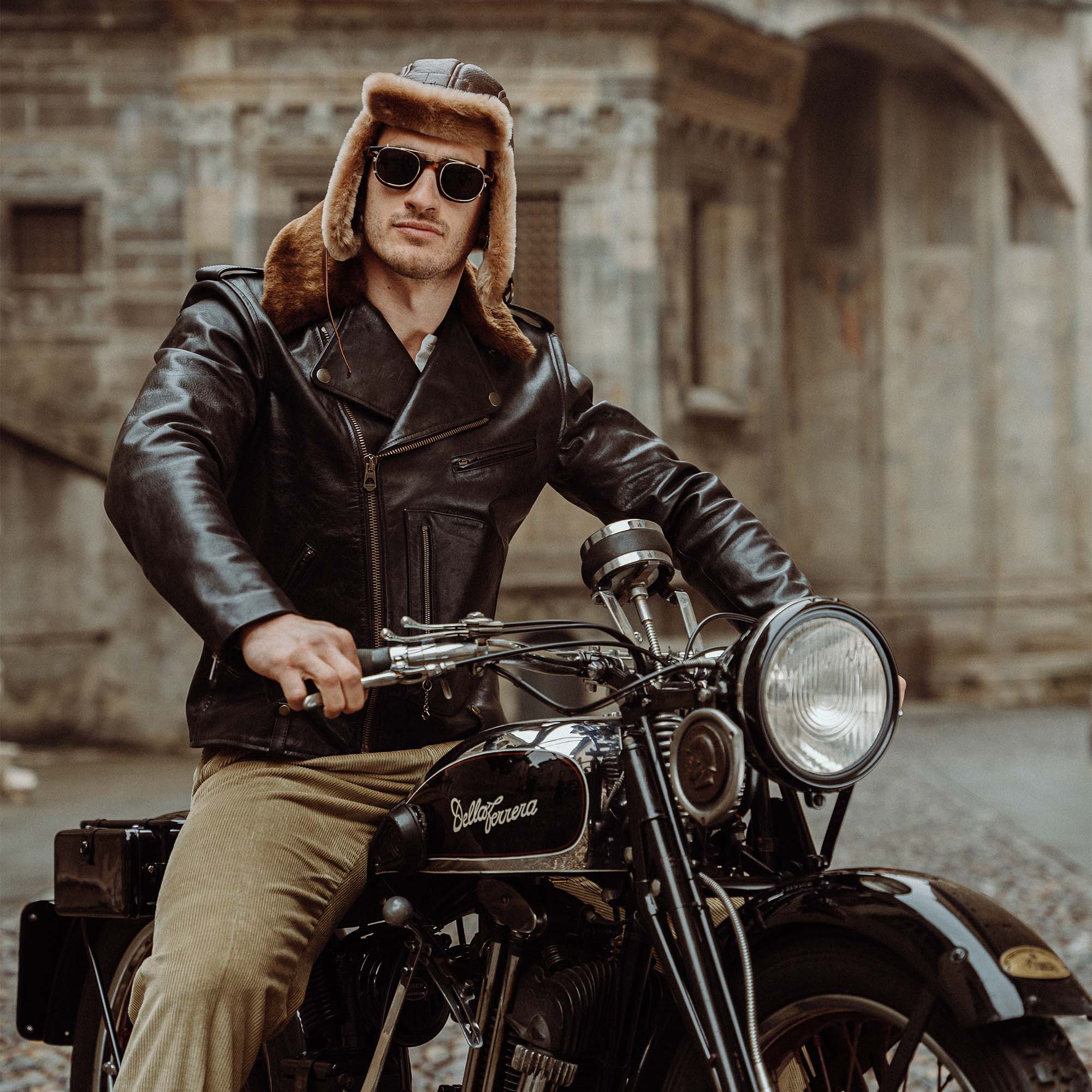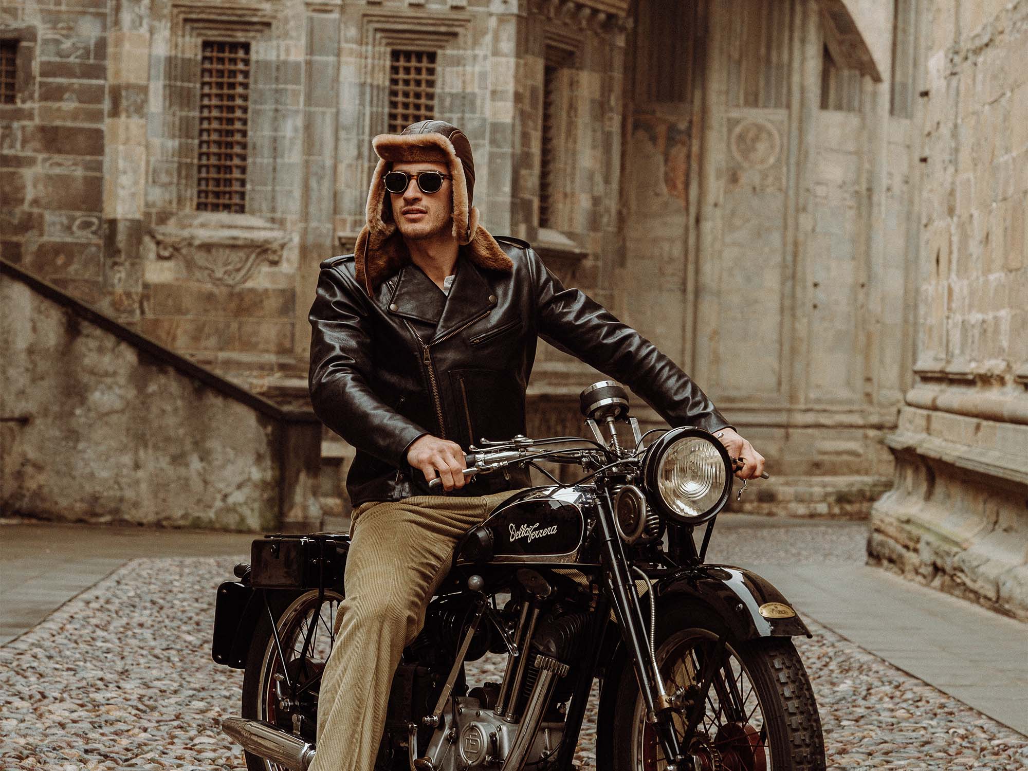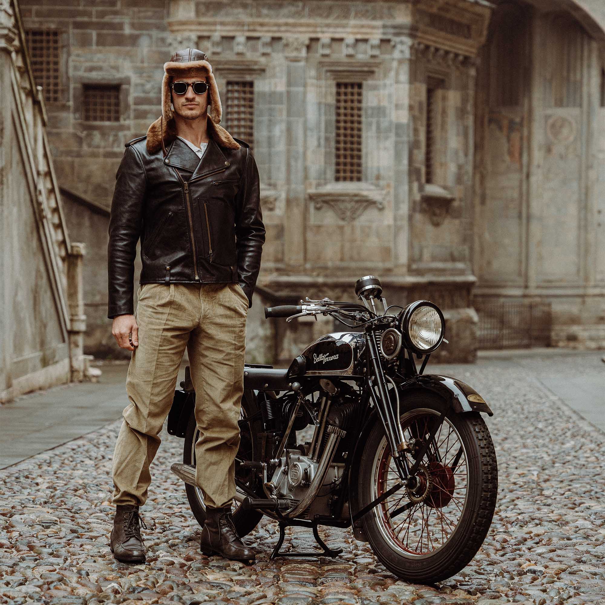 • Paolo (with a 1930s “Della Ferrera” 500cc in Piazza Vecchia in the Old Town of Bergamo) is 180cm and 80kg and he’s wearing a size L.