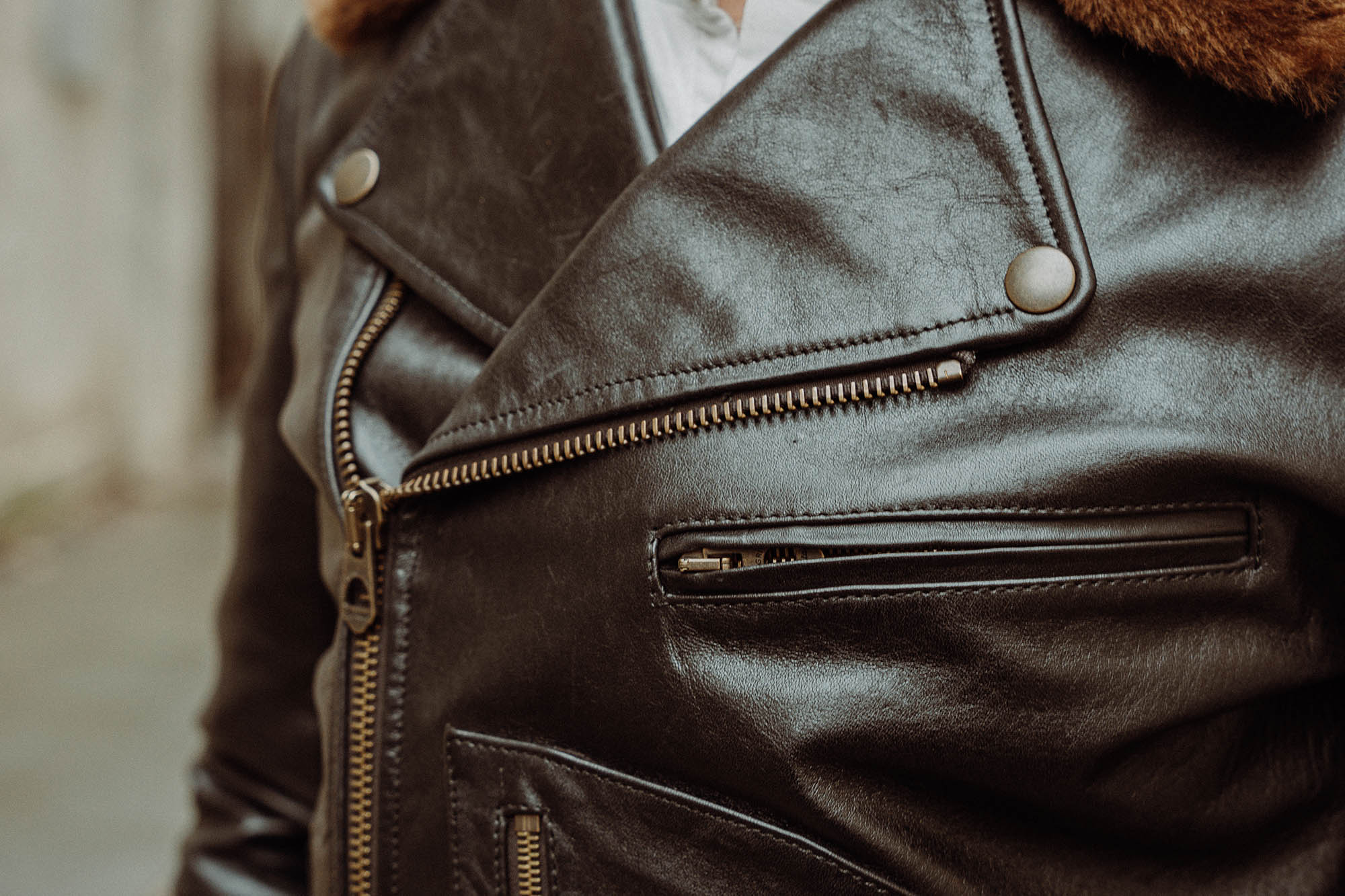 The Full Grain Horsehide from Vicenza (Italy) is first grade horsehide with a ton of character and deep richness. It ages beautifully, developing fantastic fades, creases and patina. Thickness is around 1,1mm, making the Chiodo an outstanding and high-end premium jacket.