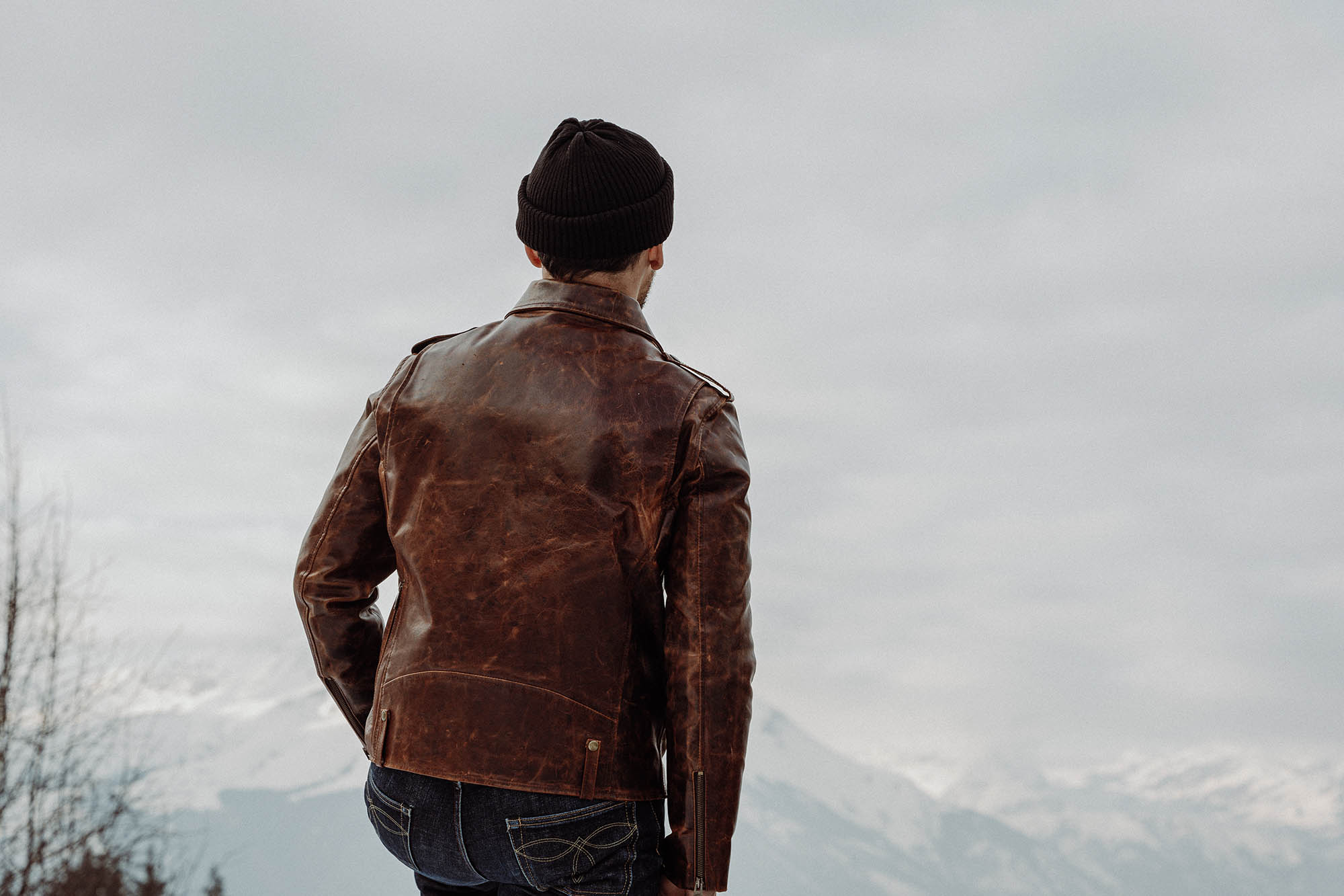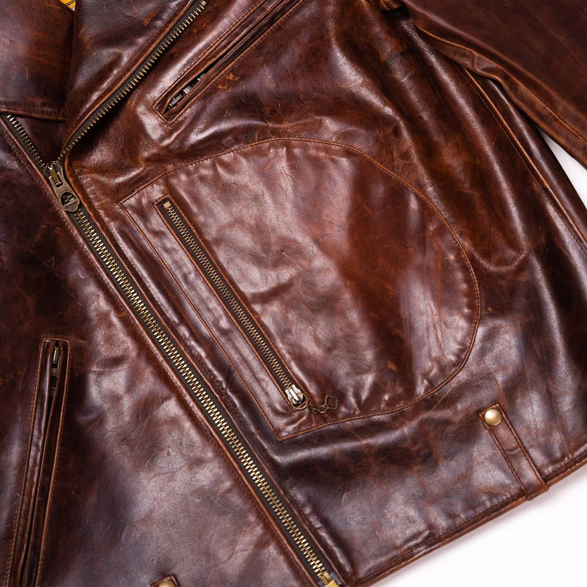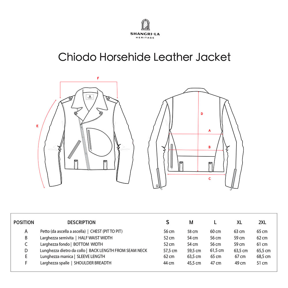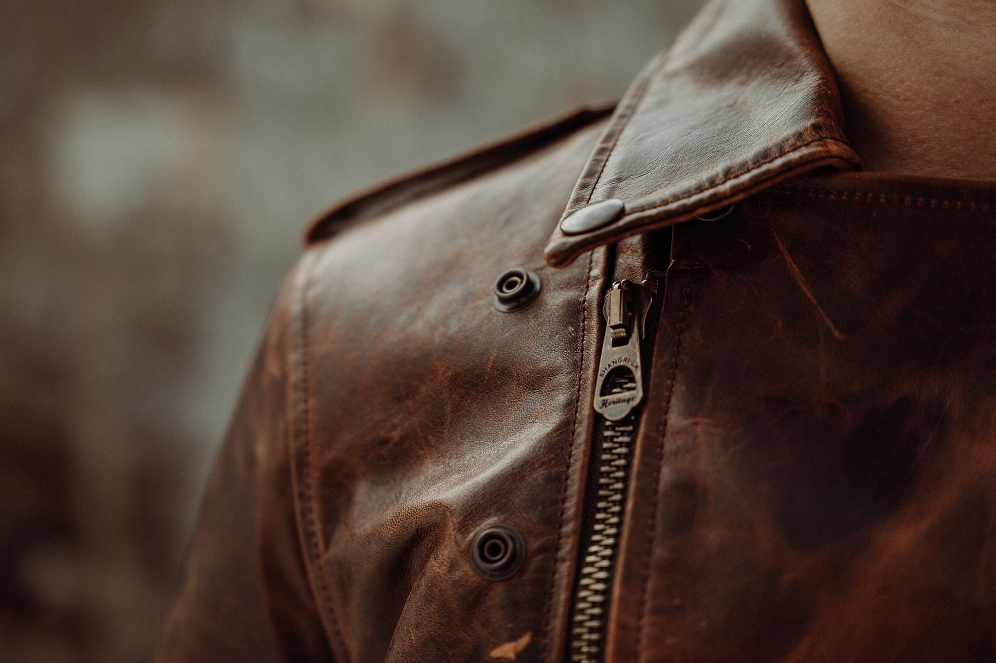 Inspired by 1950s Motorcycle jackets and revisited with a unique Italian touch, the “Chiodo” Whisky Horsehide Leather Jacket represents an authentic garment made of Front Quarter Pull-up Horsehide by Charles F. Stead, one of the oldest tanneries in the UK (since 1890s in Leeds, United Kingdom).