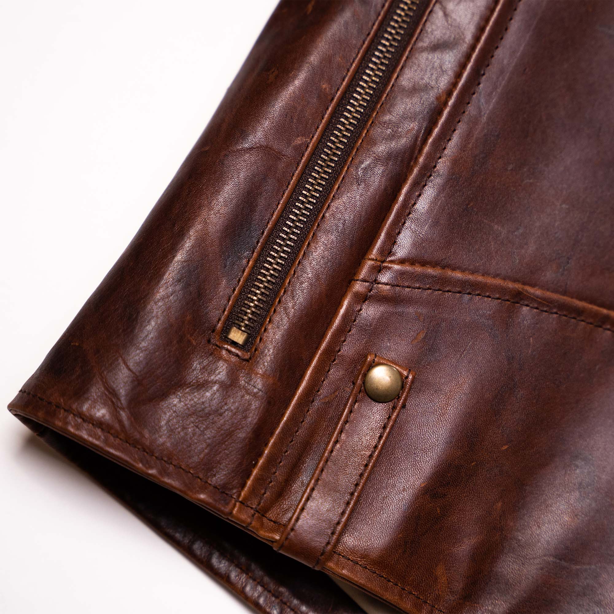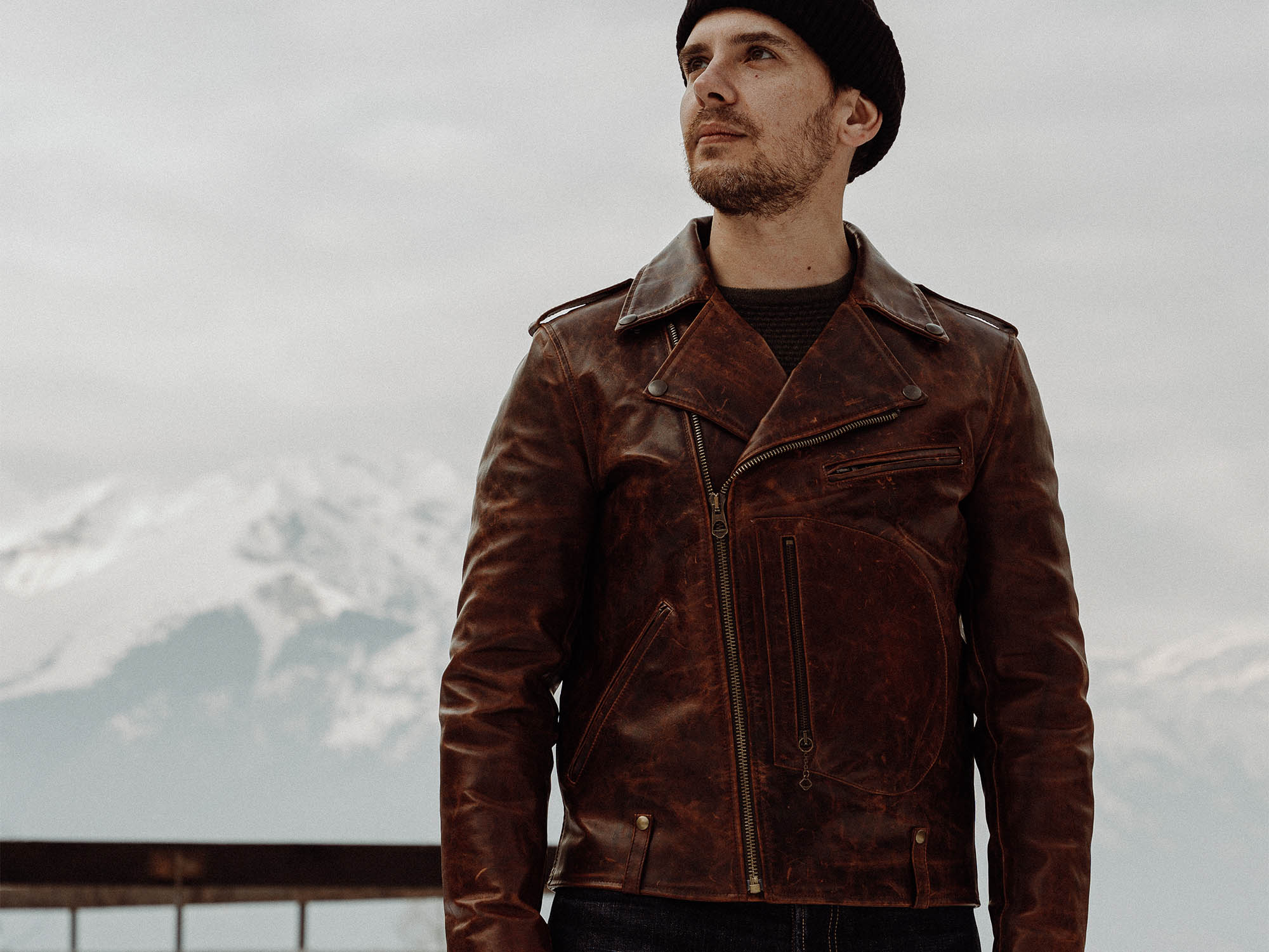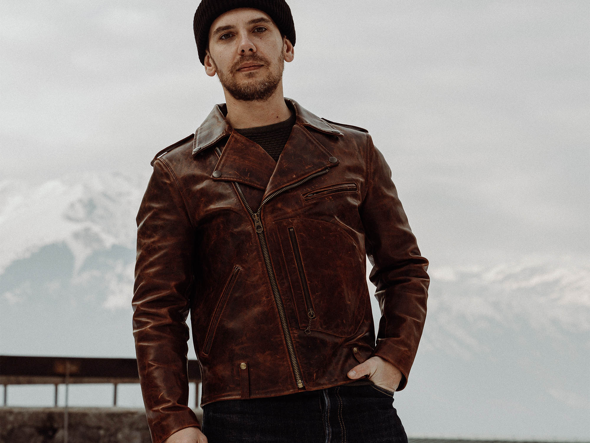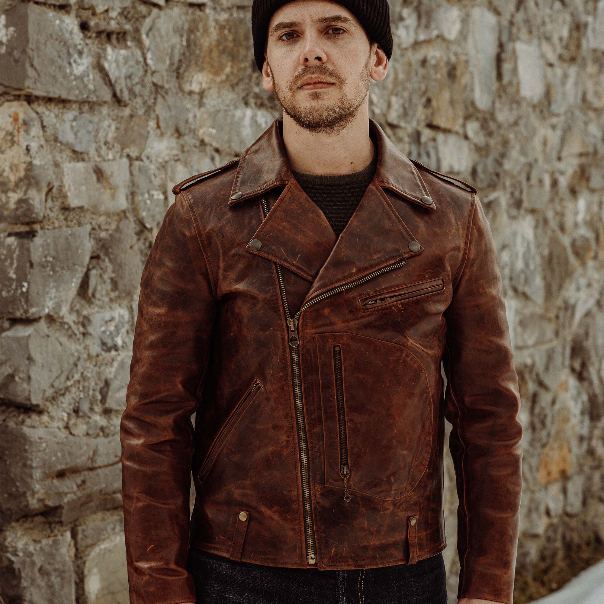 Inspired by 1950s Motorcycle jackets and revisited with a unique Italian touch, the “Chiodo” Whisky Horsehide Leather Jacket represents an authentic garment made of Front Quarter Pull-up Horsehide by Charles F. Stead, one of the oldest tanneries in the UK (since 1890s in Leeds, United Kingdom).