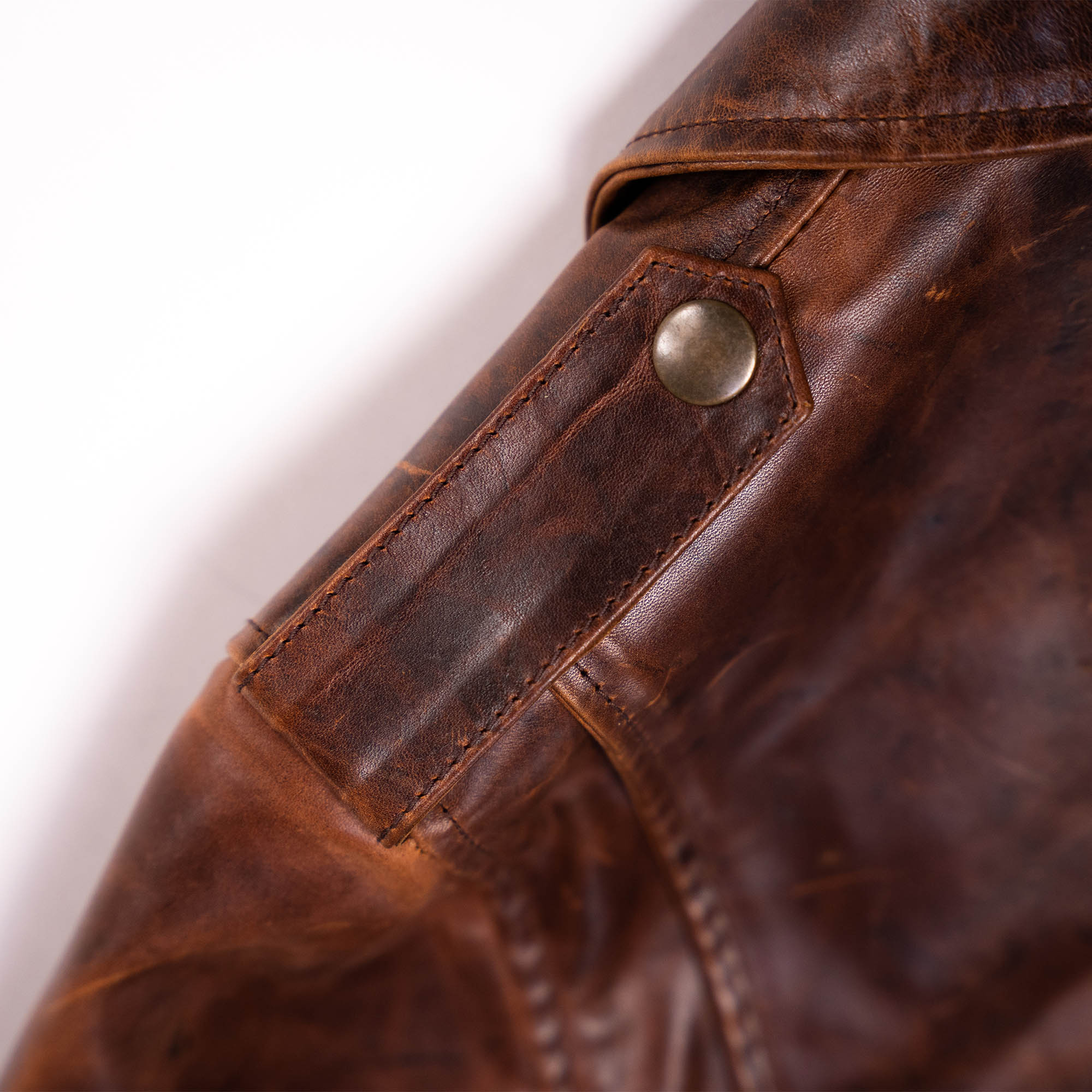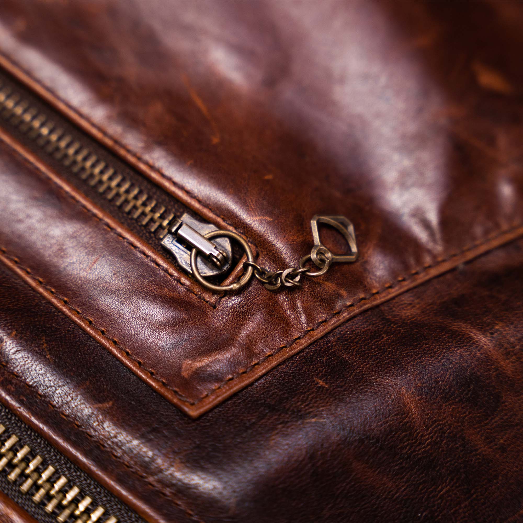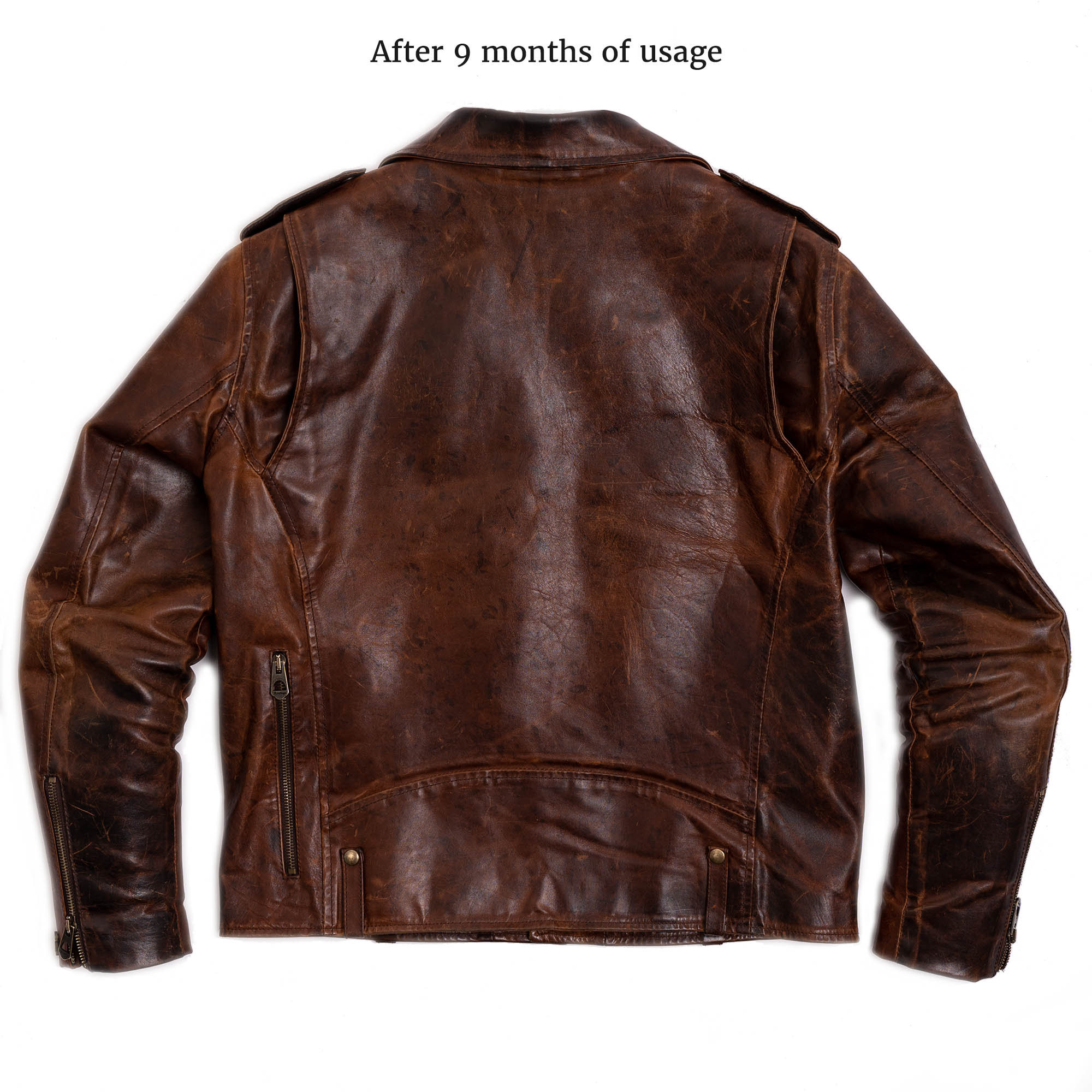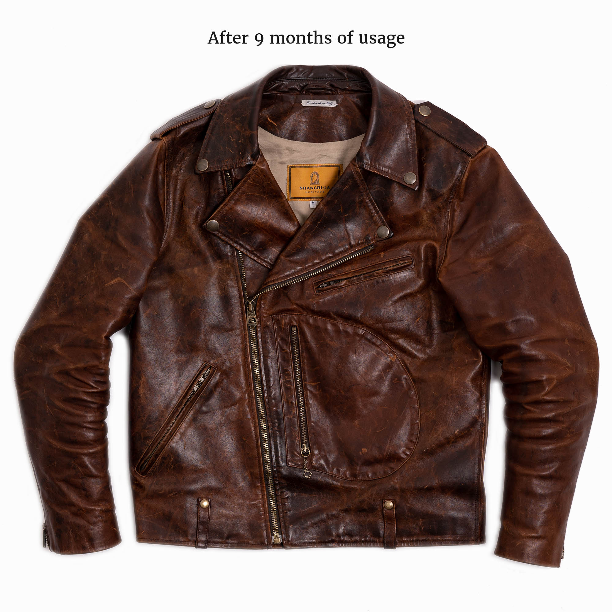 Inspired by 1950s Motorcycle jackets and revisited with a unique Italian touch, the “Chiodo” Whisky Horsehide Leather Jacket represents an authentic garment made of Front Quarter Pull-up Horsehide by Charles F. Stead, one of the oldest tanneries in the UK (since 1890s in Leeds, United Kingdom).