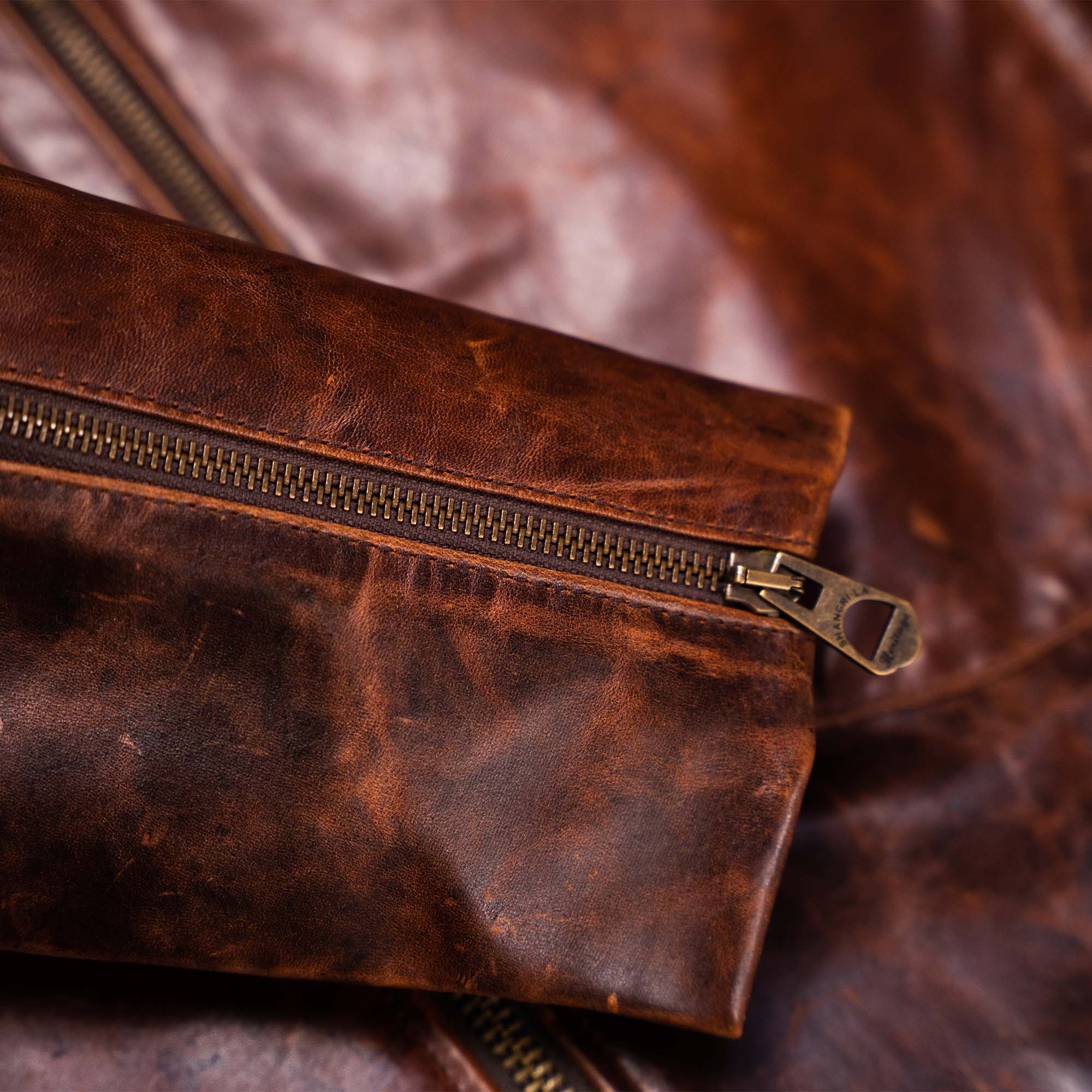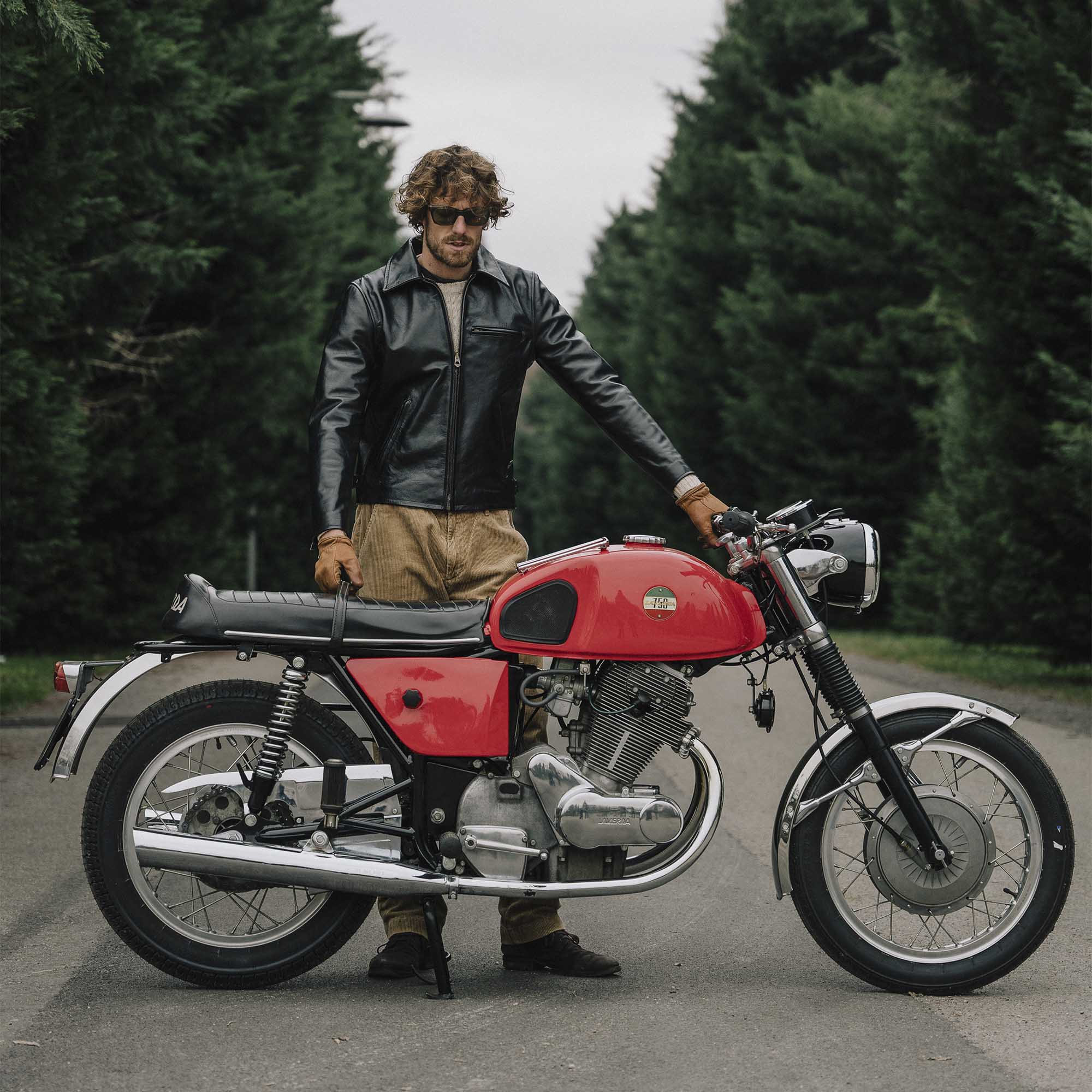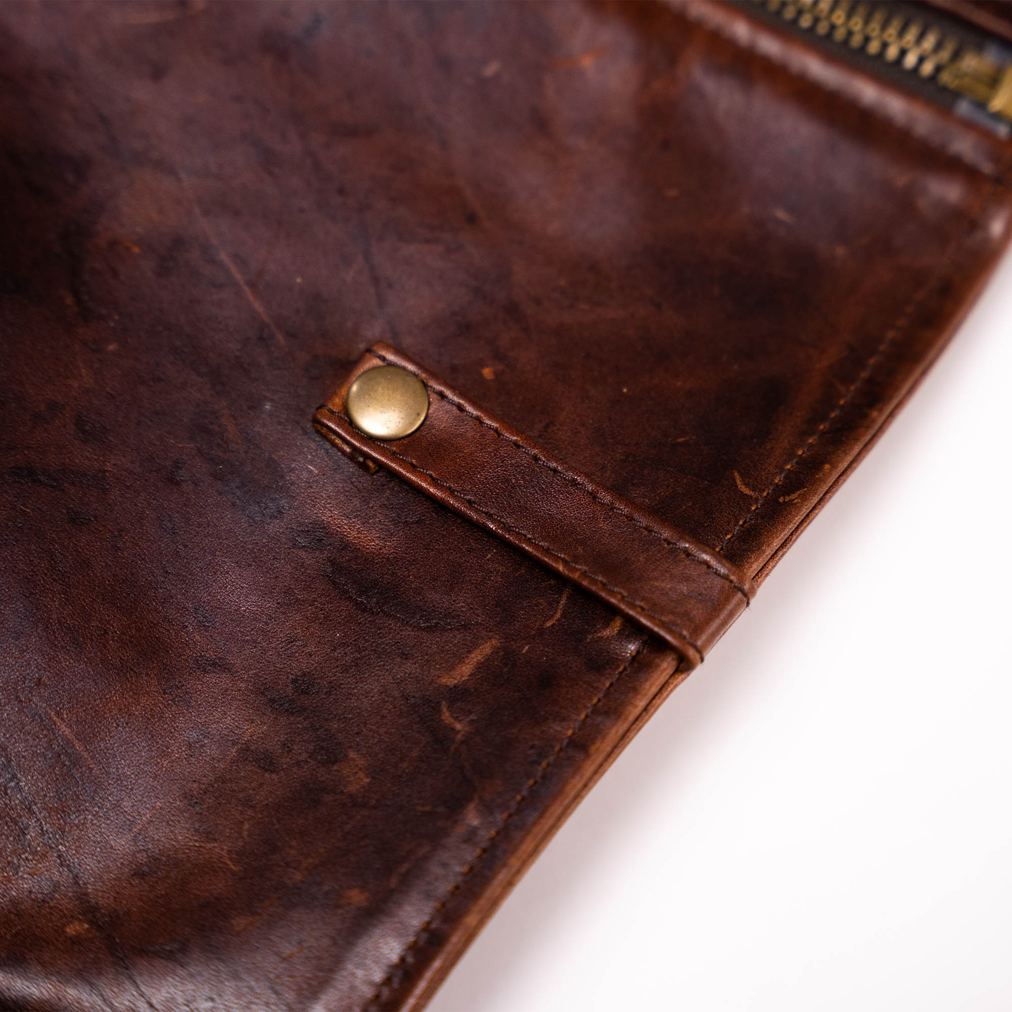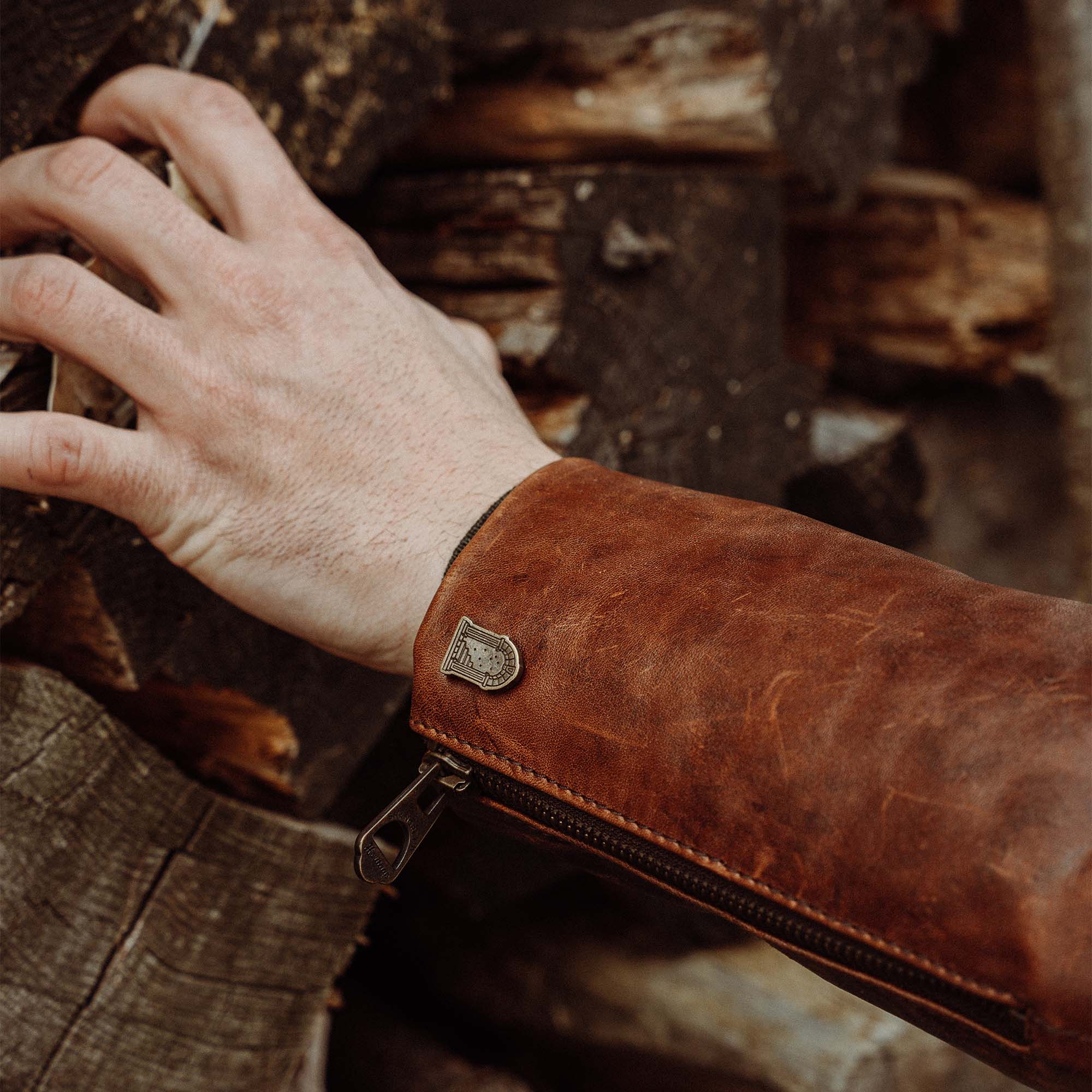 Inspired by 1950s Motorcycle jackets and revisited with a unique Italian touch, the “Chiodo” Whisky Horsehide Leather Jacket represents an authentic garment made of Front Quarter Pull-up Horsehide by Charles F. Stead, one of the oldest tanneries in the UK (since 1890s in Leeds, United Kingdom).