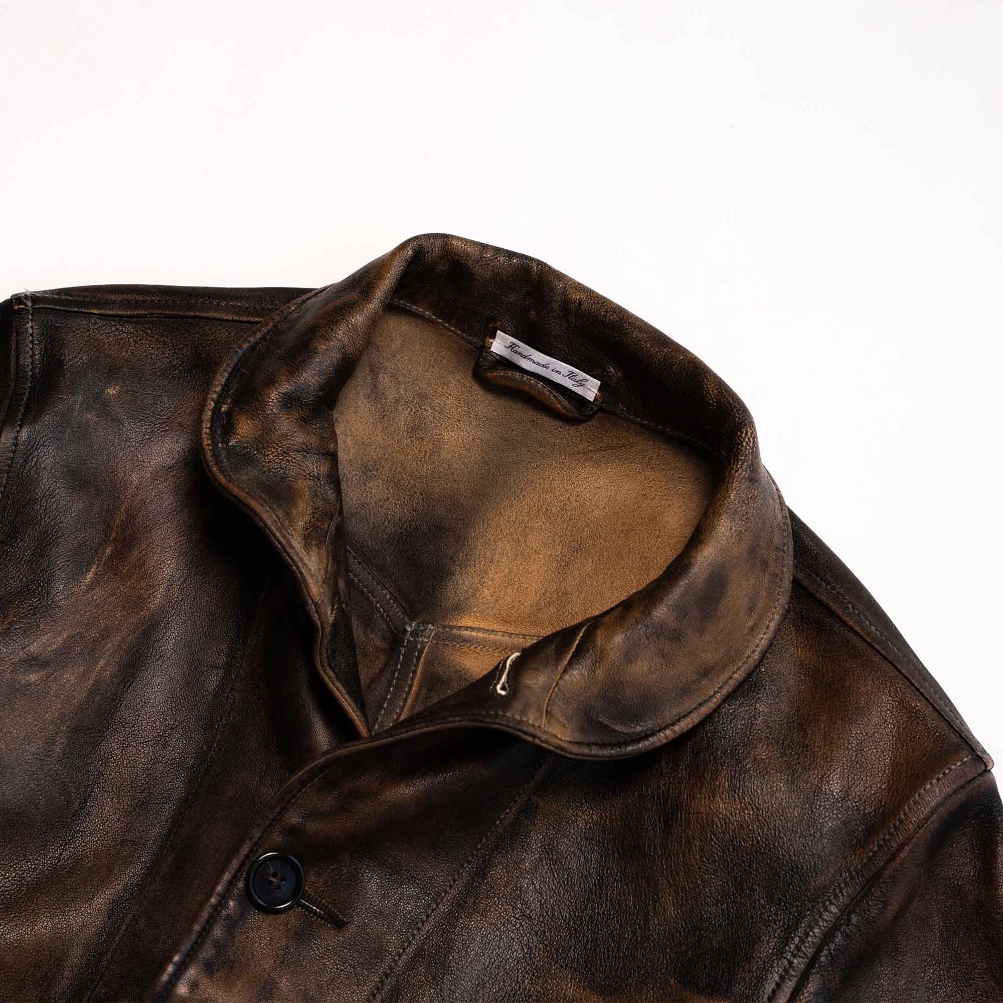 Inspired by late 30s “Cossack” type jackets and revisited with a unique Italian touch, the “Cossack” Deserto Leather Jacket represents an authentic garment made of vegetable tanned full grain Lambskin from Tuscany (Italy) with “Deserto” Treatment.