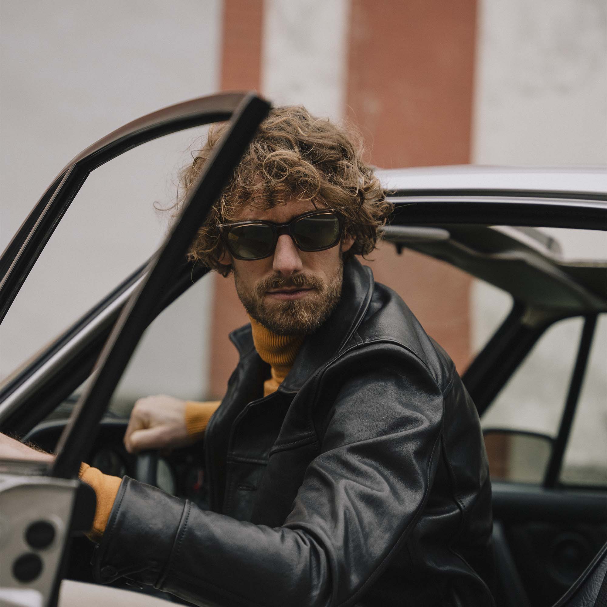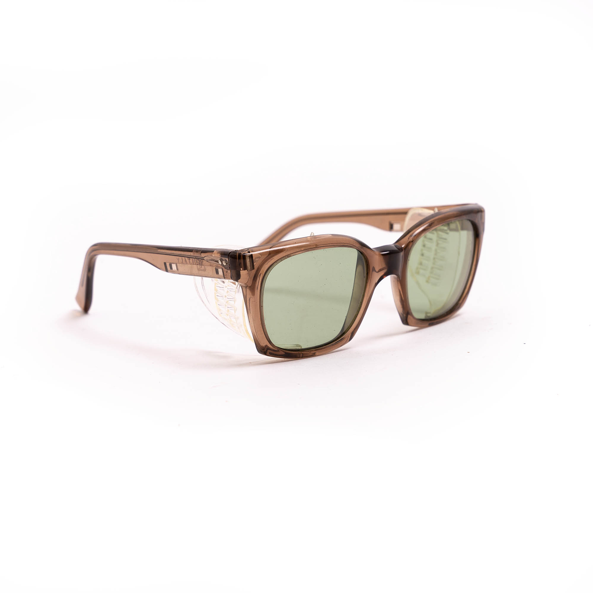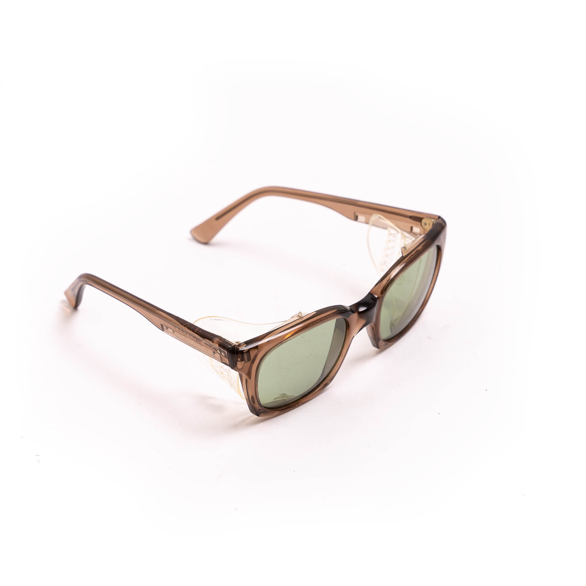 A decisive wide 1970s angular design made in a unique Tobacco color Acetate frame with iconic green color Glass lens, very rare in the market. The shape comes from Italian’s flair for poetic angularity, combined with a solid construction and the special side shields, perfect for wind protection.