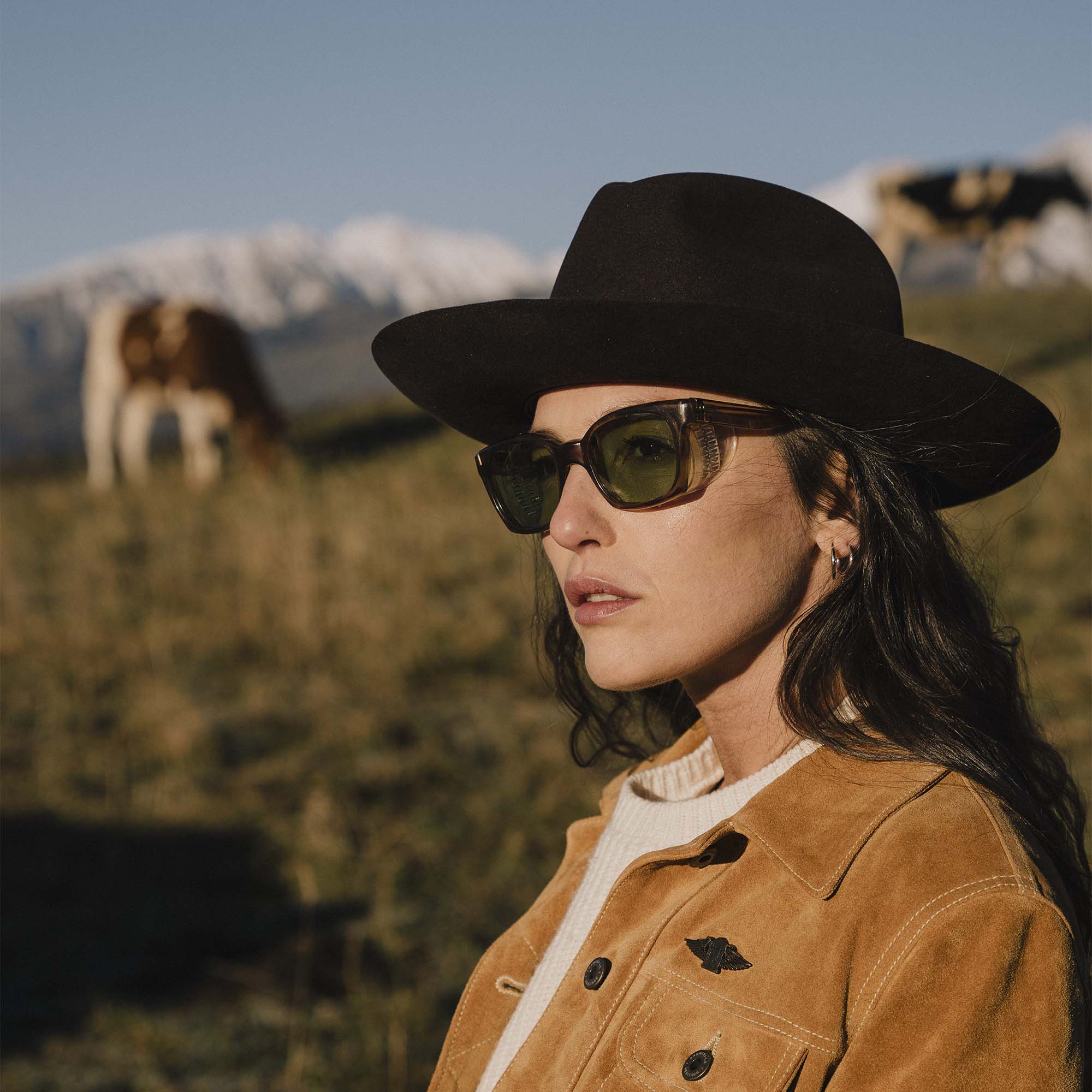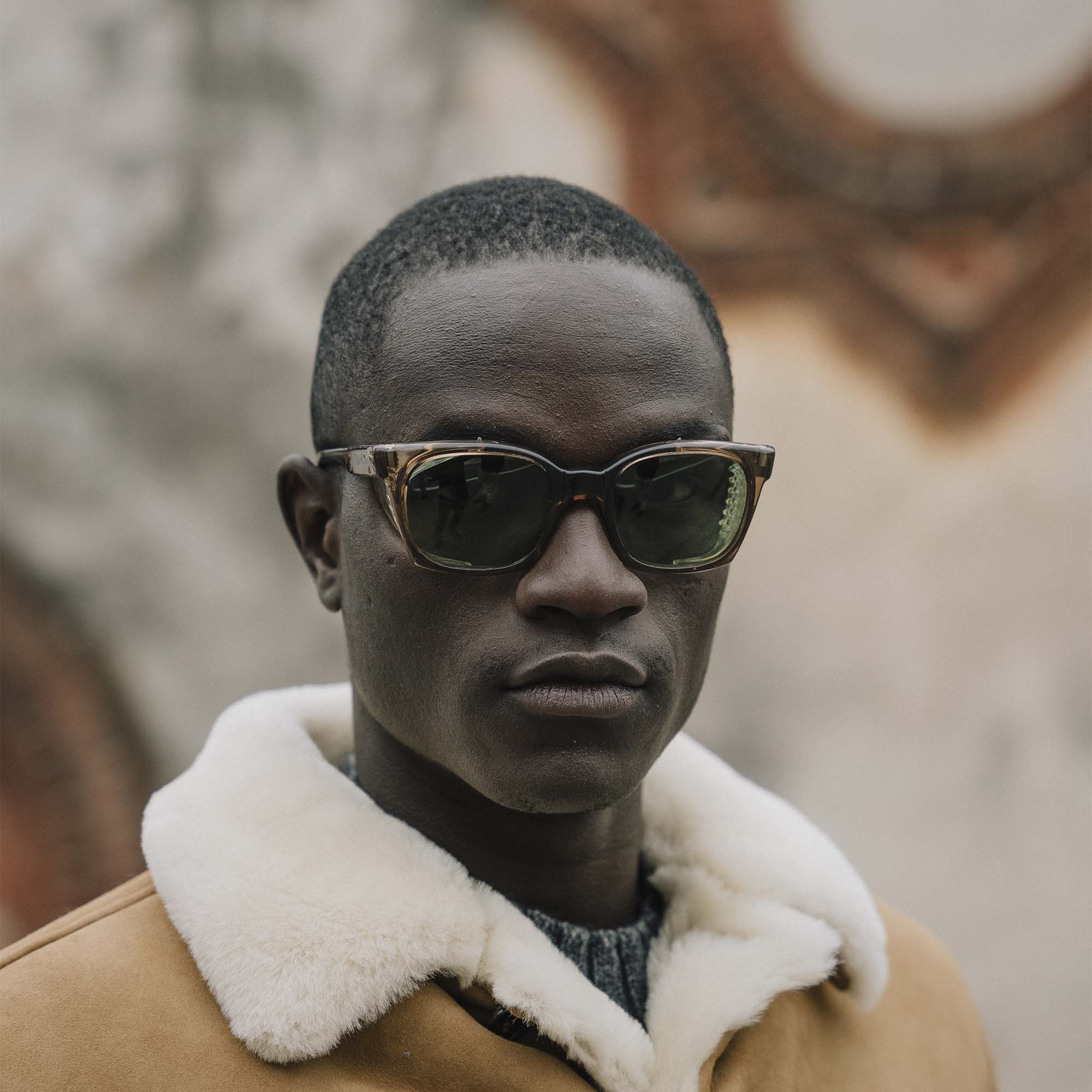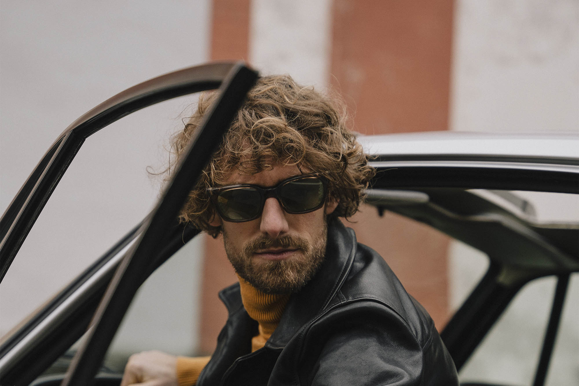 A decisive wide 1970s angular design made in a unique Tobacco color Acetate frame with iconic green color Glass lens, very rare in the market. The shape comes from Italian’s flair for poetic angularity, combined with a solid construction and the special side shields, perfect for wind protection.