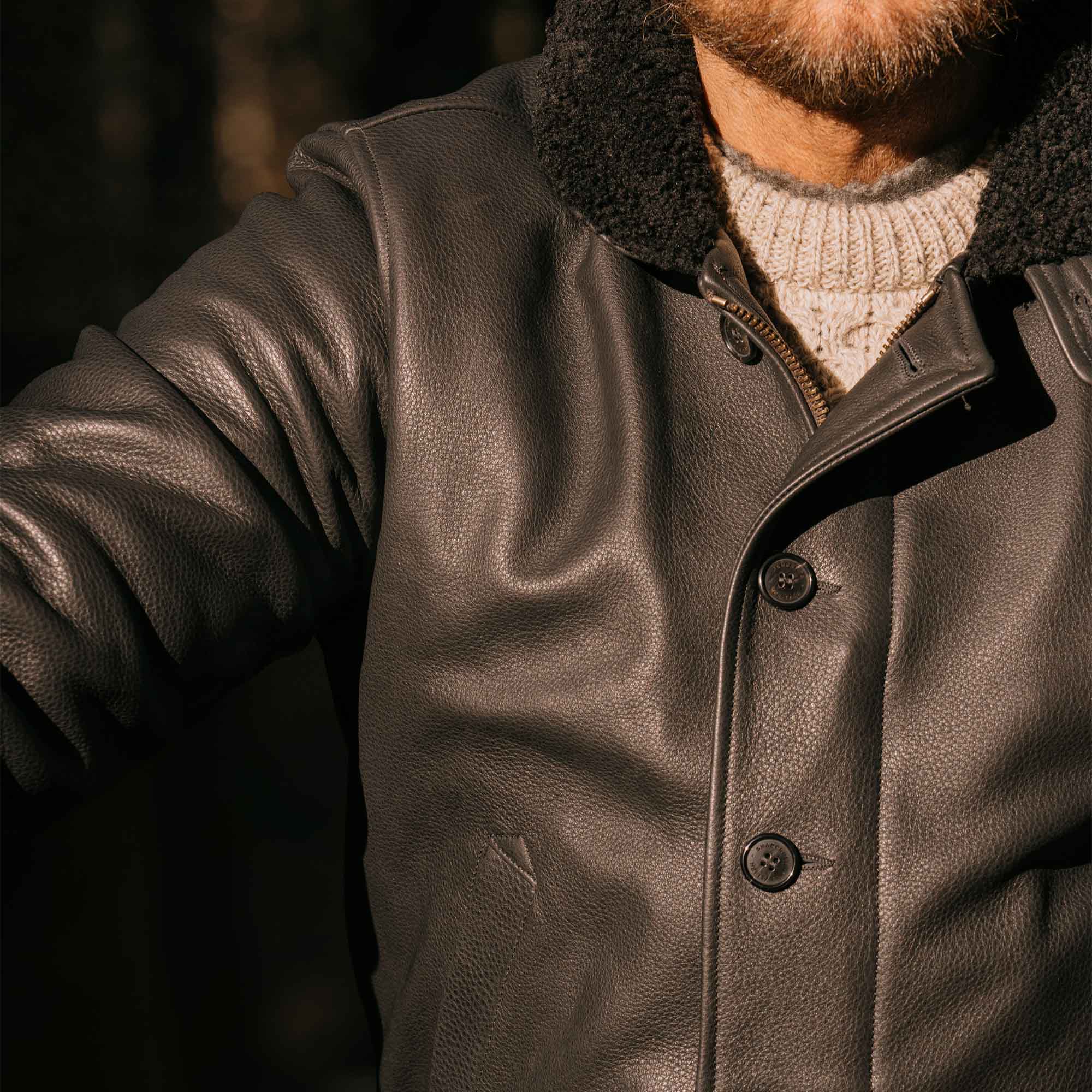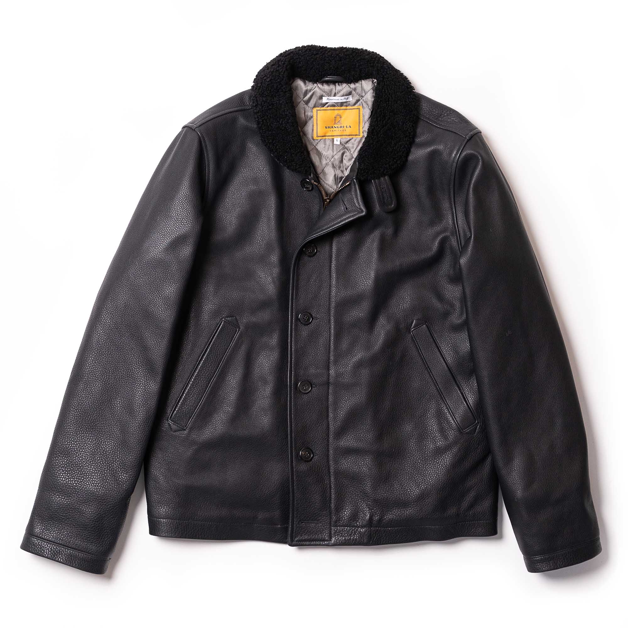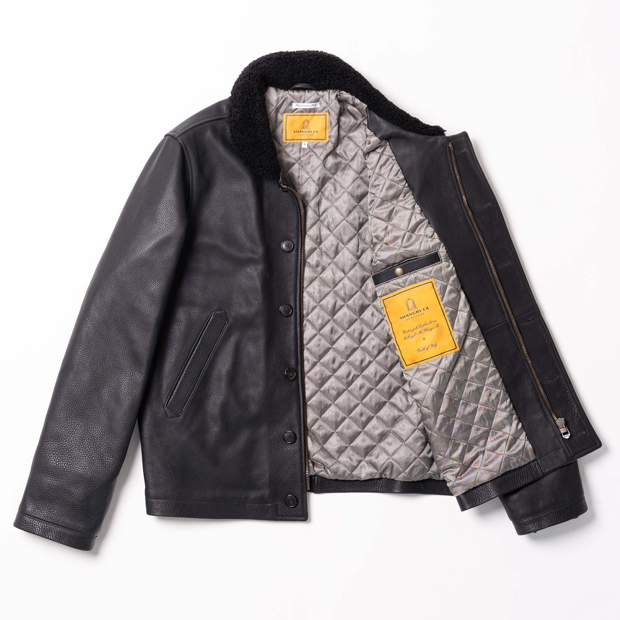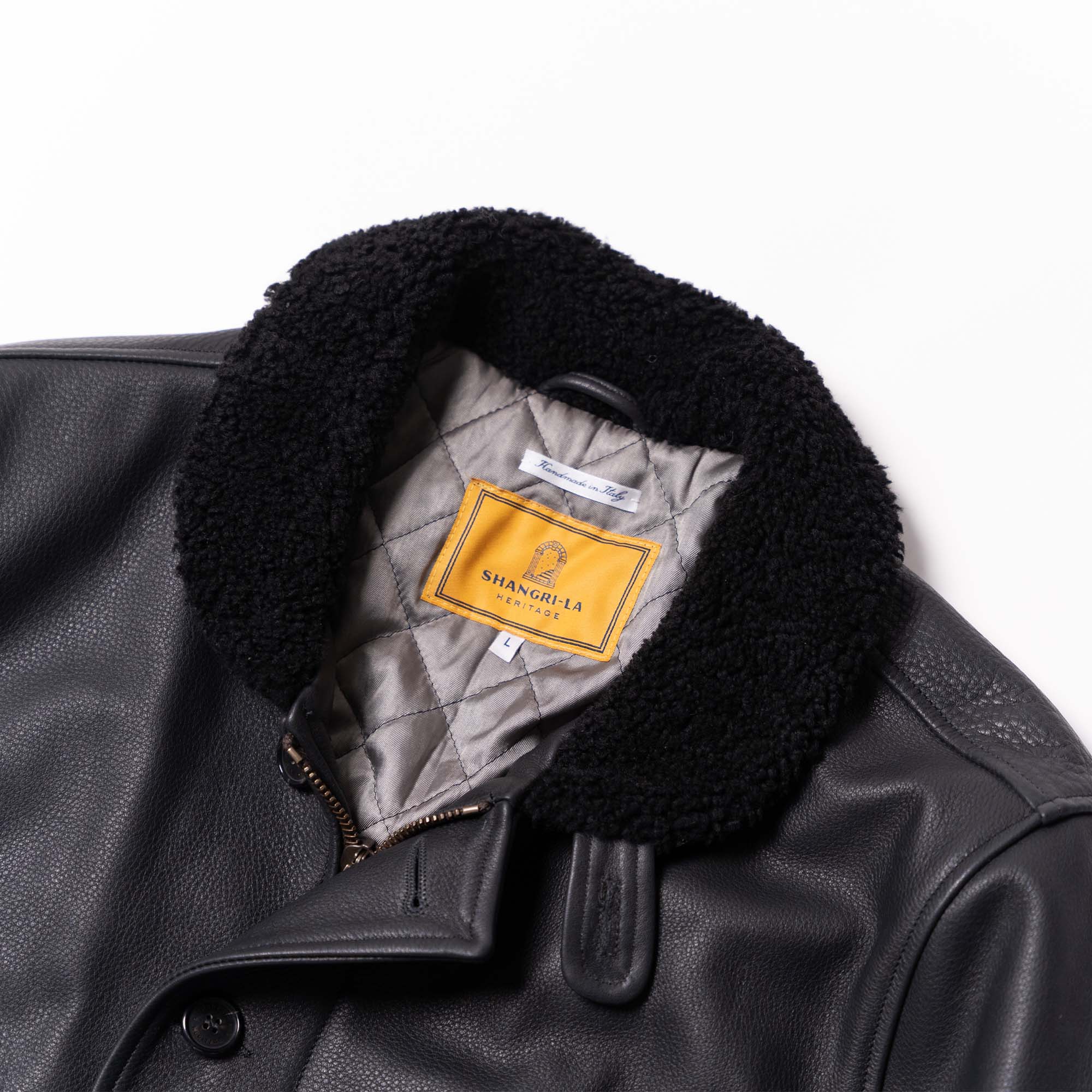 Inspired by early 40s type N-1 Deck jackets from the Second World War and revisited with a unique Italian touch, the “Deck” represents an authentic garment made of Italian Pure Aniline Naked Steerhide from Vicenza (Italy) with Merino Shearling collar.