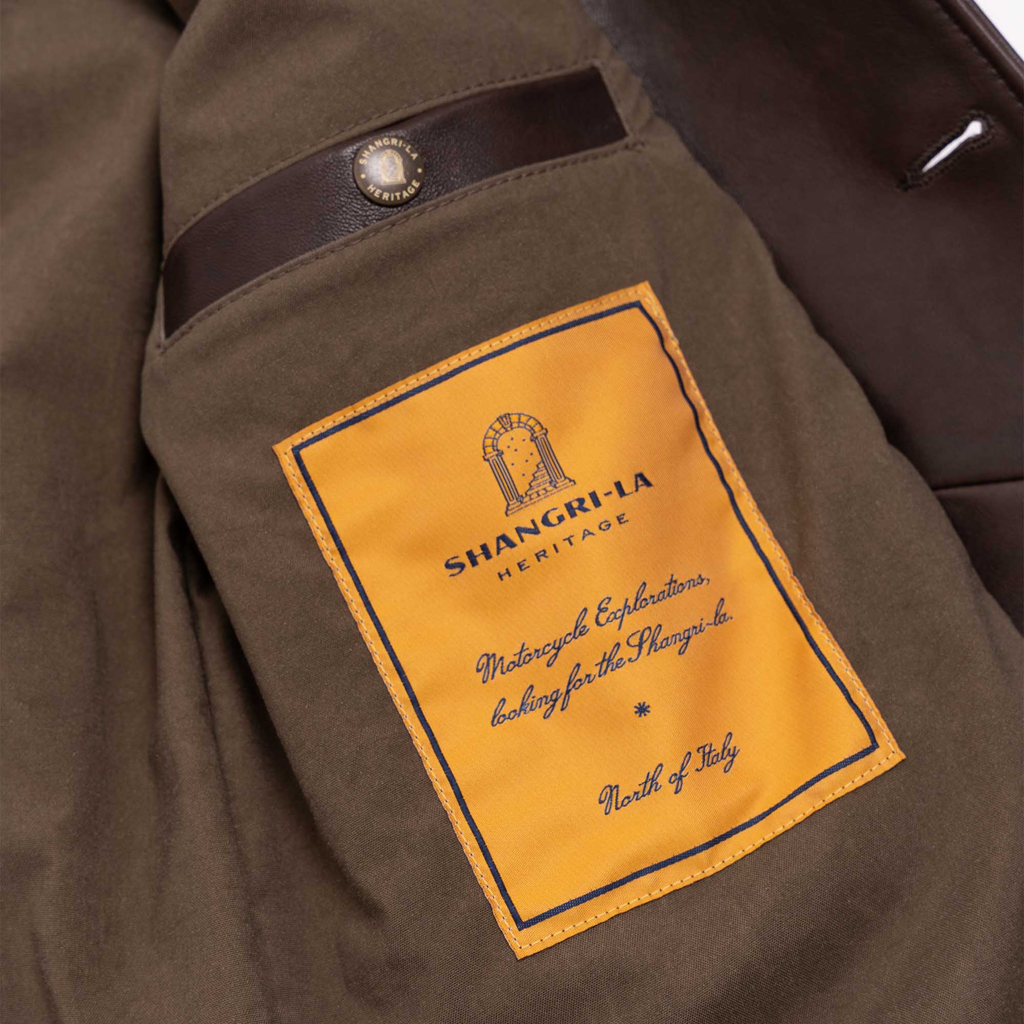 The lining is made of “Forest Green” color cotton, and the leather collar-tab closes the neck to keep you warm during winter and cold trips.