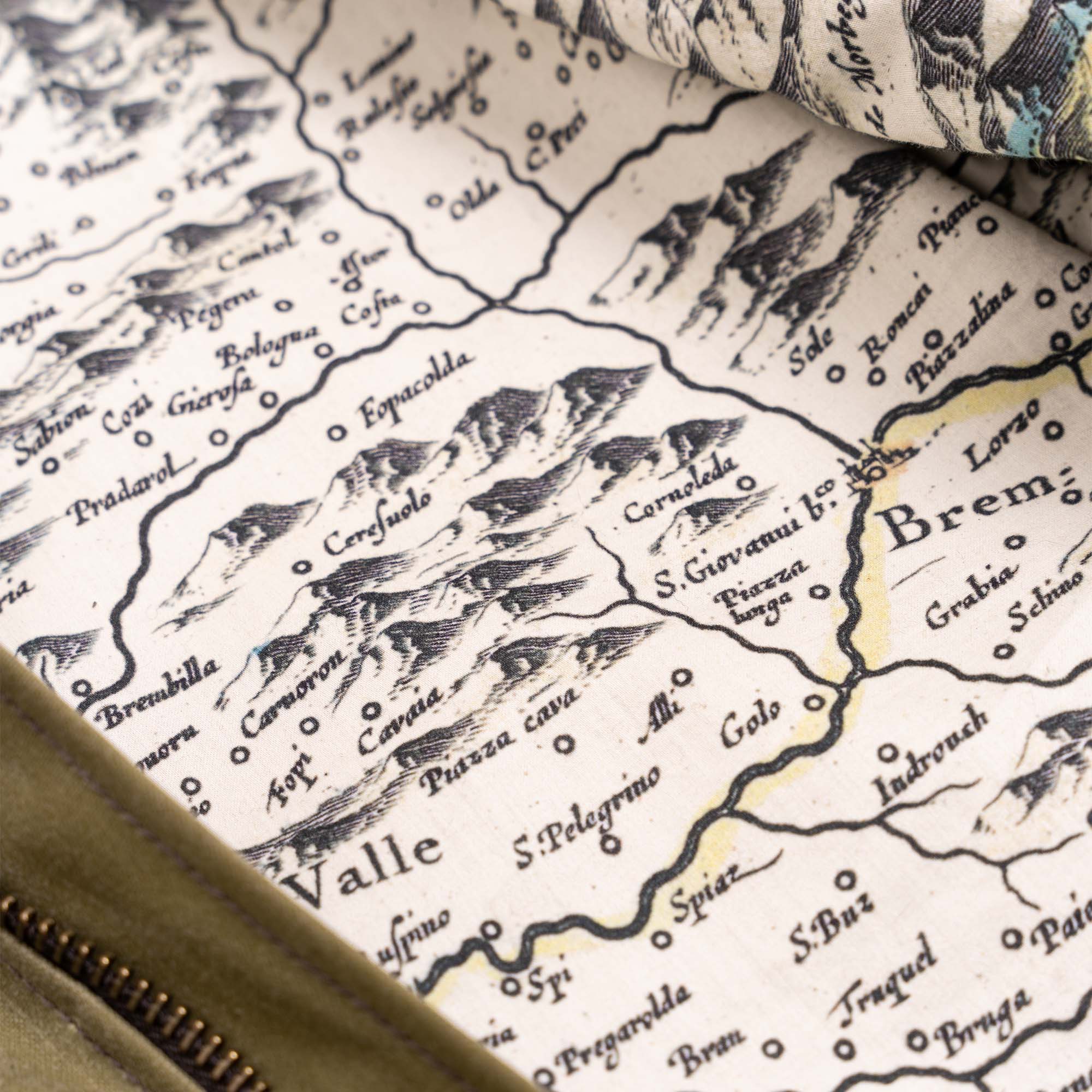 The lining is made of a special Bergamo Map 100% cotton. An Original ancient Map of Bergamo Territory from 17th century found in an old archive, and brought back to life on Cotton. Crafted in Italy in the Como Lake district, the Bergamo Map Cotton Lining has been created to guide the explorers during their trips hunting for unforgettable places and moments, in a nutshell, looking for the Shangri-La.