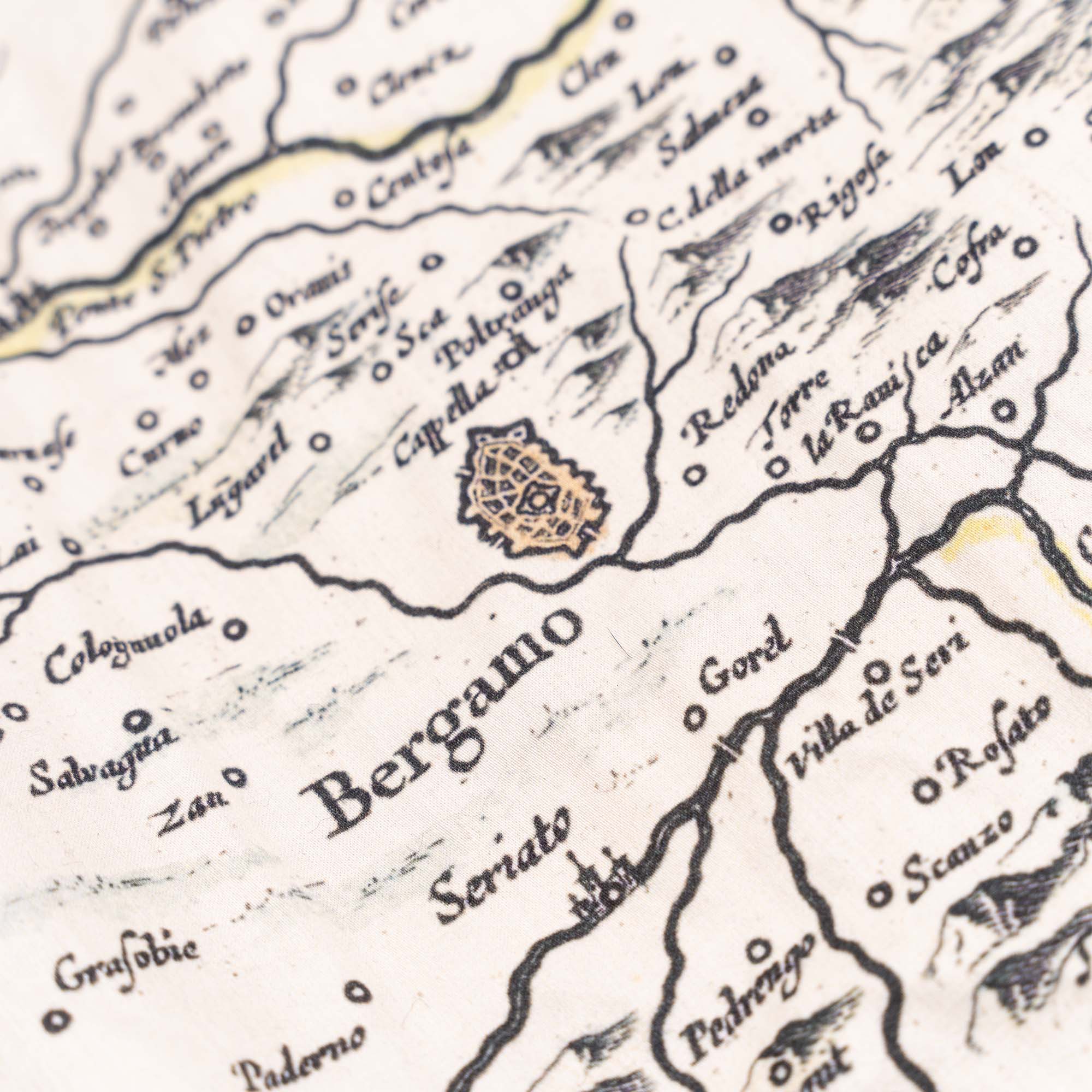 The lining is made of a special Bergamo Map 100% cotton. An Original ancient Map of Bergamo Territory from 17th century found in an old archive, and brought back to life on Cotton. Crafted in Italy in the Como Lake district, the Bergamo Map Cotton Lining has been created to guide the explorers during their trips hunting for unforgettable places and moments, in a nutshell, looking for the Shangri-La.