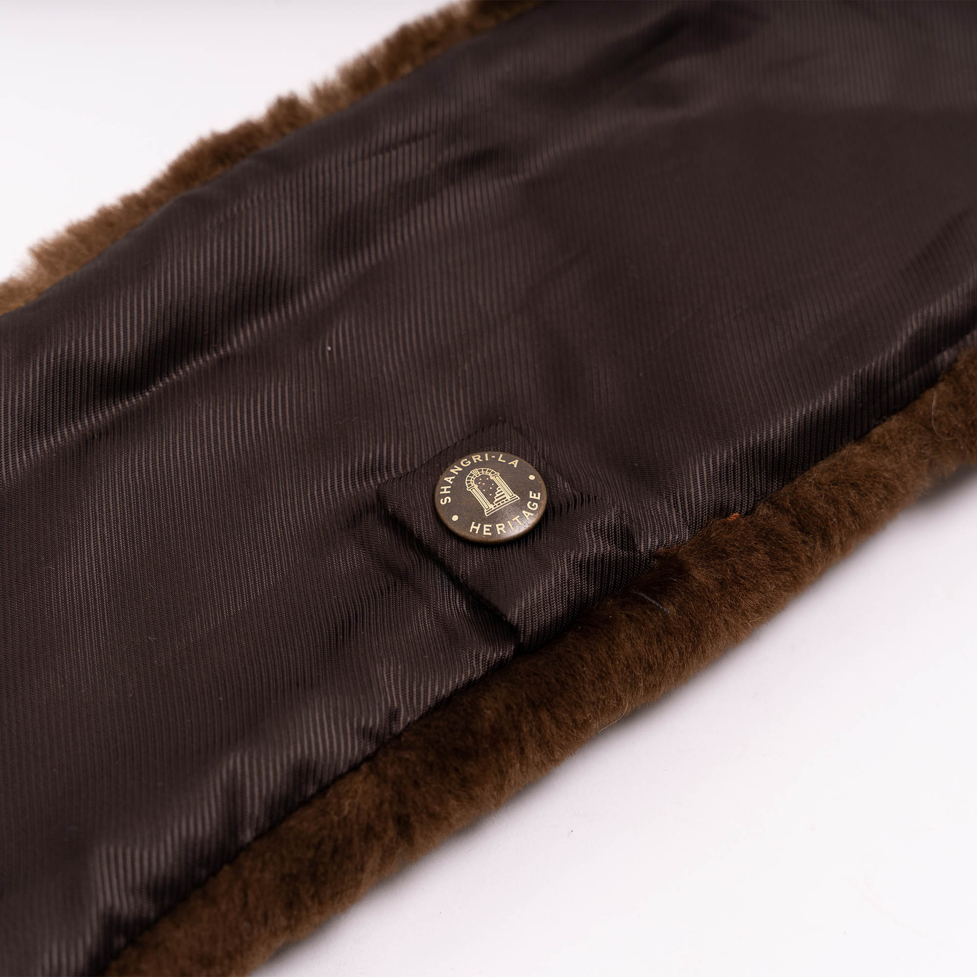 • Antique brass snap button with engraved markings to secure the collar to the hanging loop