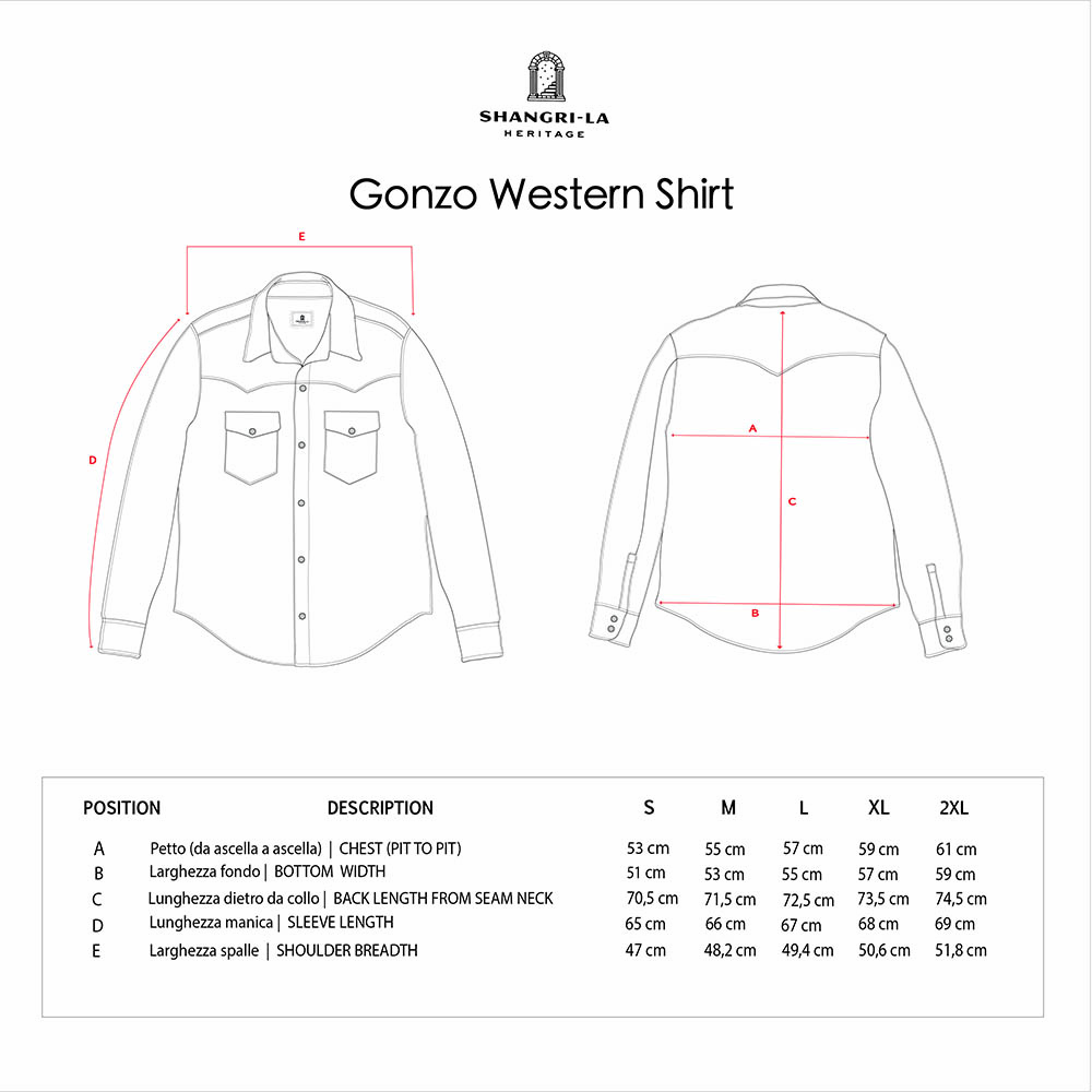 Inspired by early 1960s Western shirts and revisited with a unique Italian touch, the “Gonzo” Cotton Gabardine Western Shirt represents an authentic garment made of a special Cotton Gabardine from Italy.