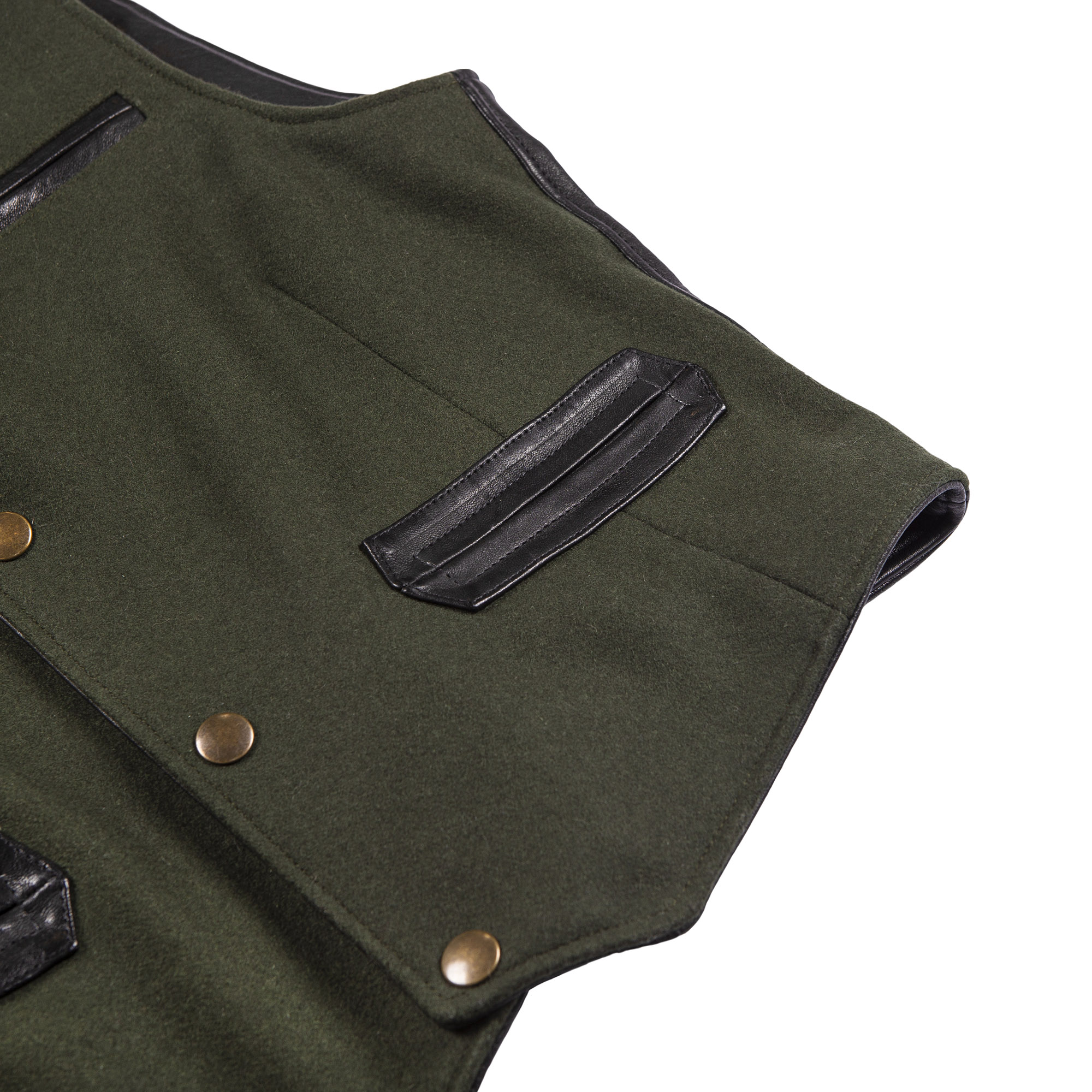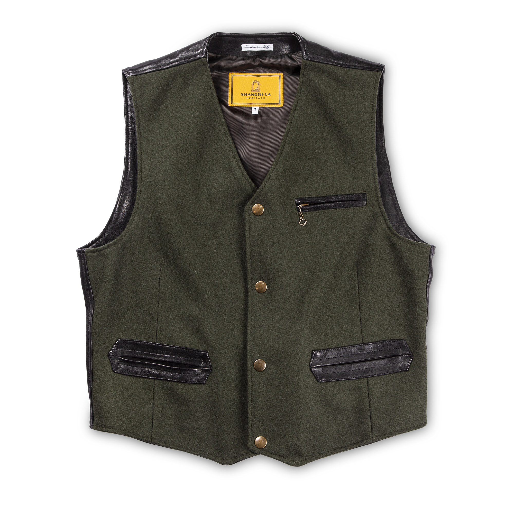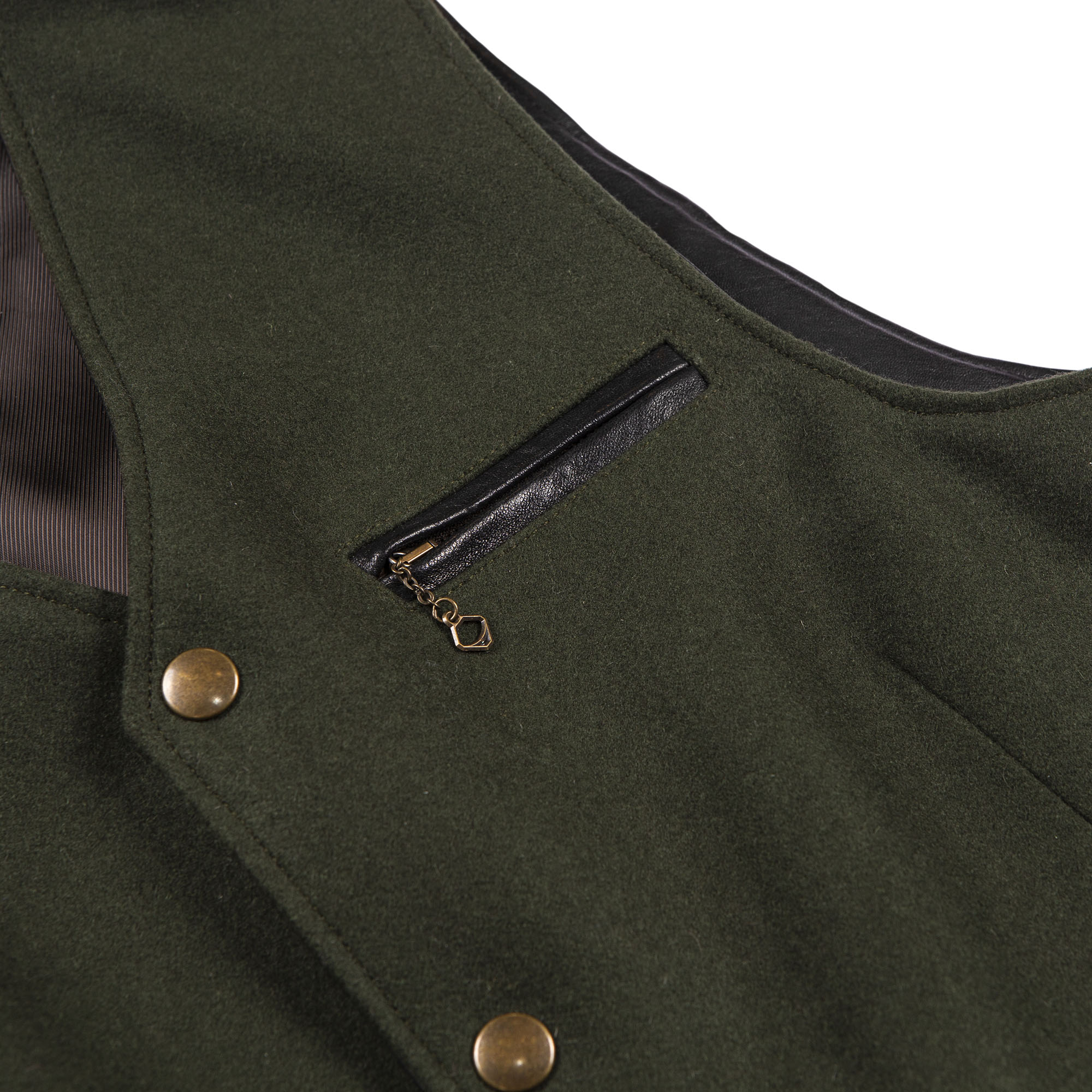 Inspired by late 30s European tailor-made waistcoats and revisited with a unique Italian touch, the “Mandriano” Forest Green represents an authentic garment made of Premium Melton Wool 24 Oz from Tuscany, 90% Wool and 10% Cachemire, on the front and vegetable tanned Lambskin from Tuscany (Italy) on the back and trimmings.