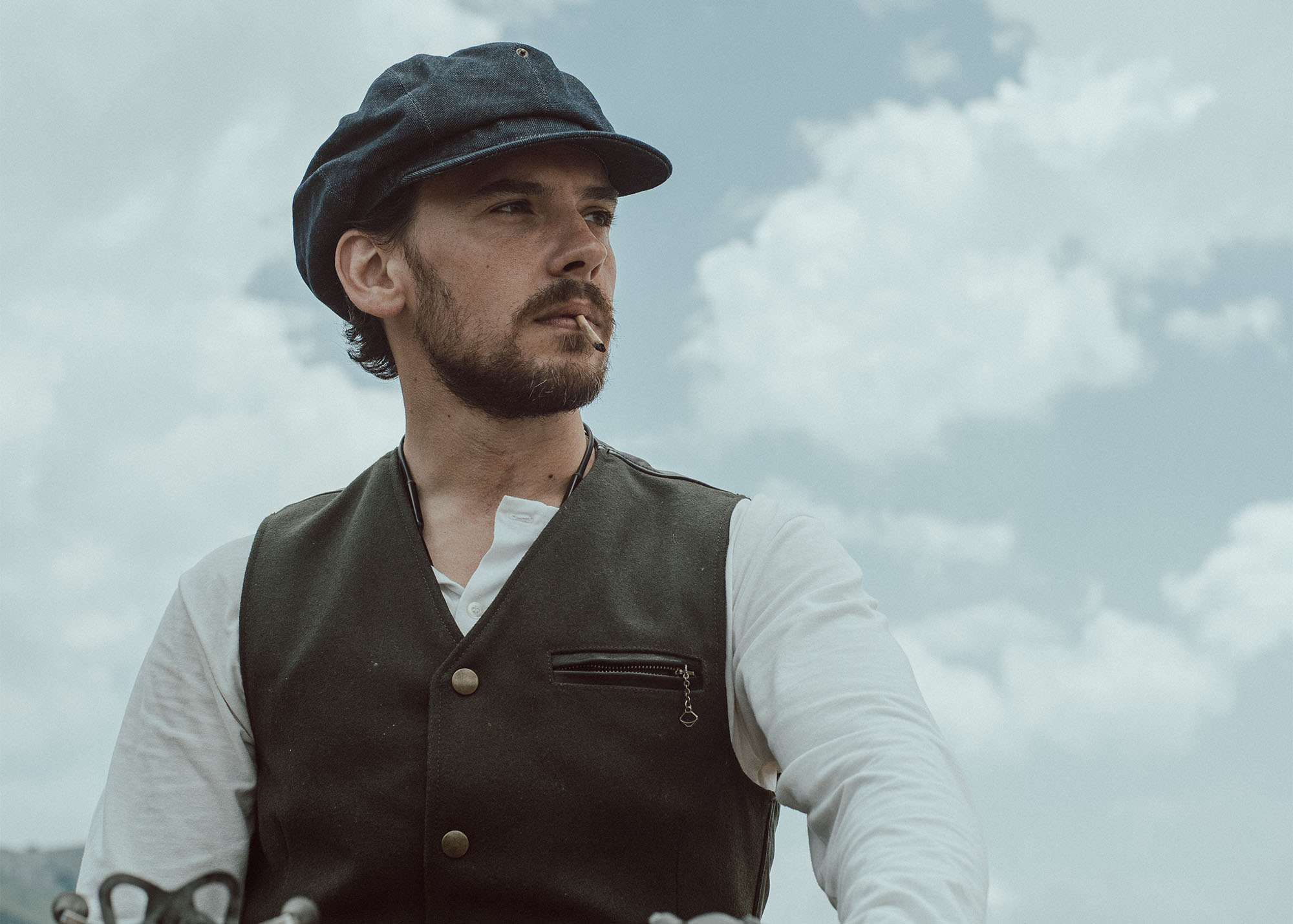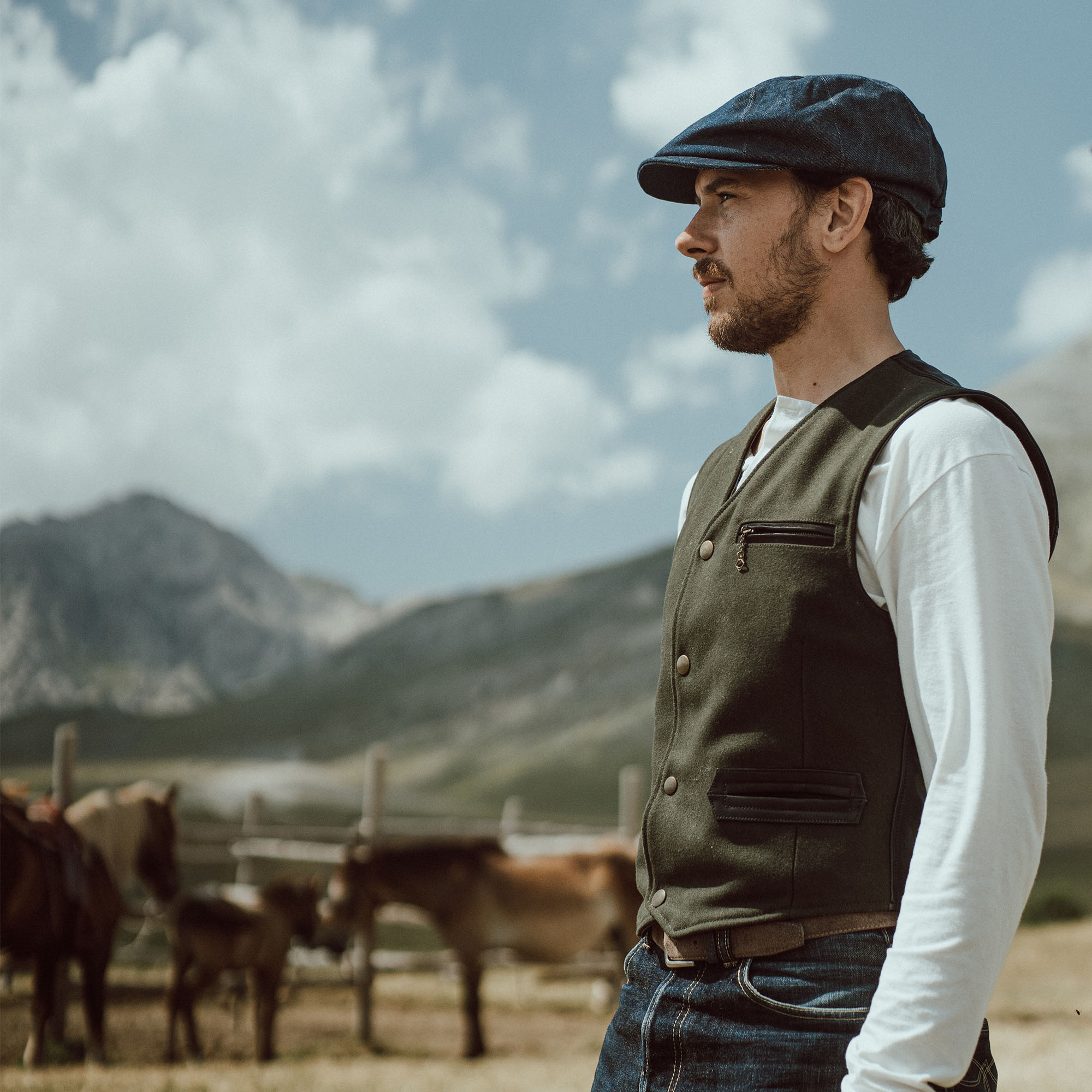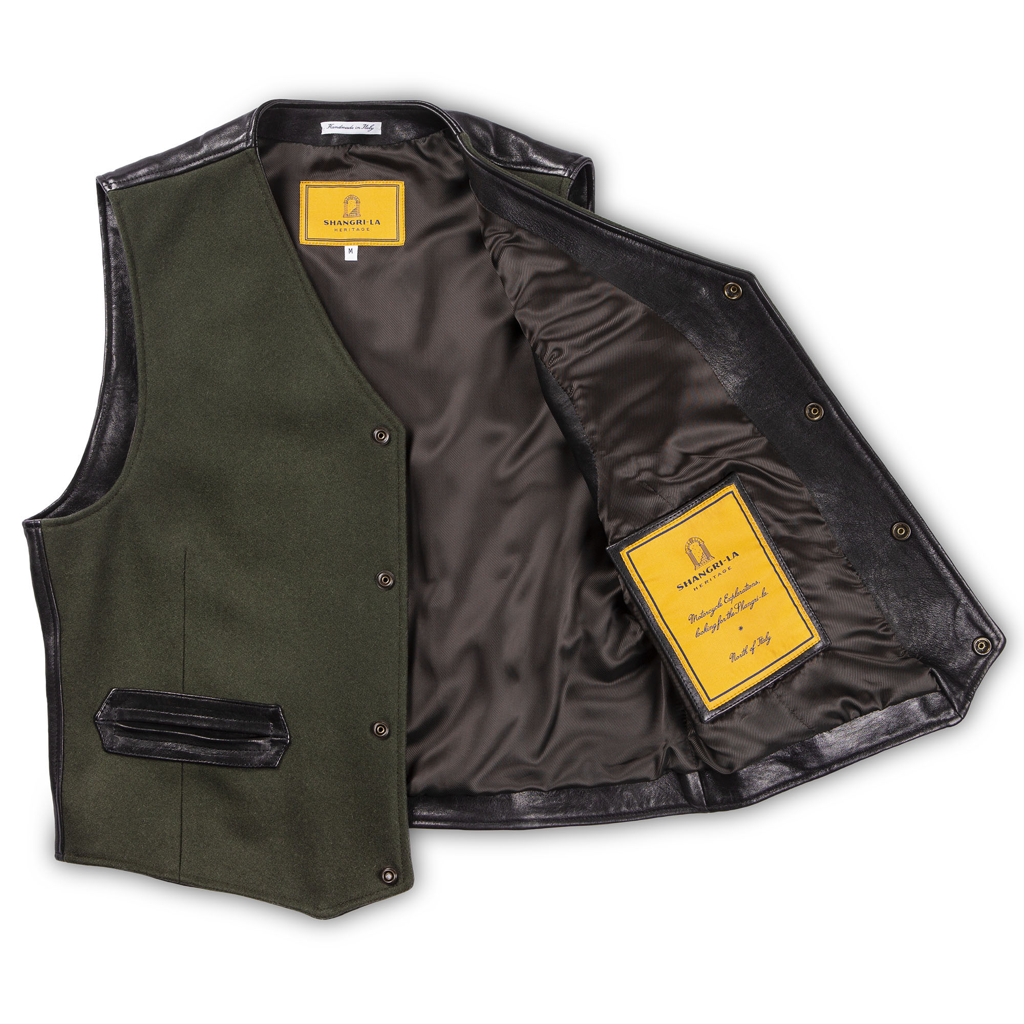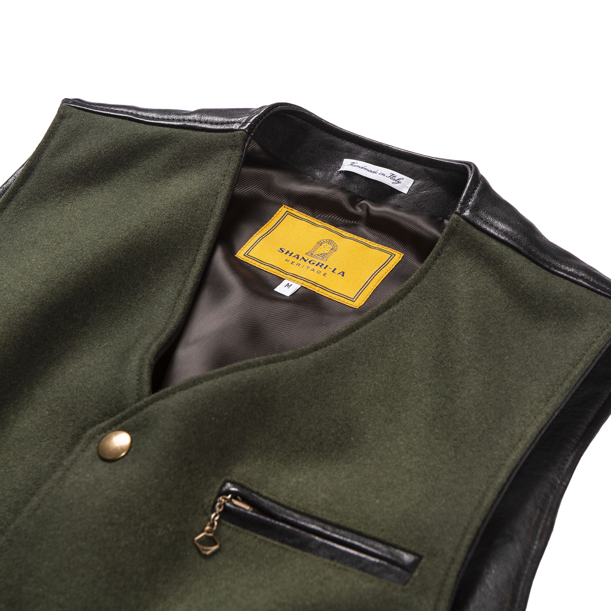 Inspired by late 30s European tailor-made waistcoats and revisited with a unique Italian touch, the “Mandriano” Forest Green represents an authentic garment made of Premium Melton Wool 24 Oz from Tuscany, 90% Wool and 10% Cachemire, on the front and vegetable tanned Lambskin from Tuscany (Italy) on the back and trimmings.