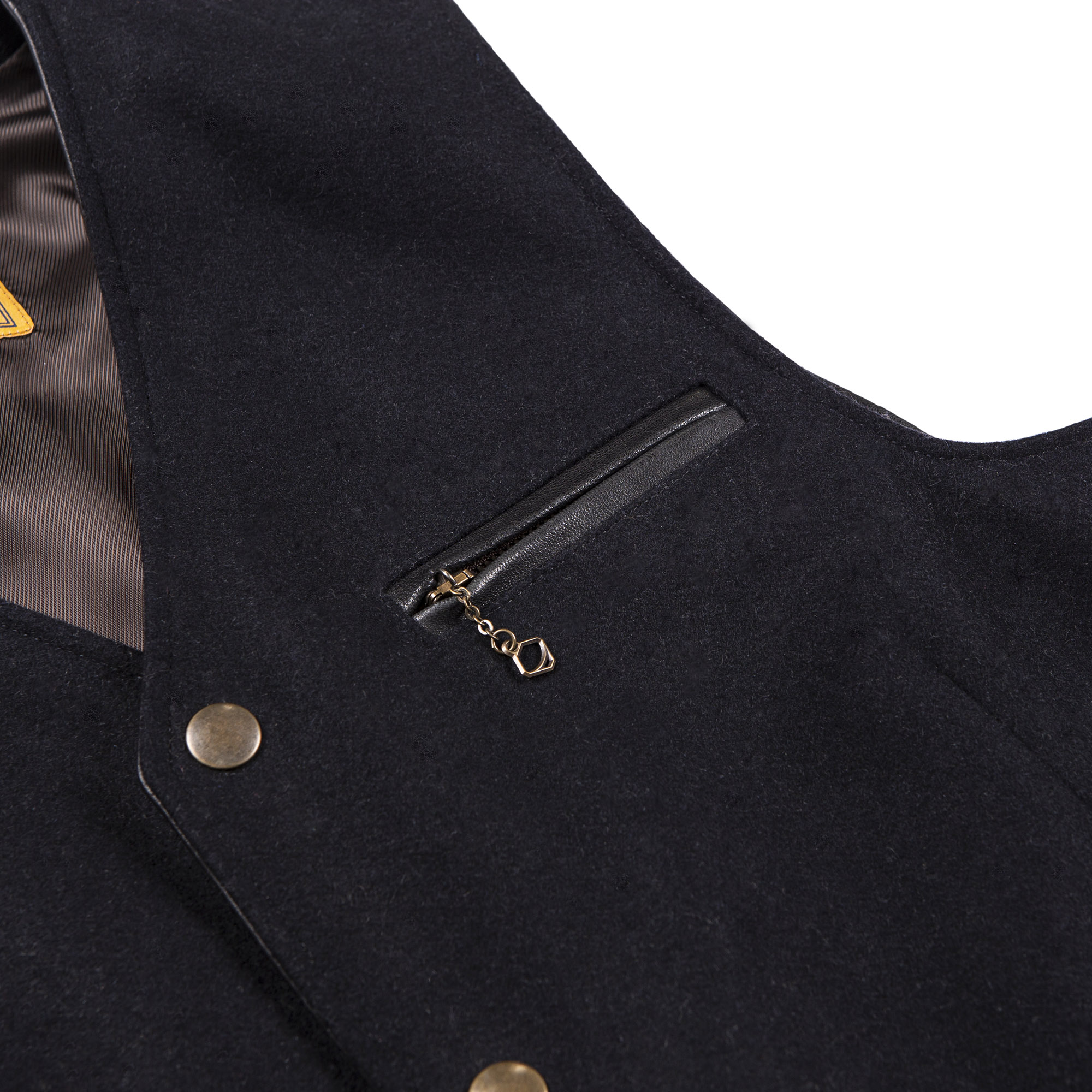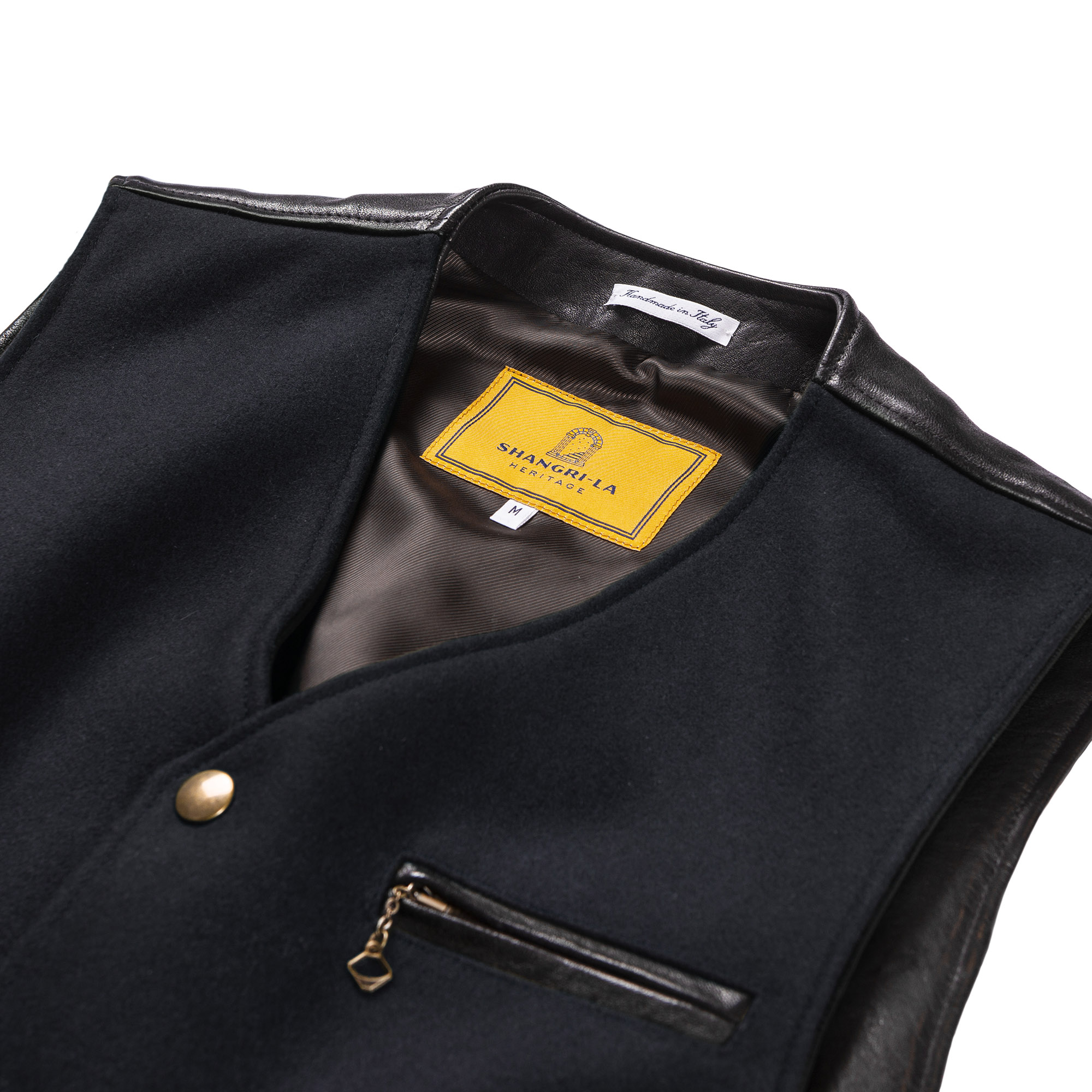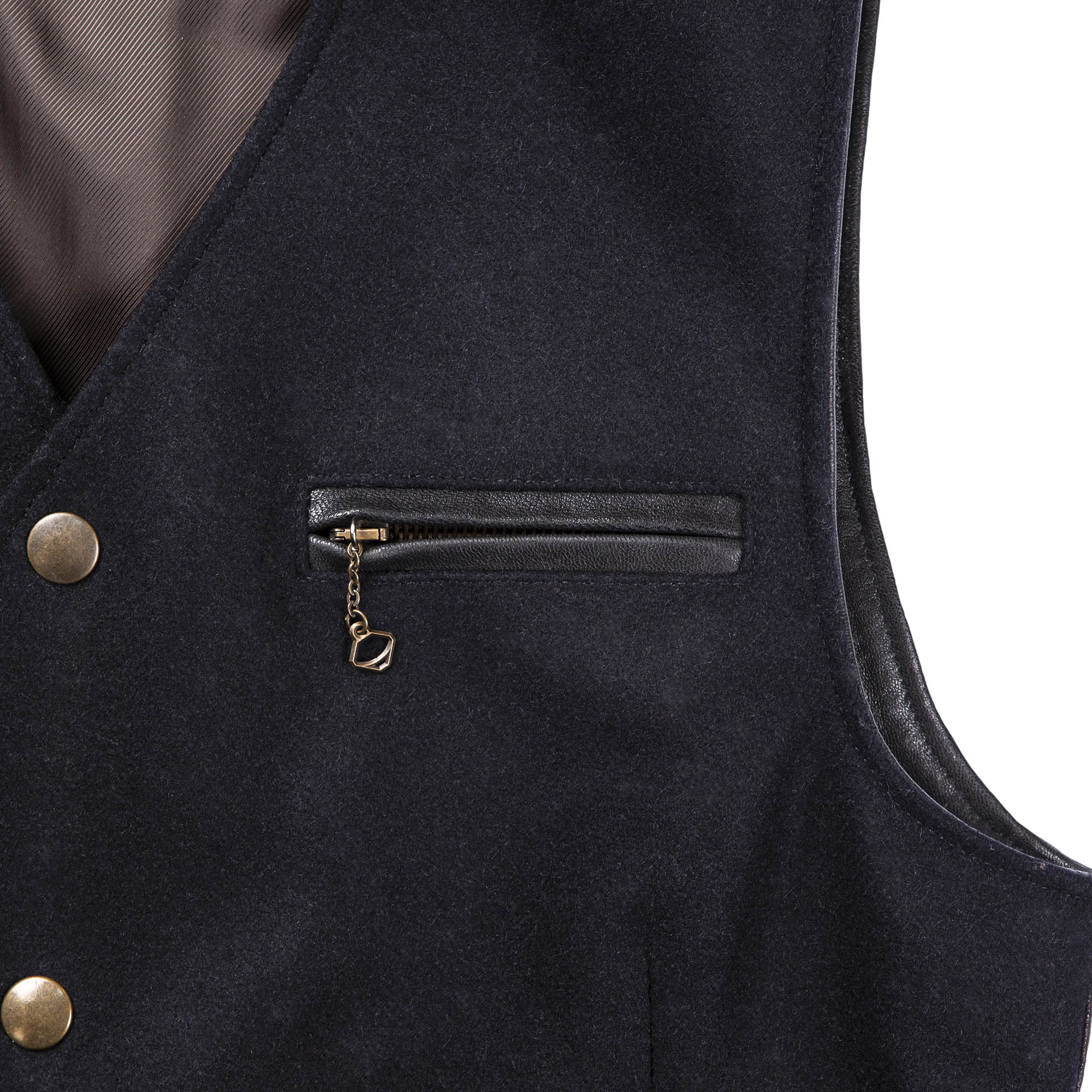 Inspired by late 30s European tailor-made waistcoats and revisited with a unique Italian touch, the “Mandriano” Navy Blue represents an authentic garment made of Premium Melton Wool 24 Oz from Tuscany, 90% Wool and 10% Cachemire, on the front and vegetable tanned Lambskin from Tuscany (Italy) on the back and trimmings.