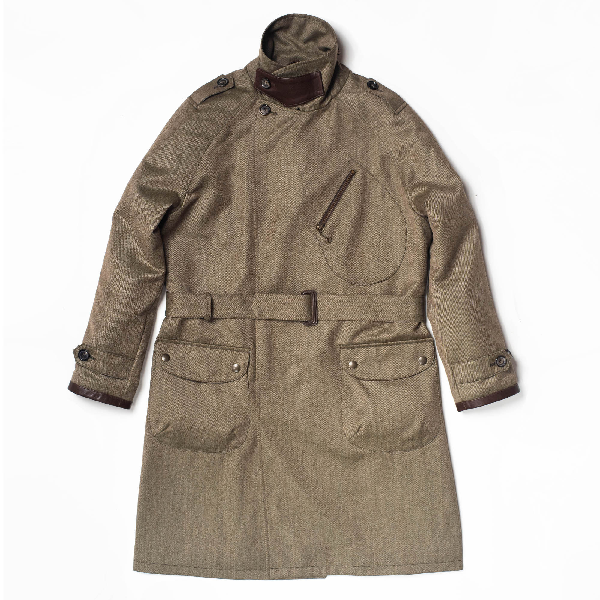 A double-breasted front provided an additional layer of protection to the chest, with a storm flap designed to keep water away from the body. The most distinctive feature of the coat, however, remains the slanted chest “Map” pocket used by the dispatch riders to carry messages.