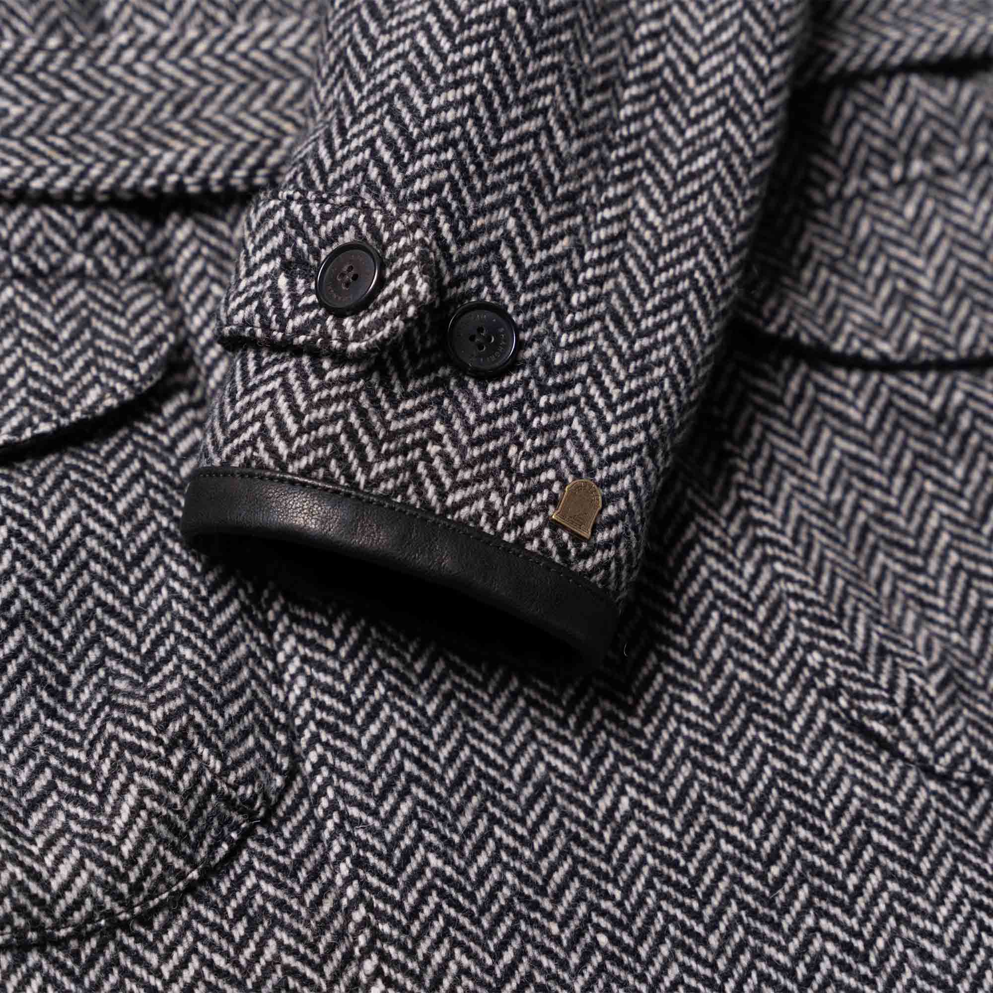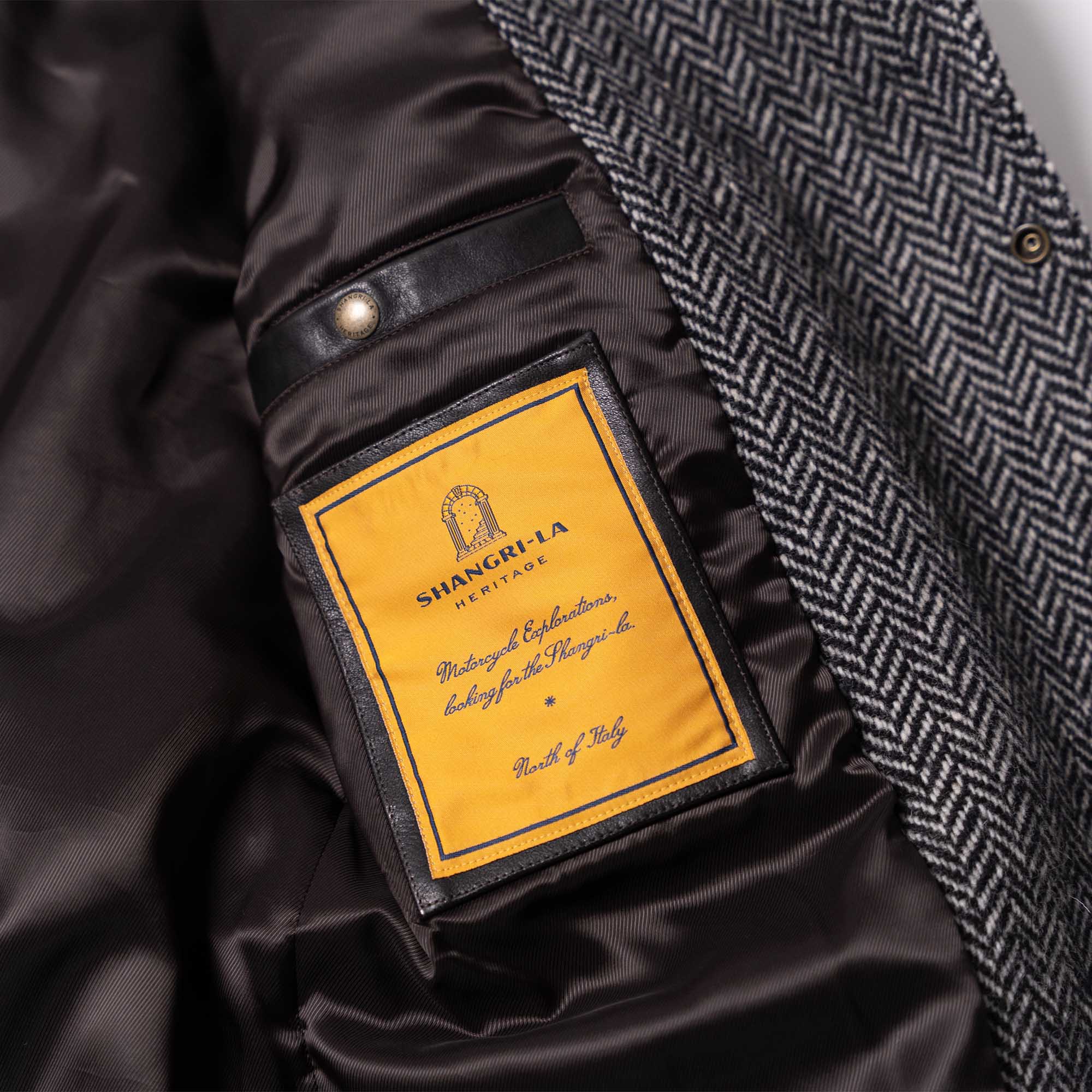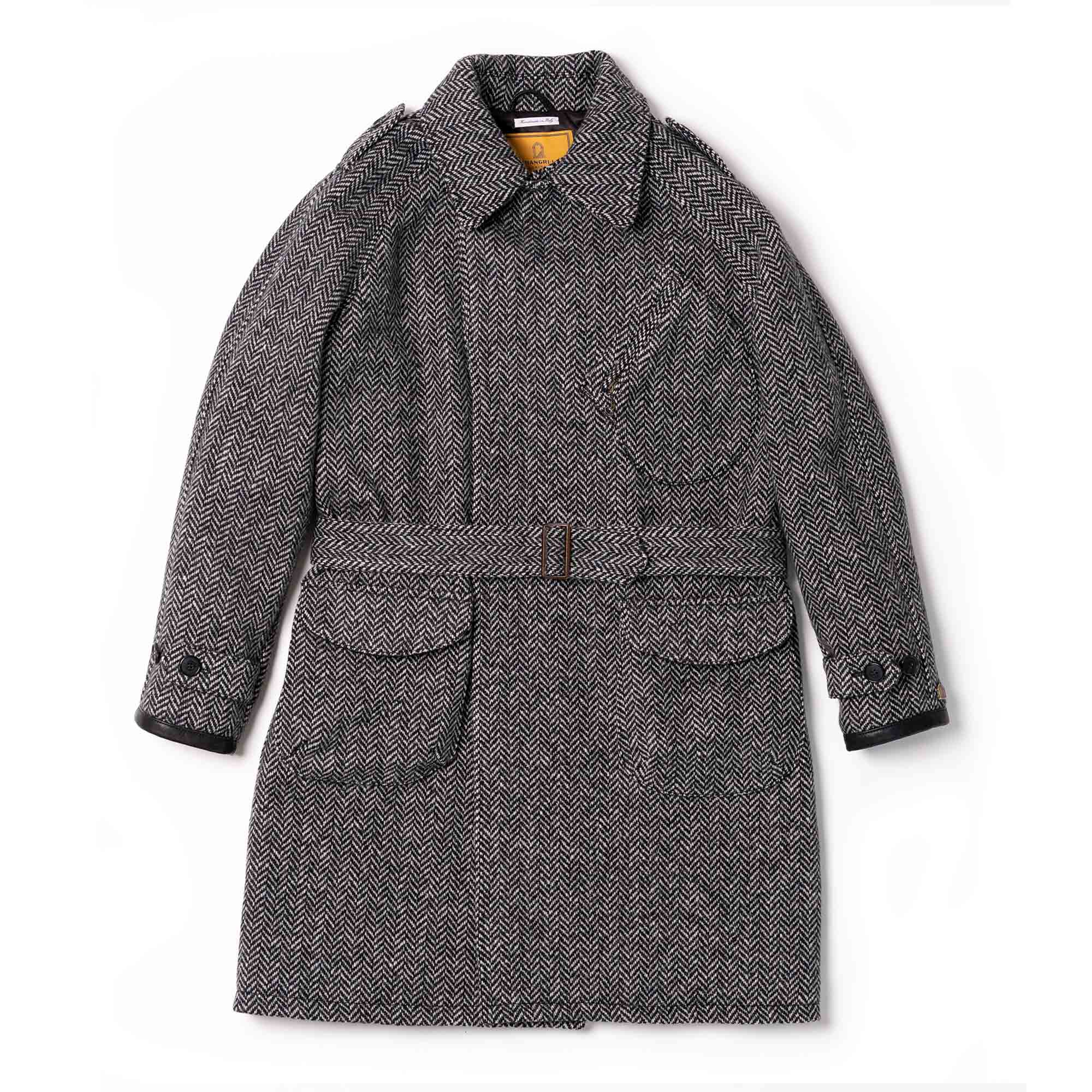 Inspired by late 10s Dispatch Rider coats from the First World War and revisited with a unique Italian touch, the “Stelvio” Dispatch Rider Coat represents an authentic garment made of Premium Herringbone Wool 21 Oz from Tuscany in Grey color, with leather trimmings made with vegetable tanned Lambskin from Tuscany (Italy).