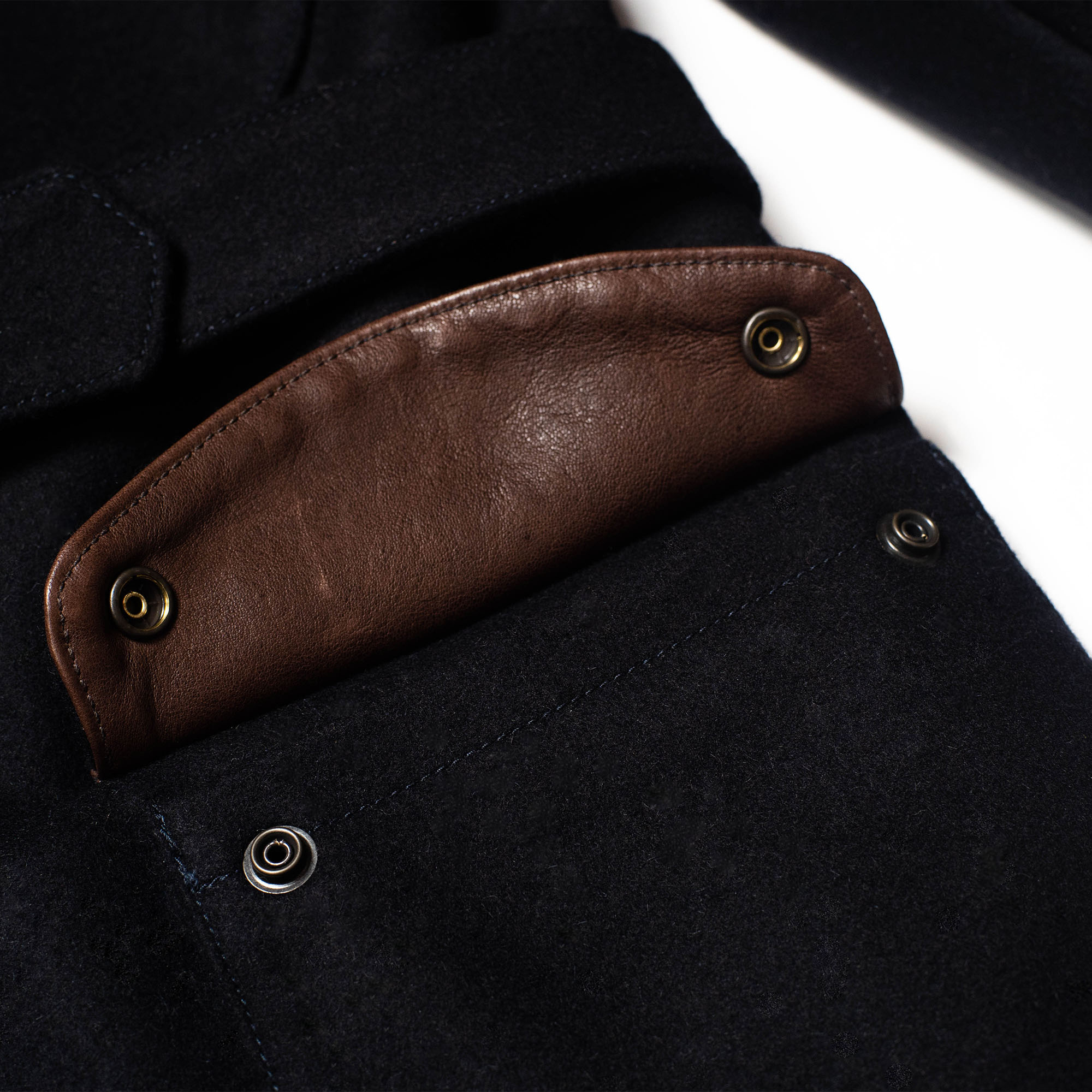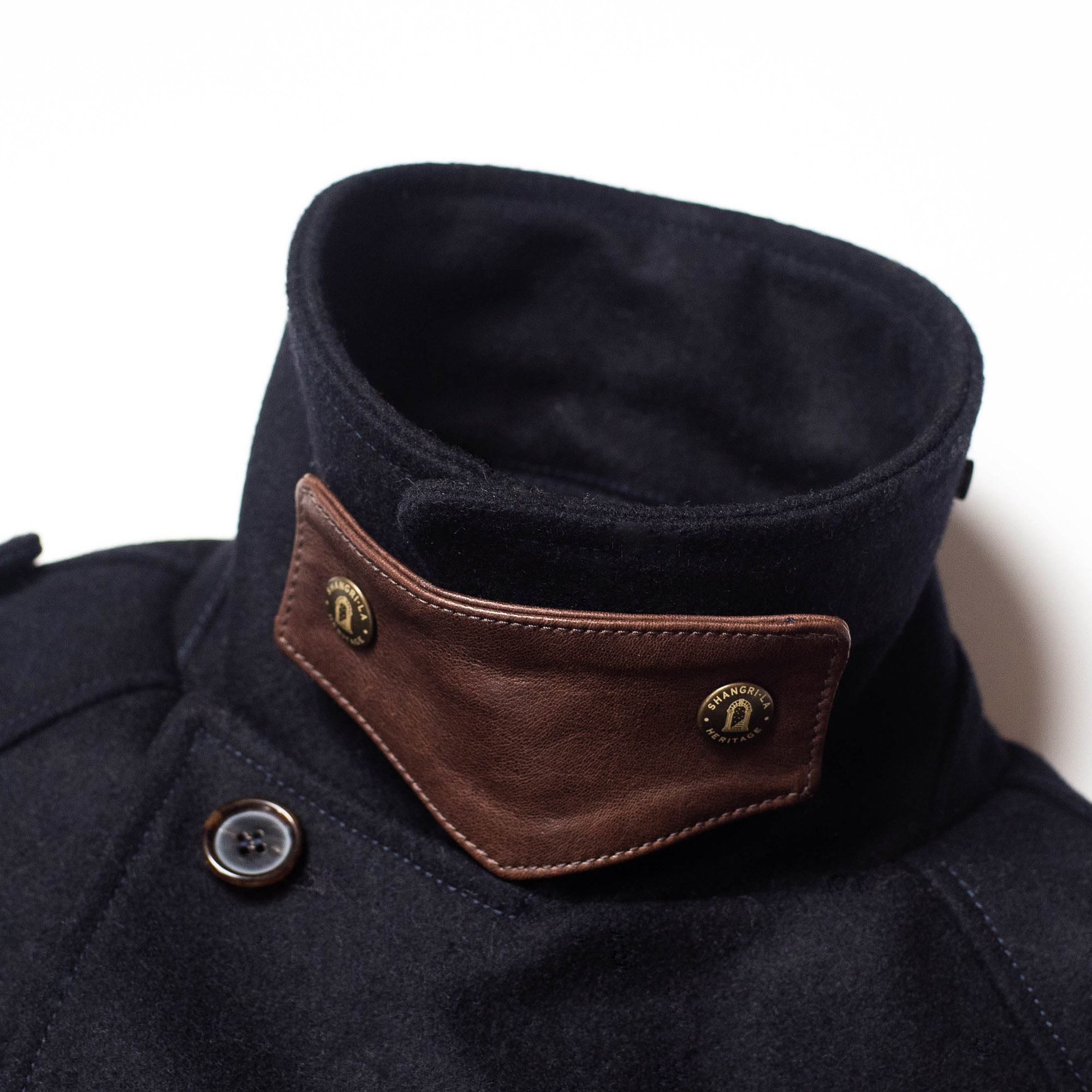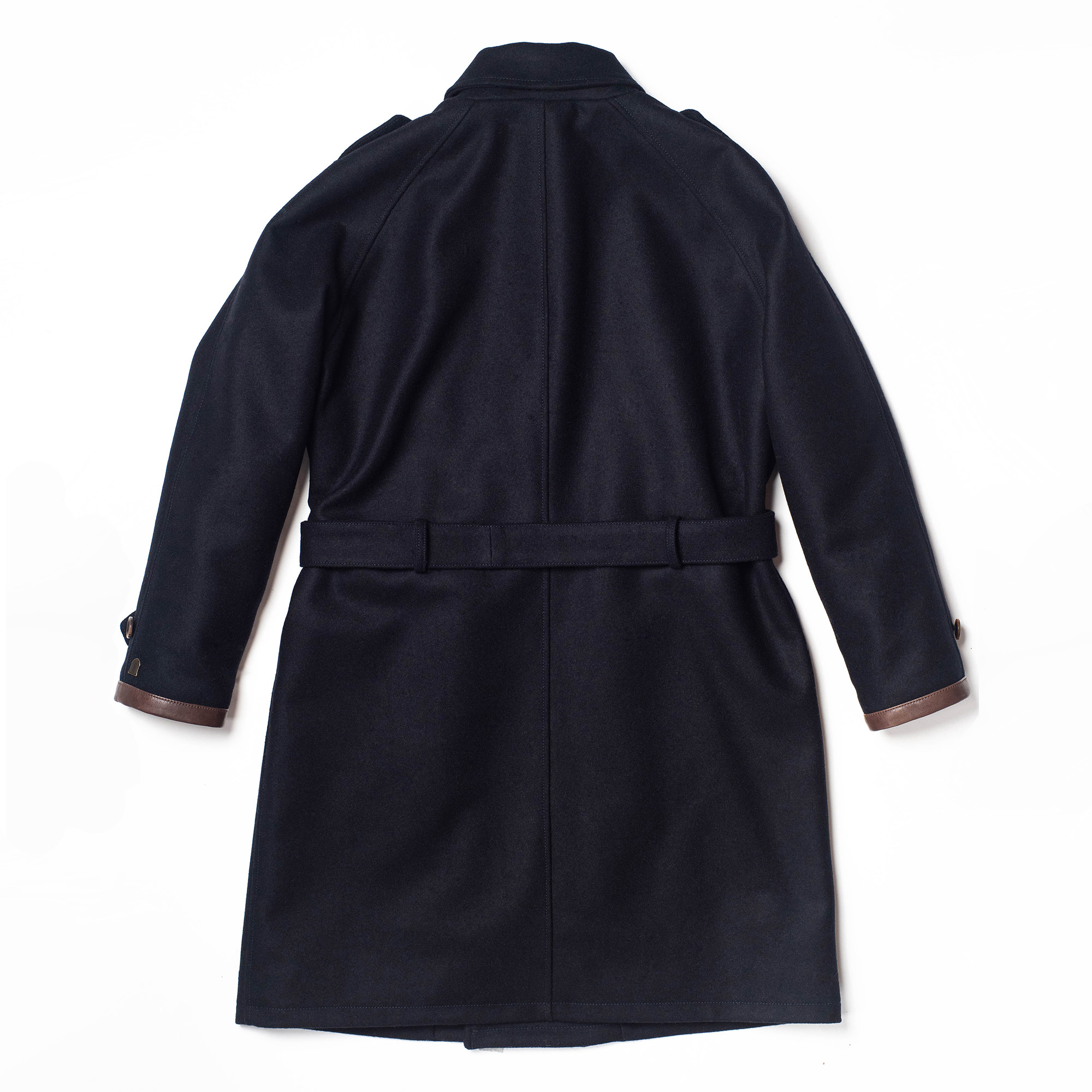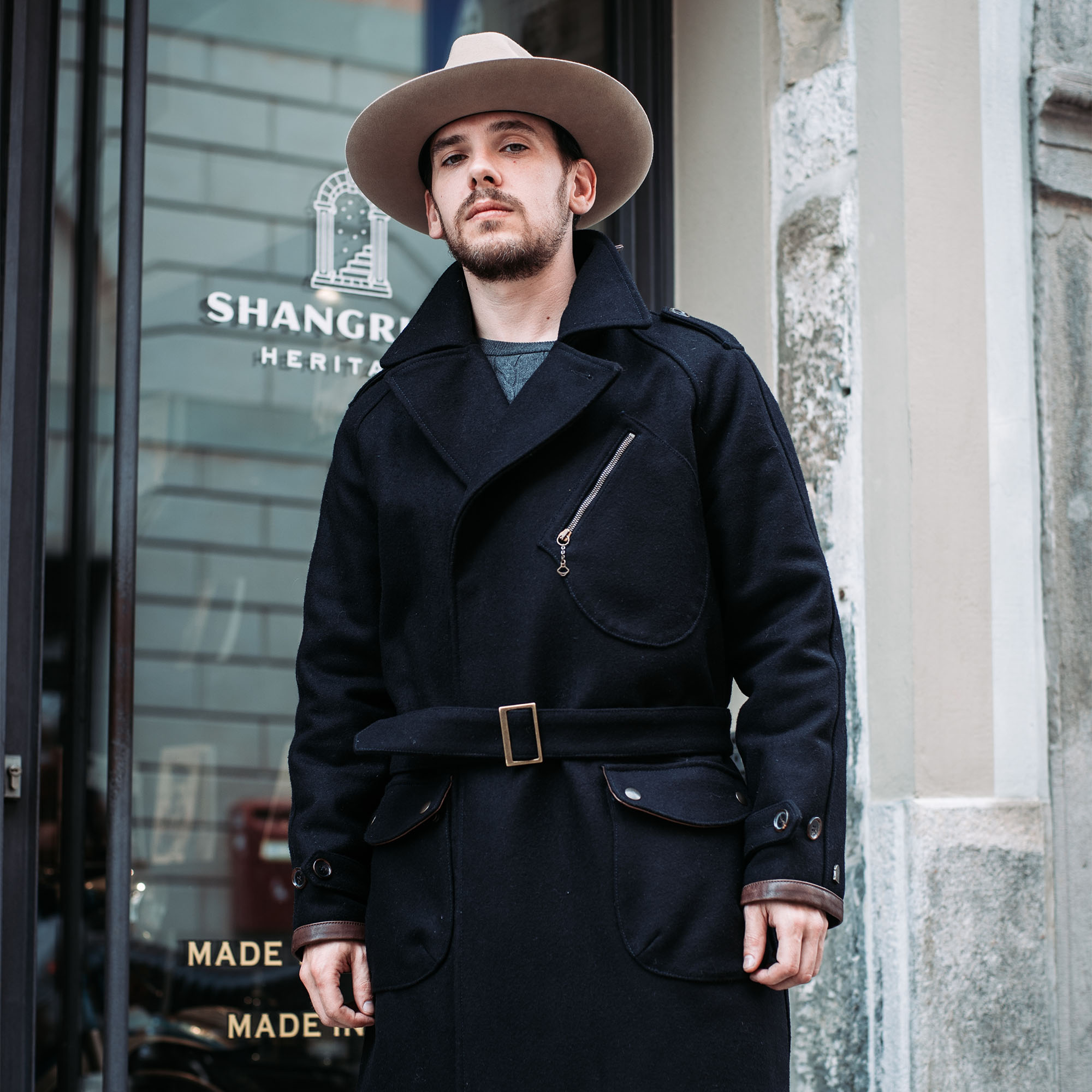 Inspired by late 10s Dispatch Rider coats from the First World War and revisited with a unique Italian touch, the “Stelvio” Dispatch Rider Coat represents an authentic garment made of Premium Melton Wool 24 Oz from Tuscany, 90% Wool and 10% Cachemire, in Navy Blue color, with leather trimmings made with vegetable tanned Lambskin from Tuscany (Italy).