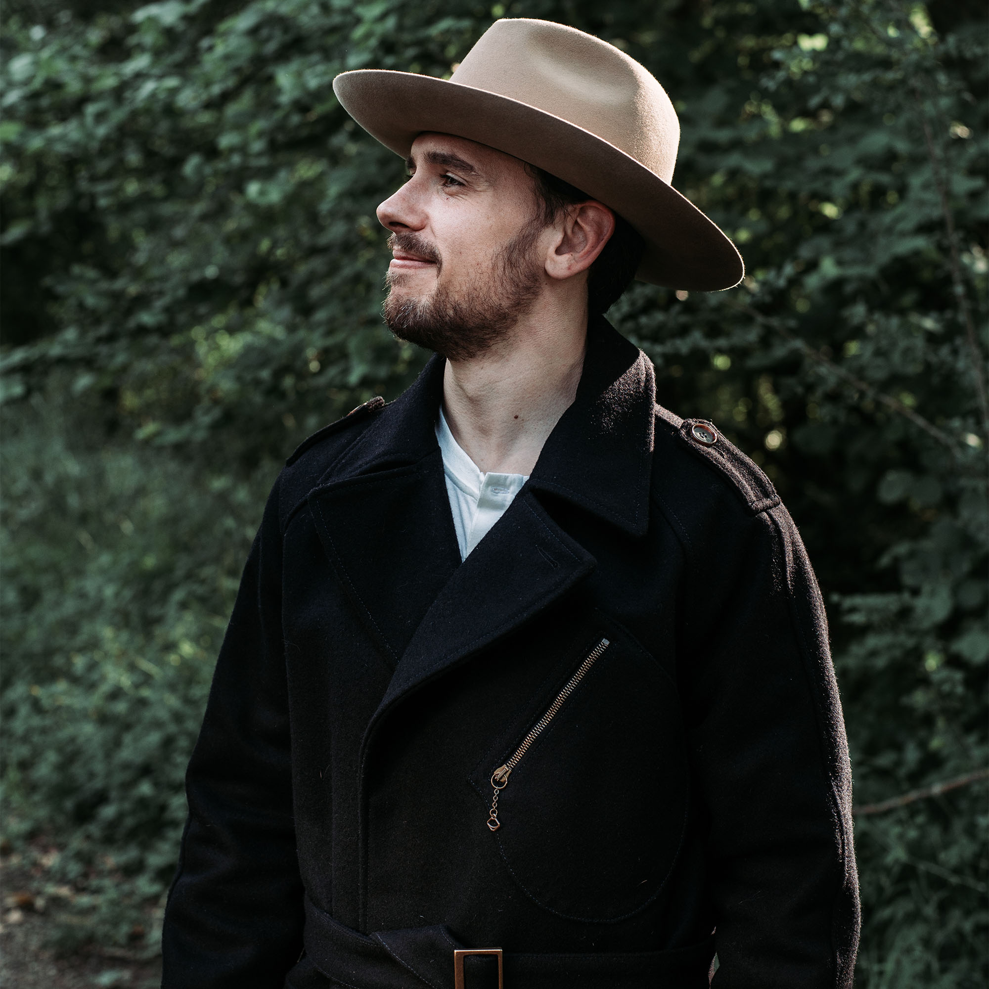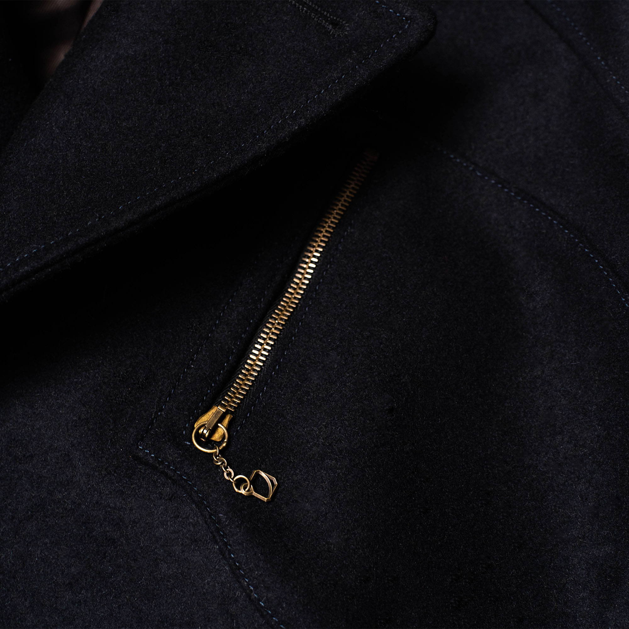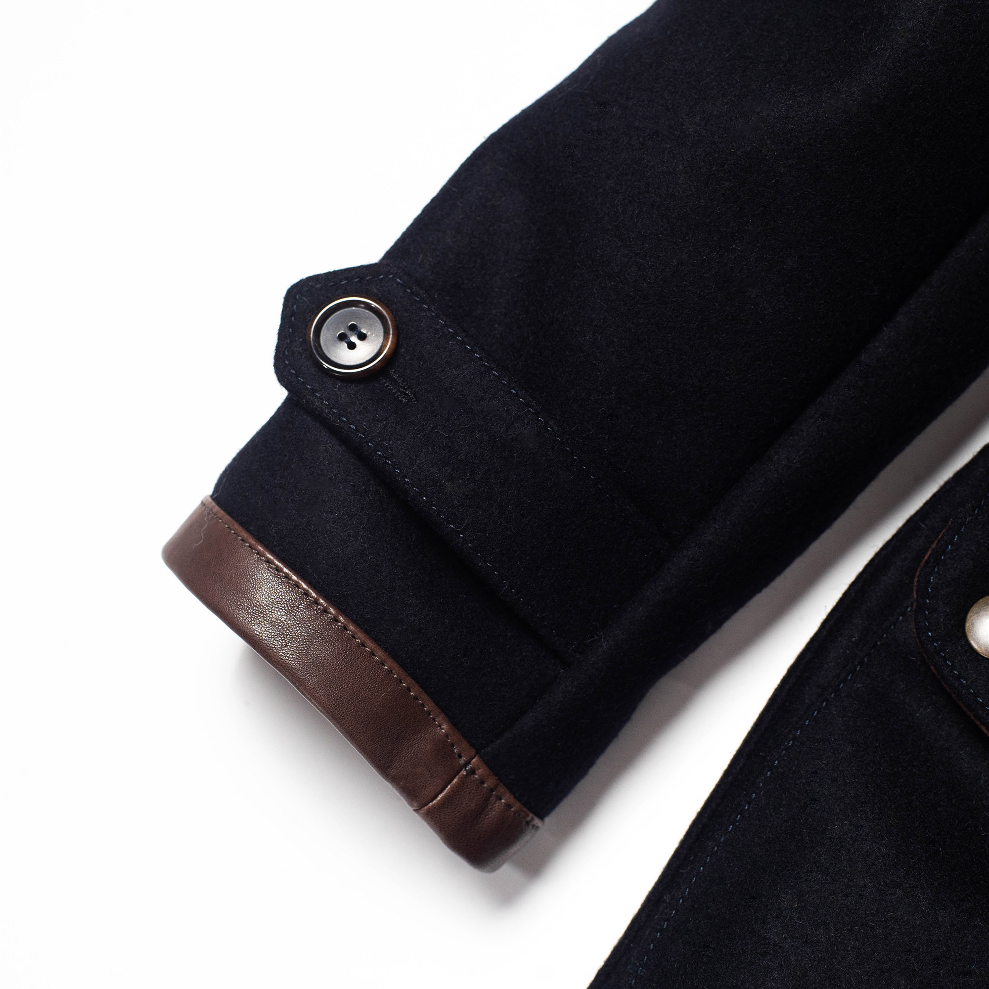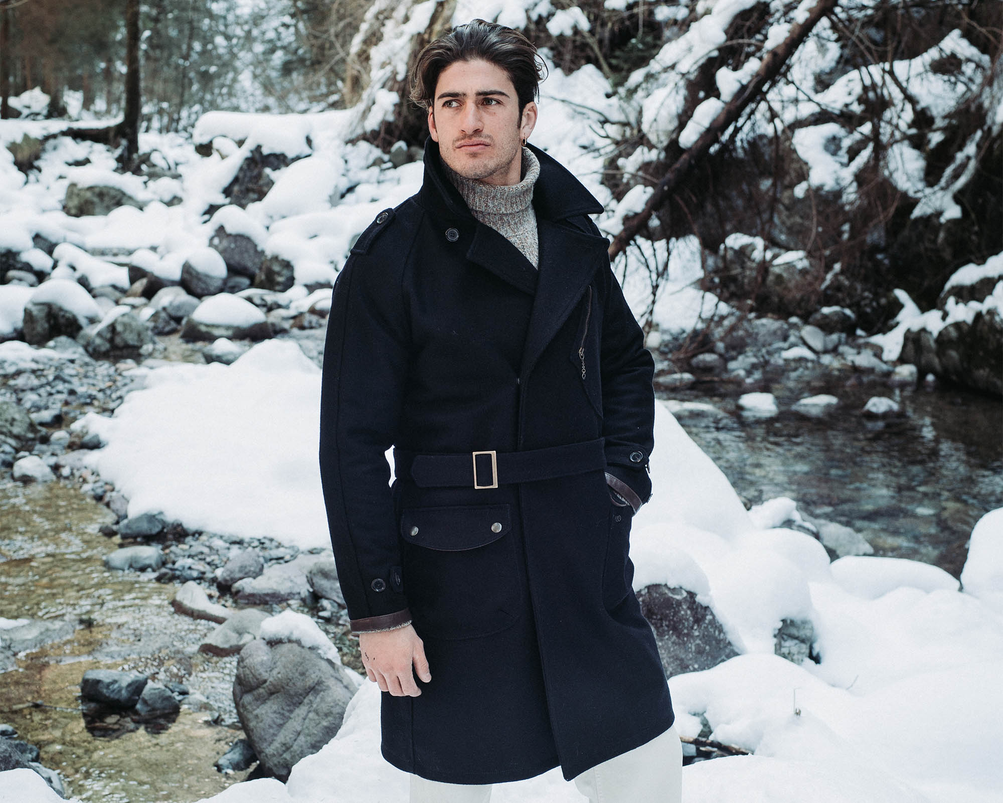 Inspired by late 10s Dispatch Rider coats from the First World War and revisited with a unique Italian touch, the “Stelvio” Dispatch Rider Coat represents an authentic garment made of Premium Melton Wool 24 Oz from Tuscany, 90% Wool and 10% Cachemire, in Navy Blue color, with leather trimmings made with vegetable tanned Lambskin from Tuscany (Italy).