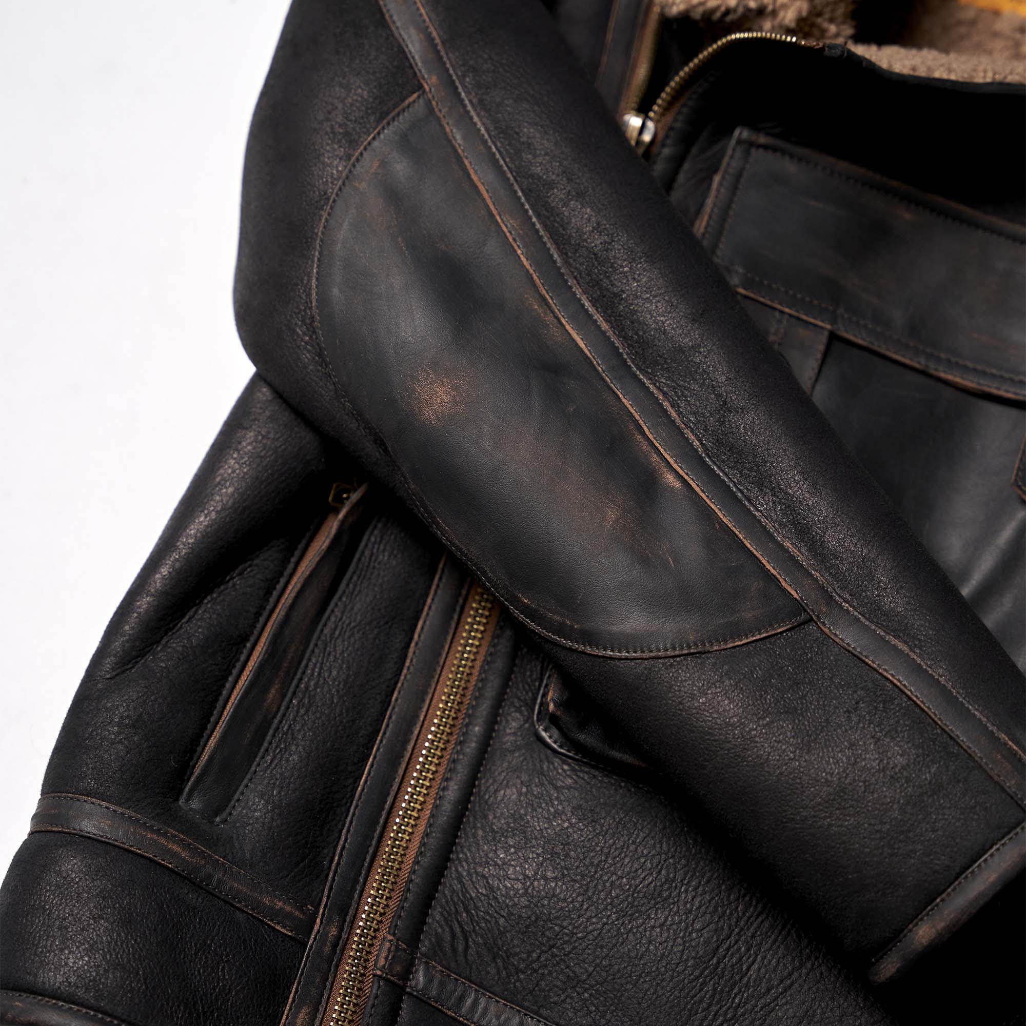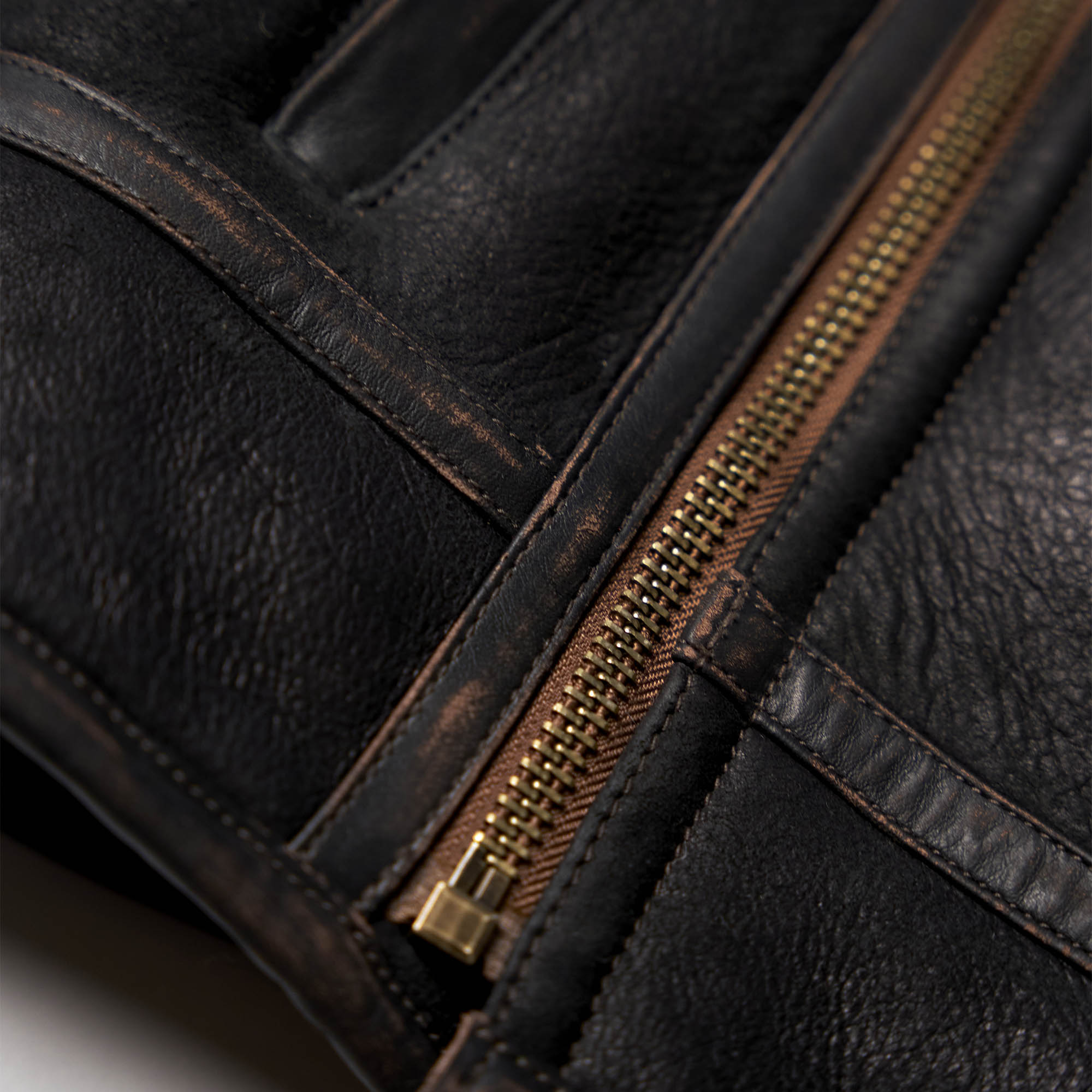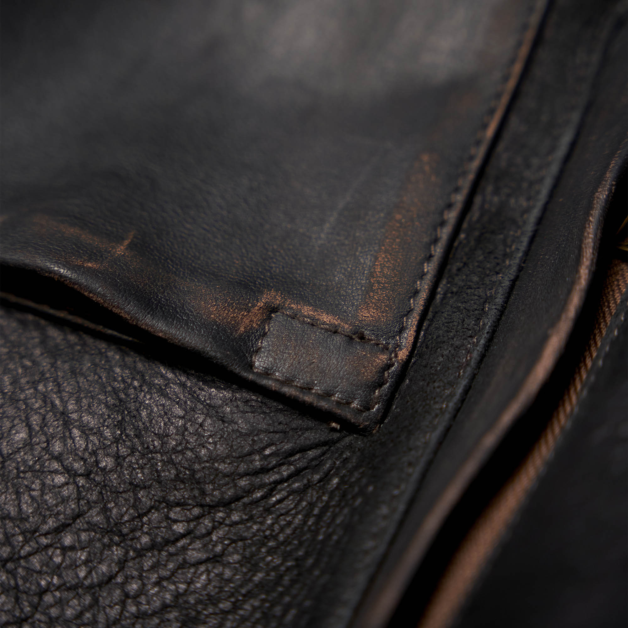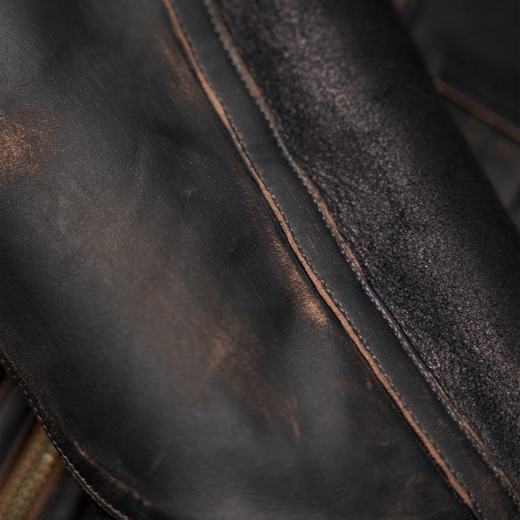 The Full Grain Tea-Core Steerhide has been aged by hand, giving it a real antique look. This Leather will change color with the wear, developing a unique Patina on the jacket, as a personal journey. The Black Tea-core Leather will begin to reveal the natural color under-layer, showing signs of time when it’s exposed to the elements and daily use, showing awesome scratches and fades in a various shades of golden and brown tone.