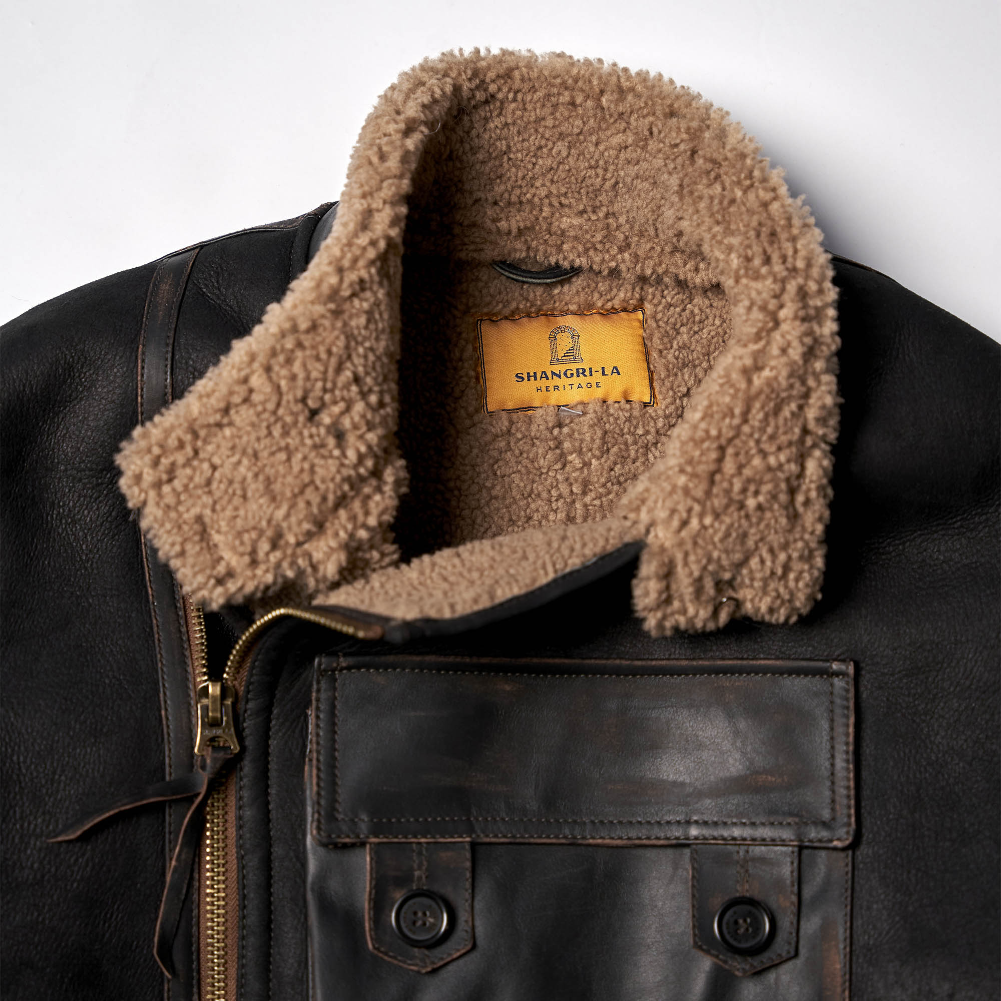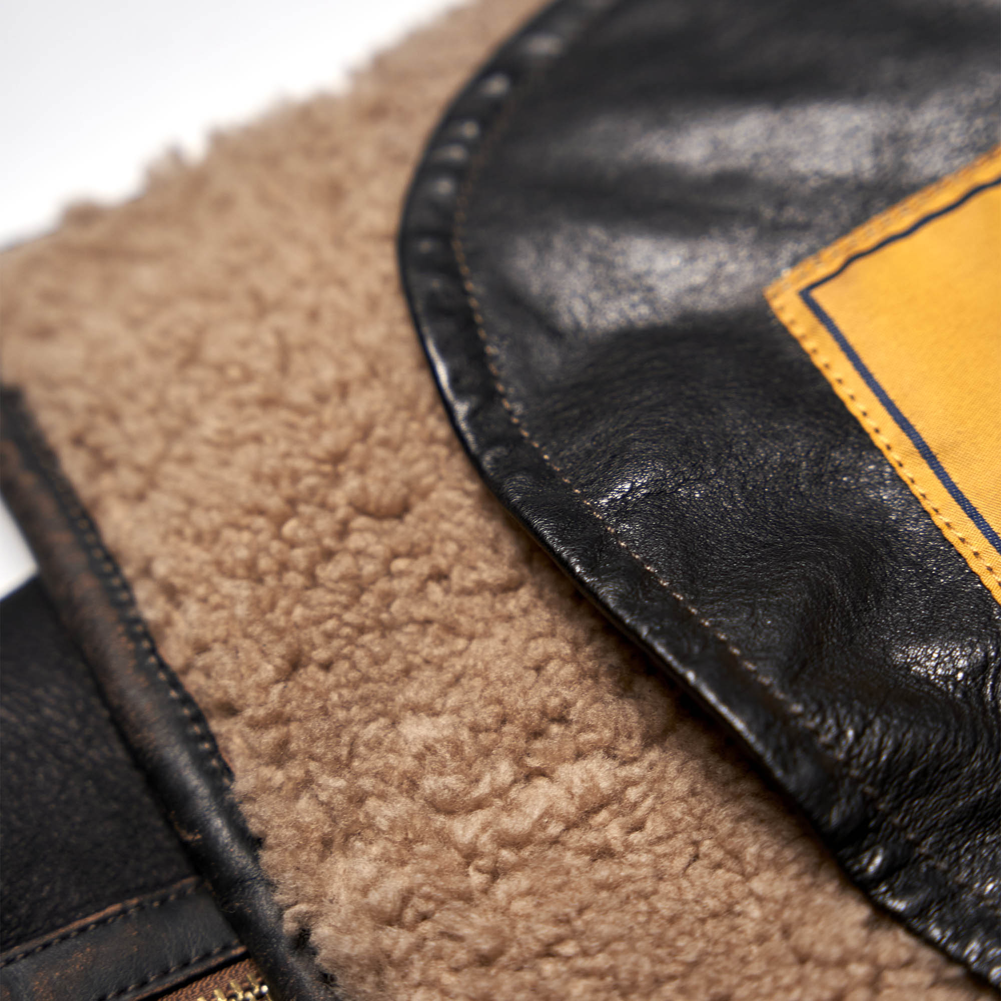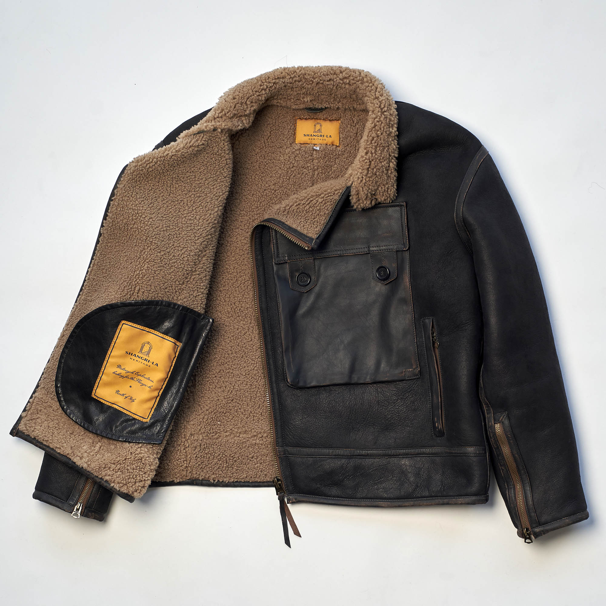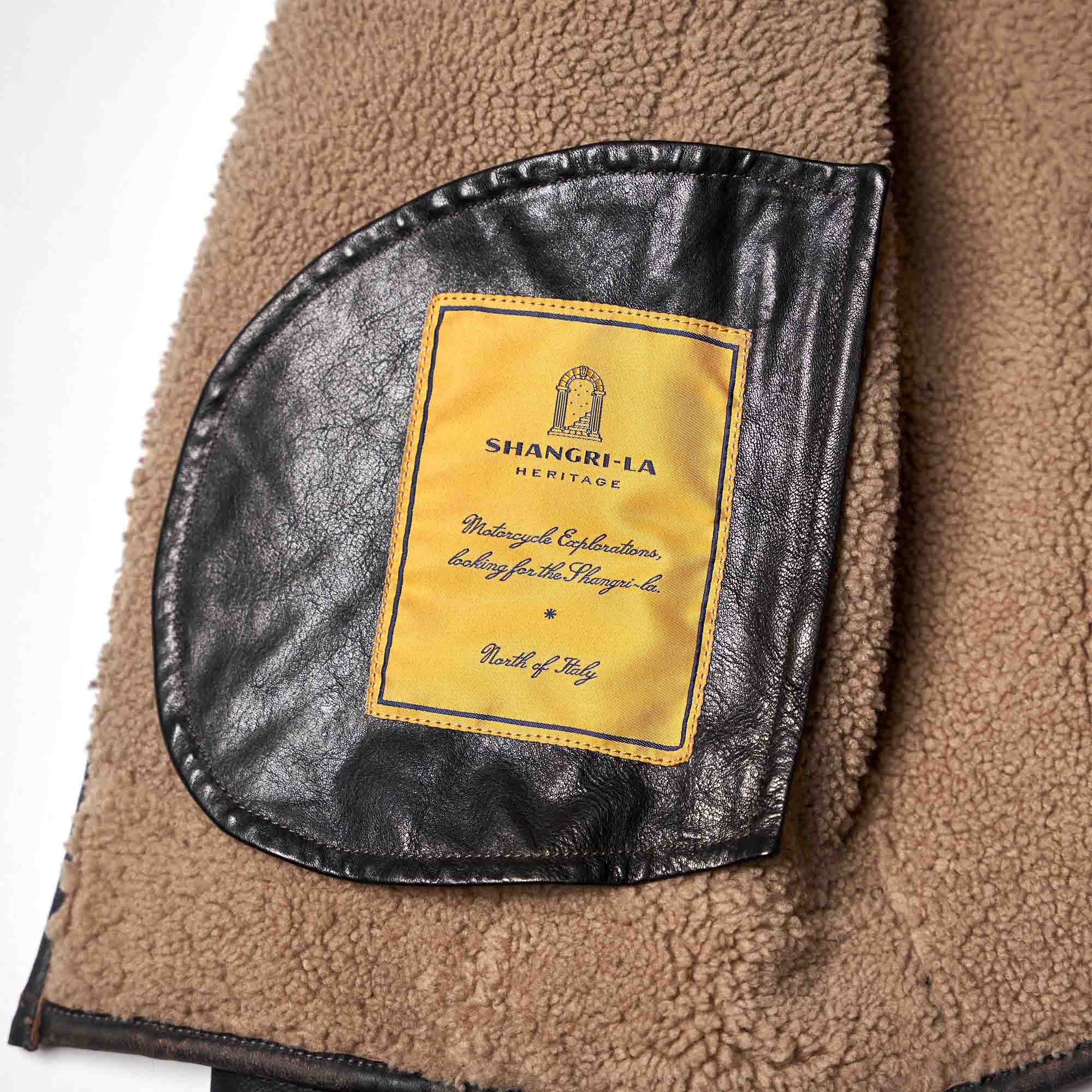 Inspired by early 1950s Swedish Army Motorcycle Jackets and revisited with a unique Italian touch, the “Swedish” Motorcycle Shearling Jacket represents an authentic garment made of Italian Shearling Sheepskin reinforced with leather trimmings in Full Grain Tea-Core Steerhide from Vicenza (Italy).