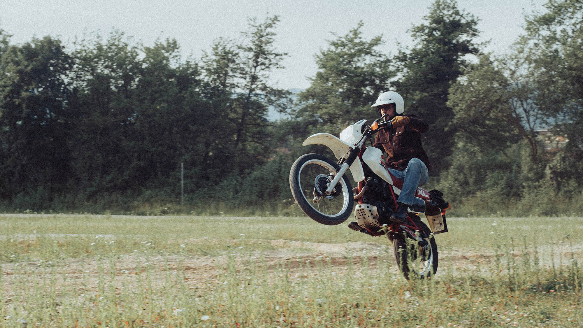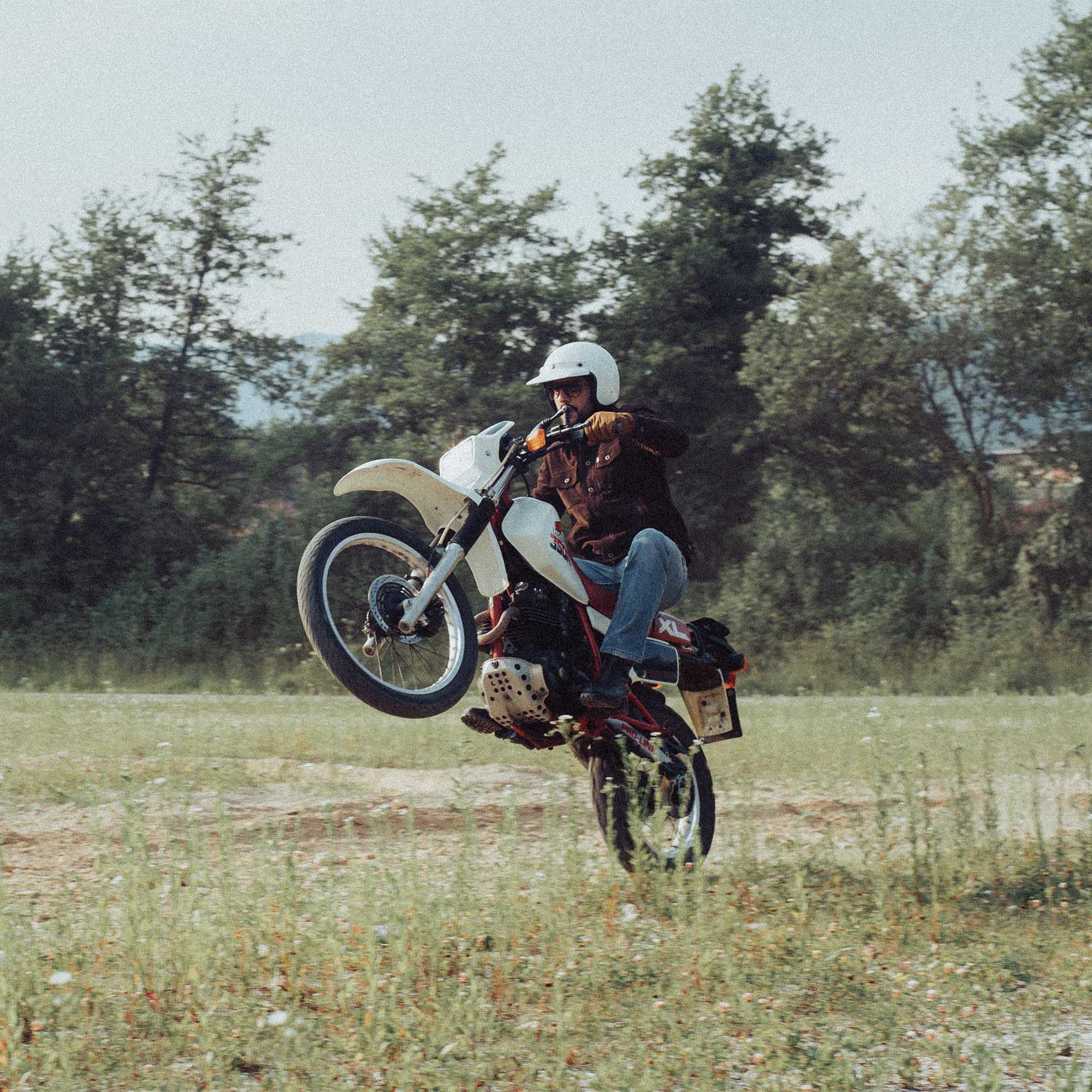 • Daniele (in the garage before, and leaving the Main Road with a Honda XL 350R after) is 185cm and 80kg and he’s wearing a size L.