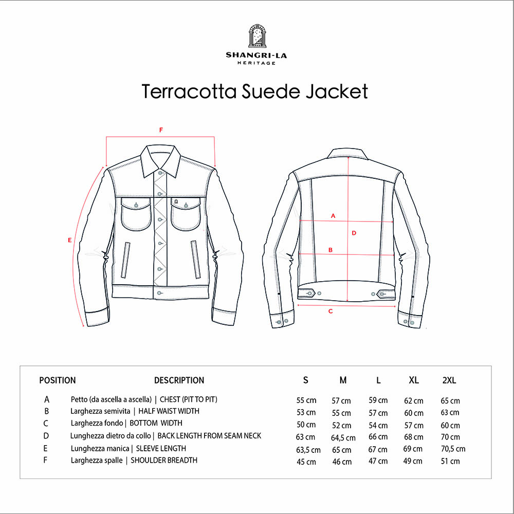 Inspired by late 60s Western jackets and revisited with a unique Italian touch, the “Terracotta” represents an authentic garment made of Calfskin suede from Tuscany (Italy) and “Espresso Coffee” color viscose lining.