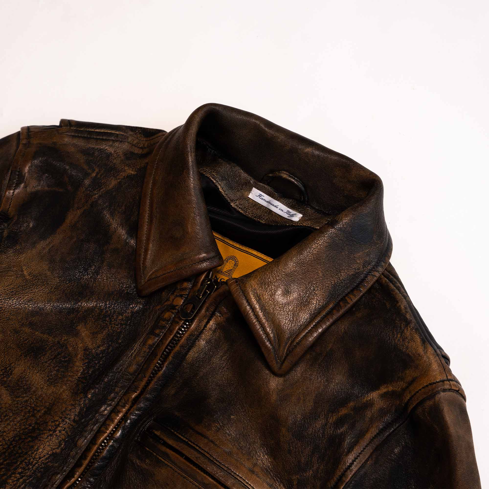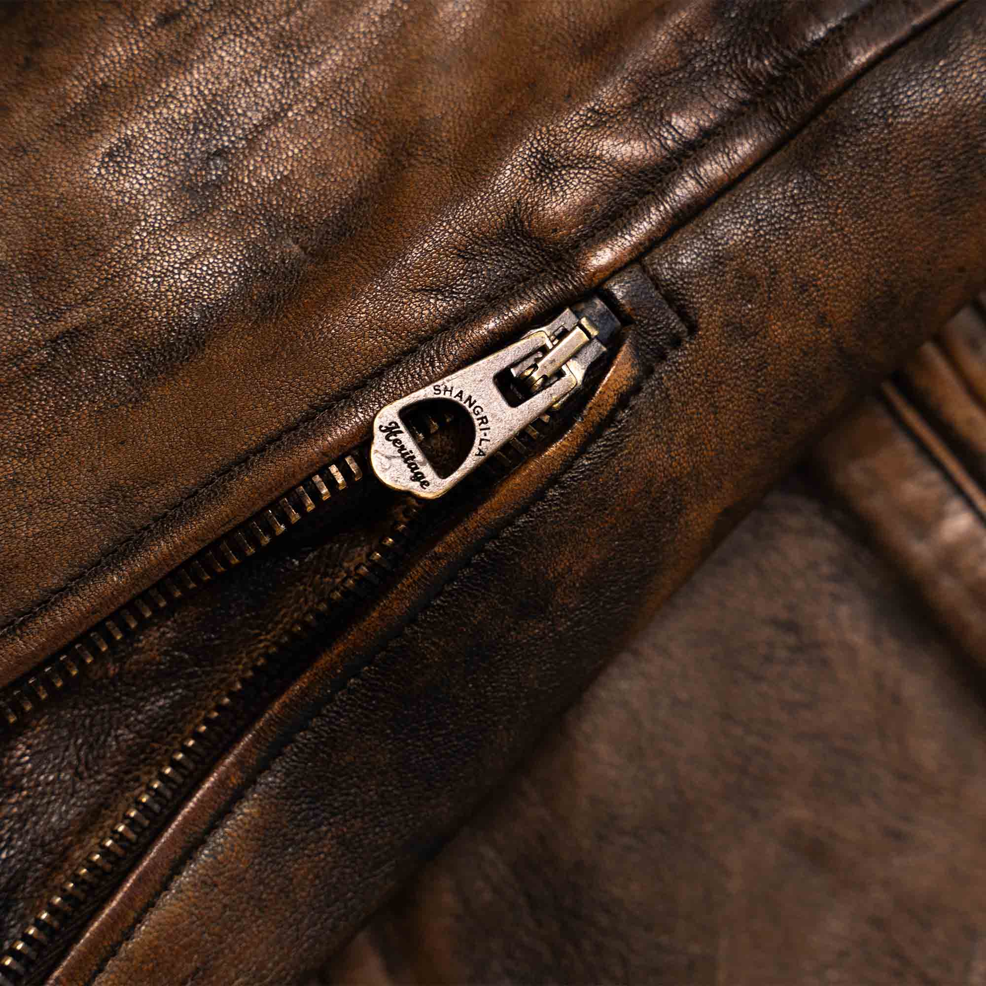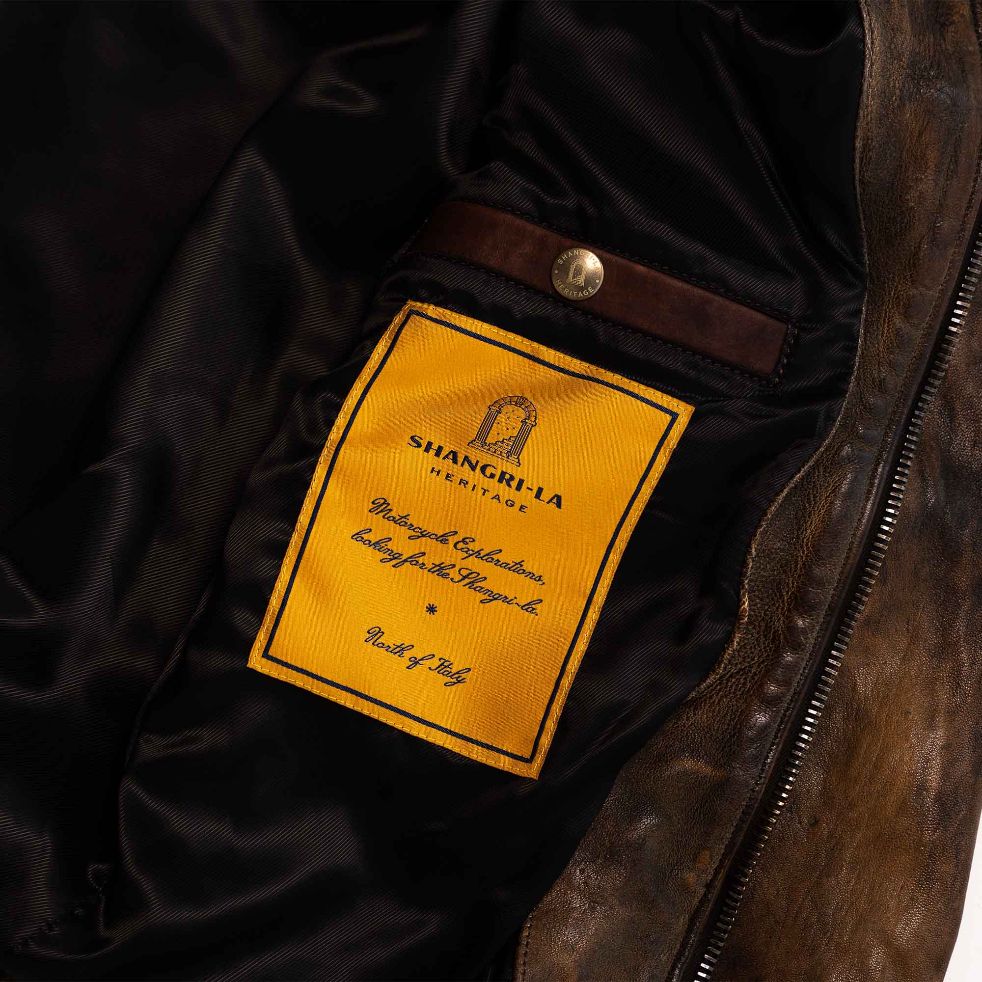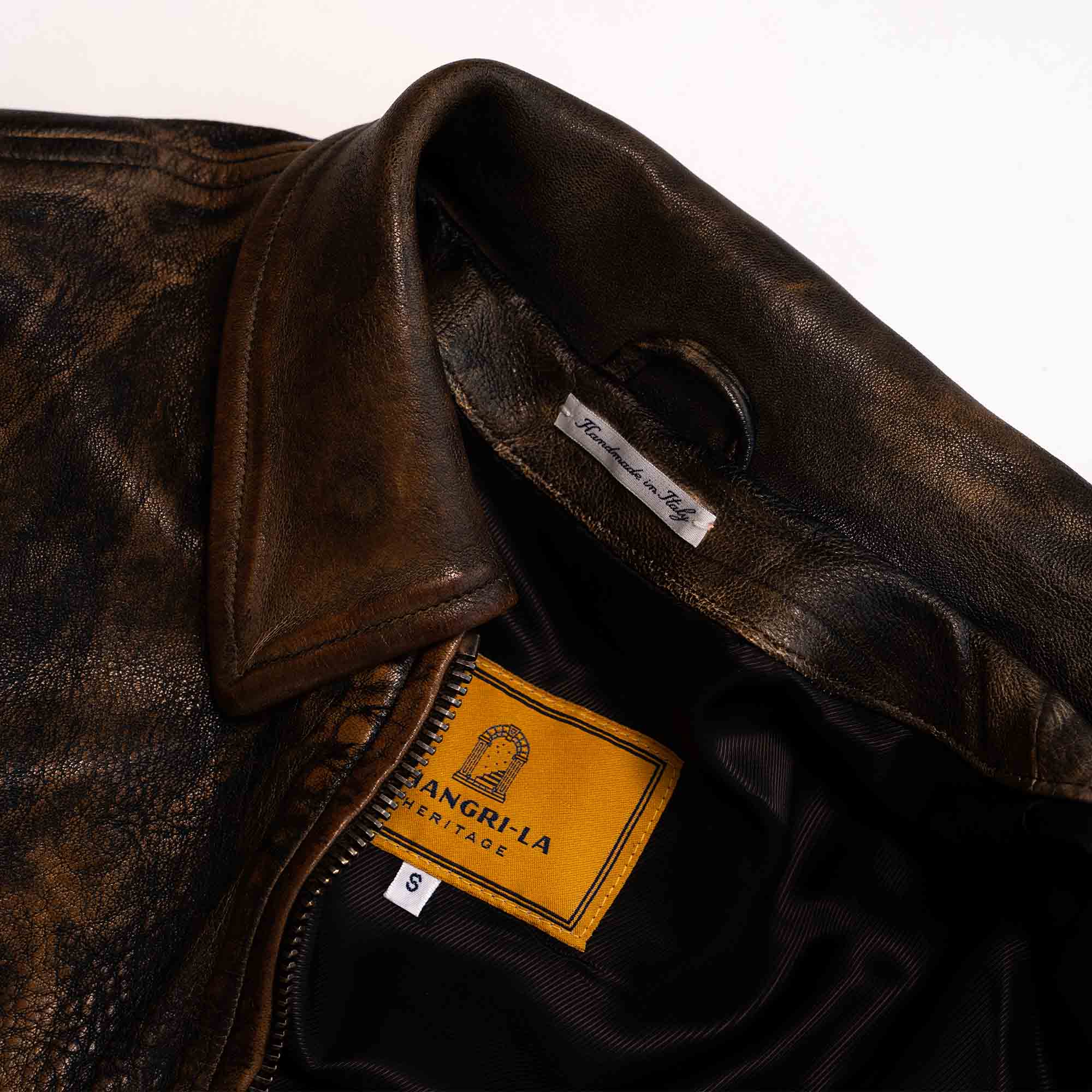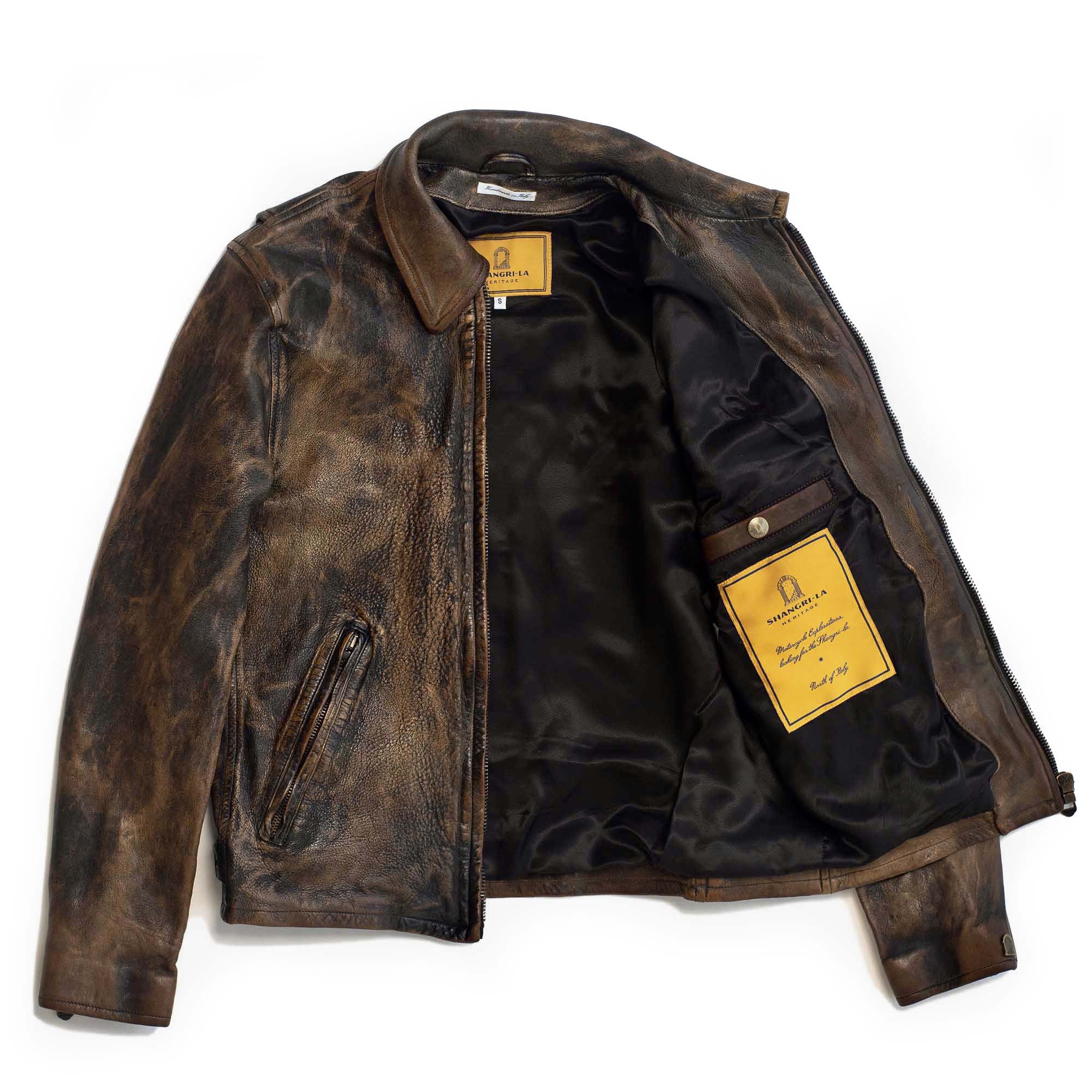 An exceptional jacket from Shangri-La Heritage. The leather treatment is fabulous, it looks like it has already been in numerous adventures but indeed is brand new. The color is also amazing with a full palette of brown nuances. Stylish design. Highly recommended.