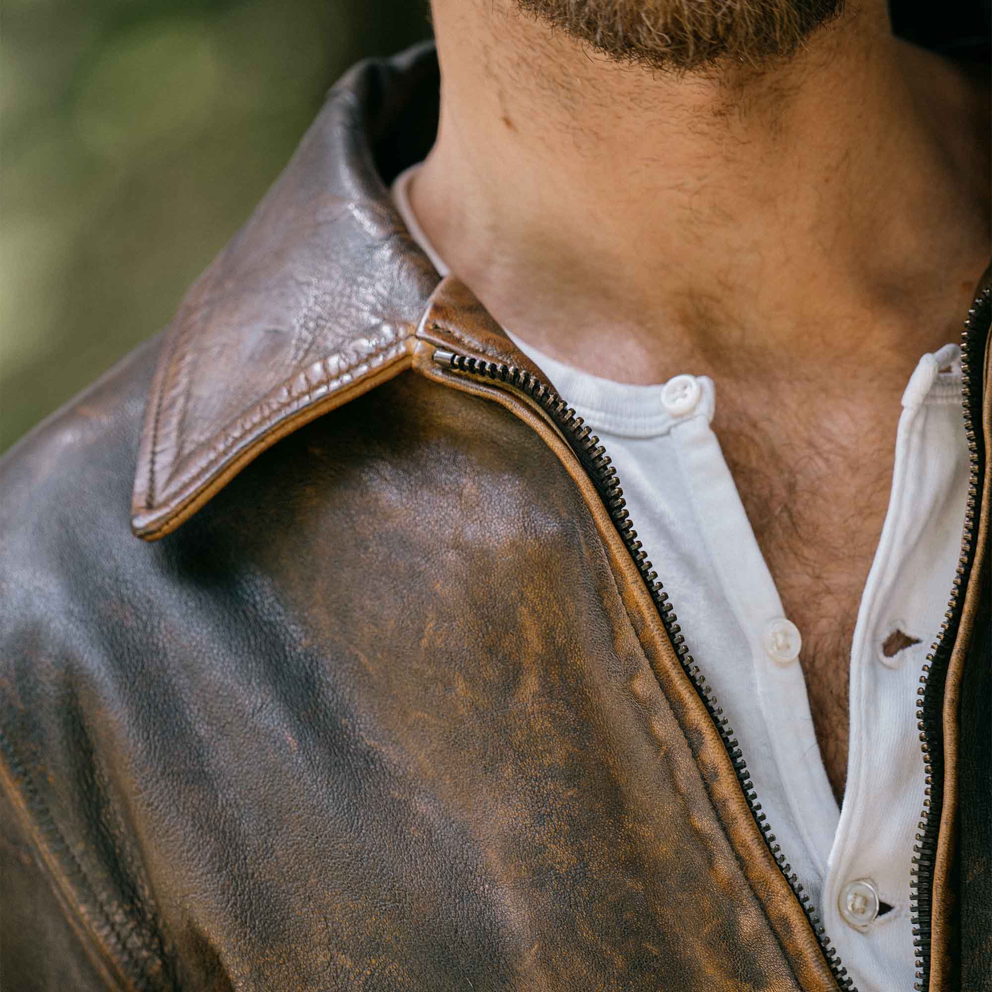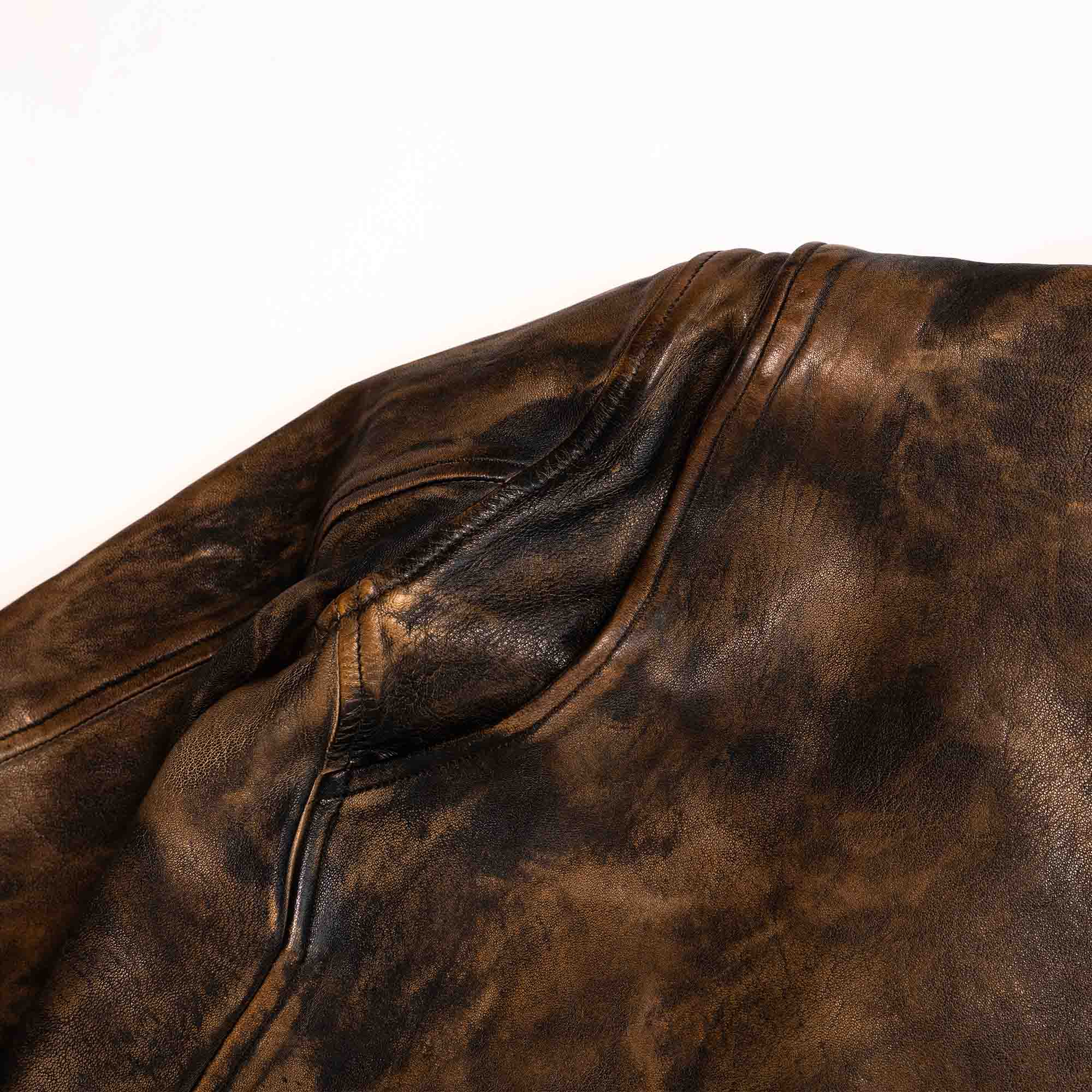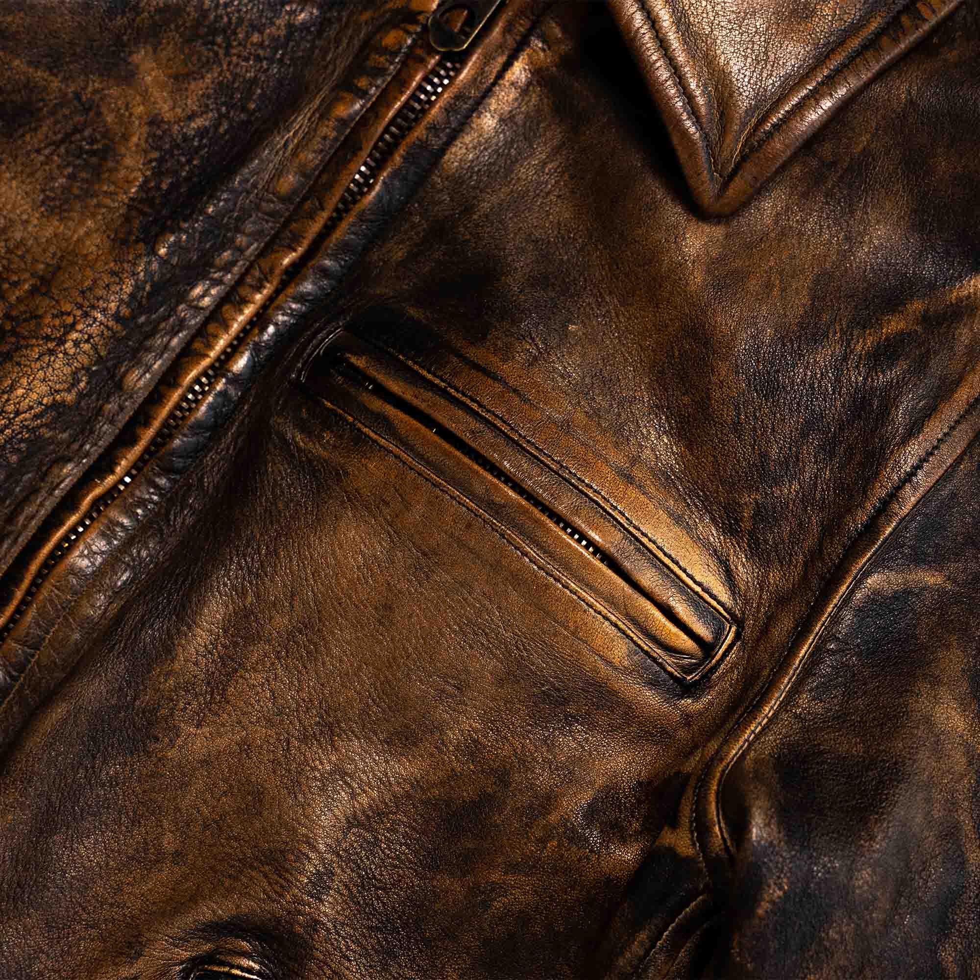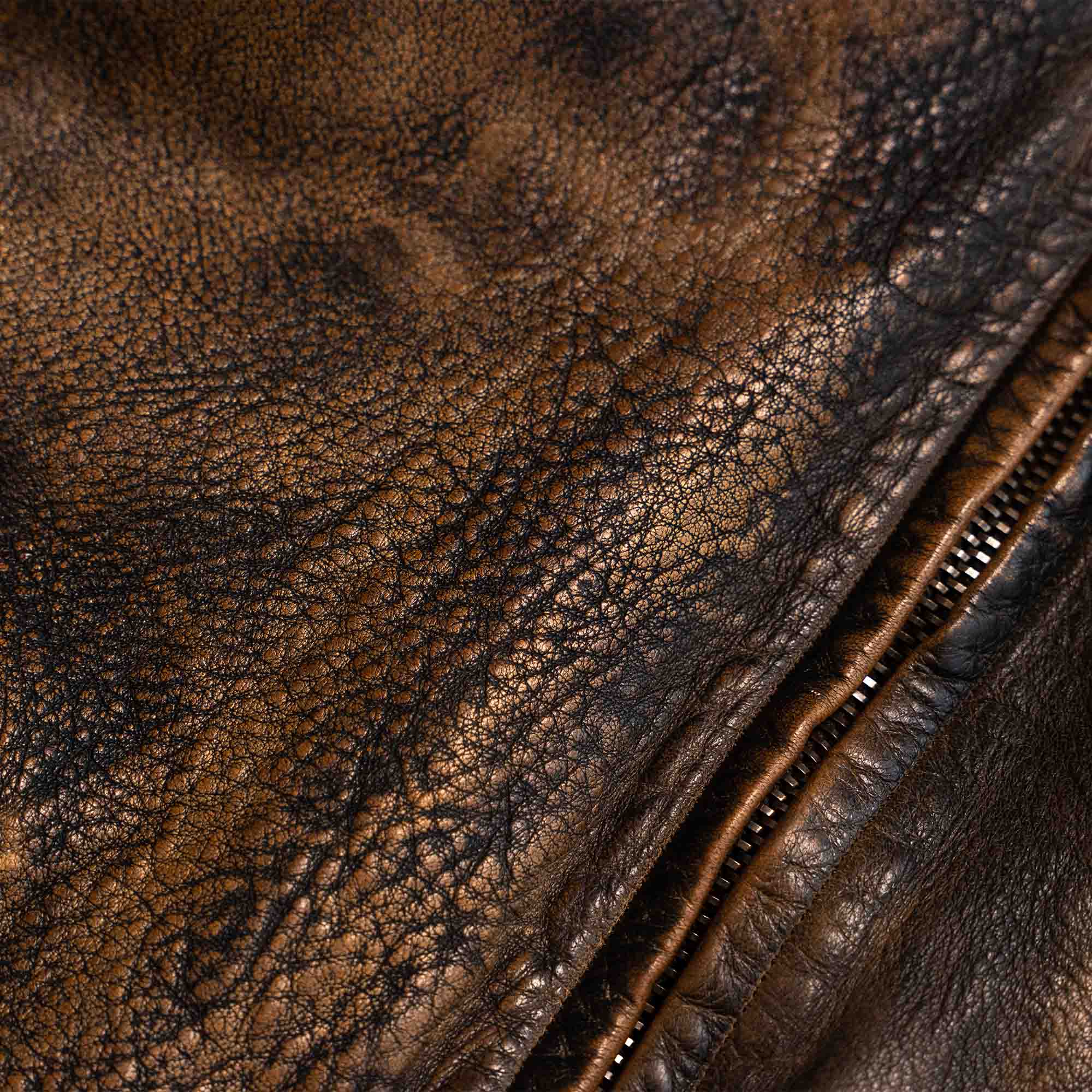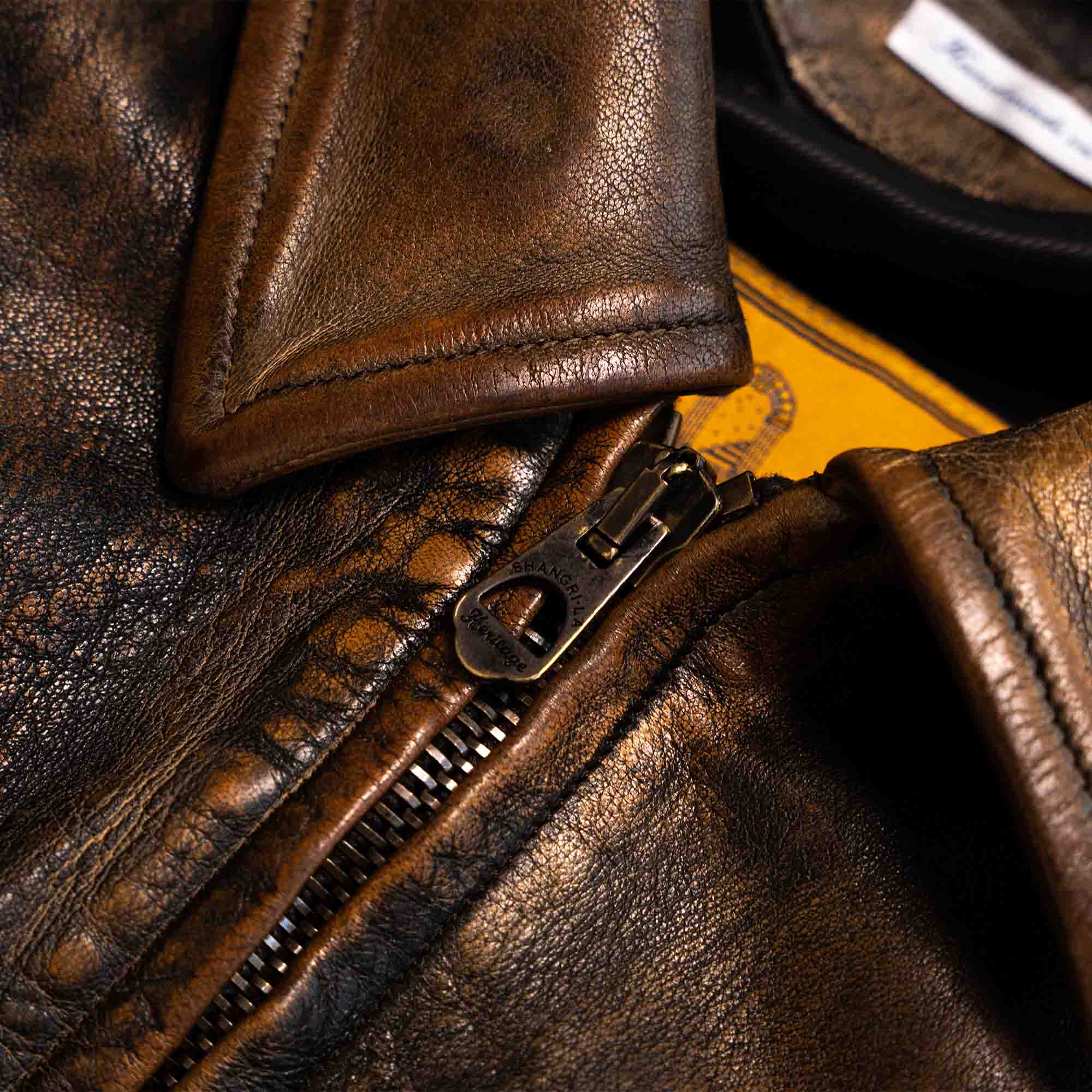 An exceptional jacket from Shangri-La Heritage. The leather treatment is fabulous, it looks like it has already been in numerous adventures but indeed is brand new. The color is also amazing with a full palette of brown nuances. Stylish design. Highly recommended.