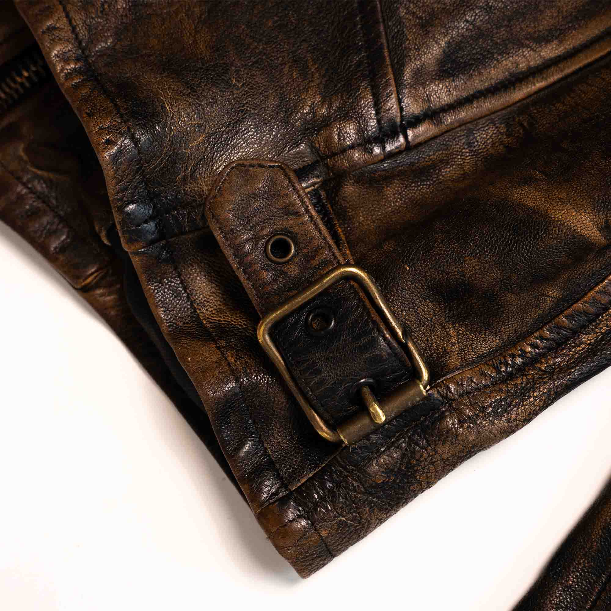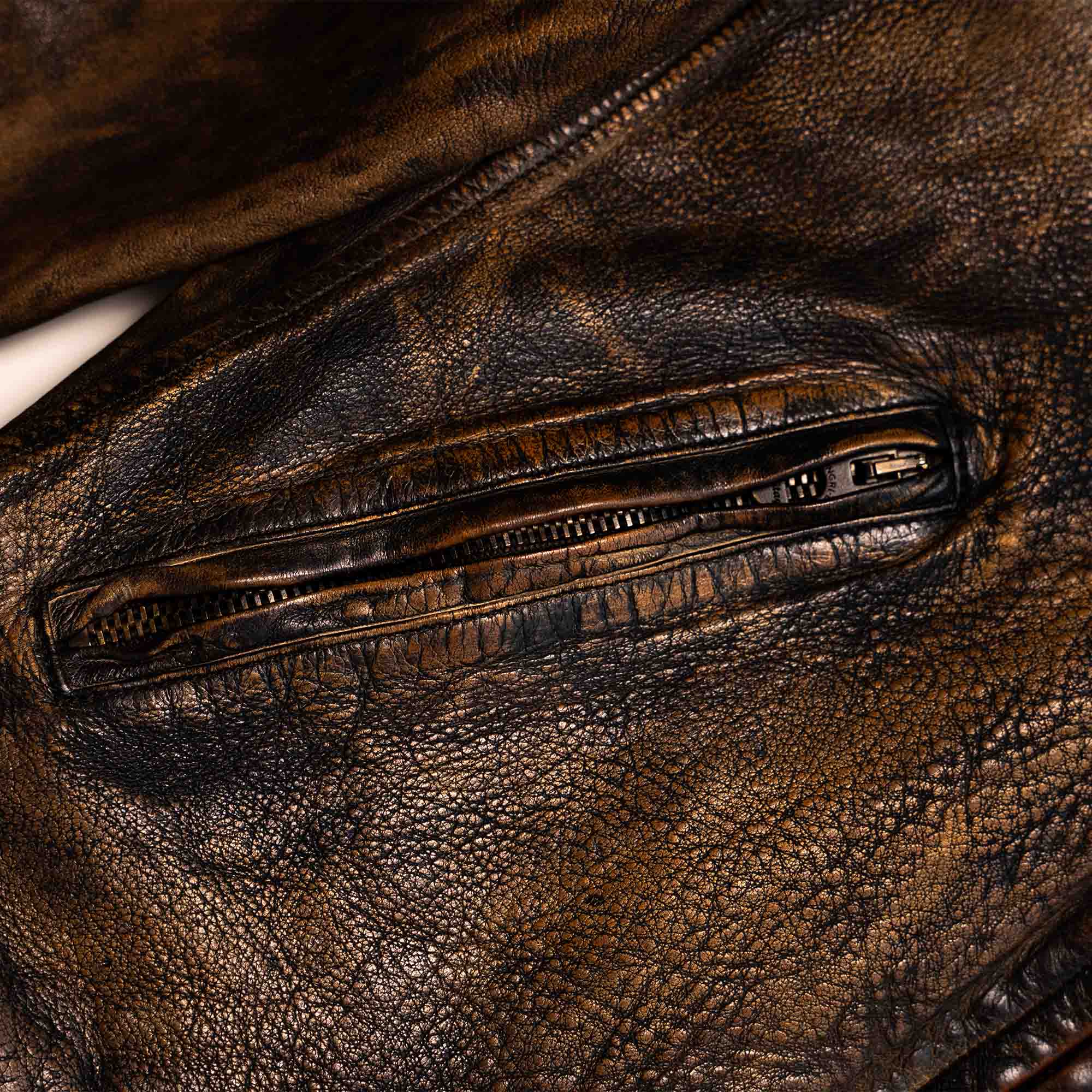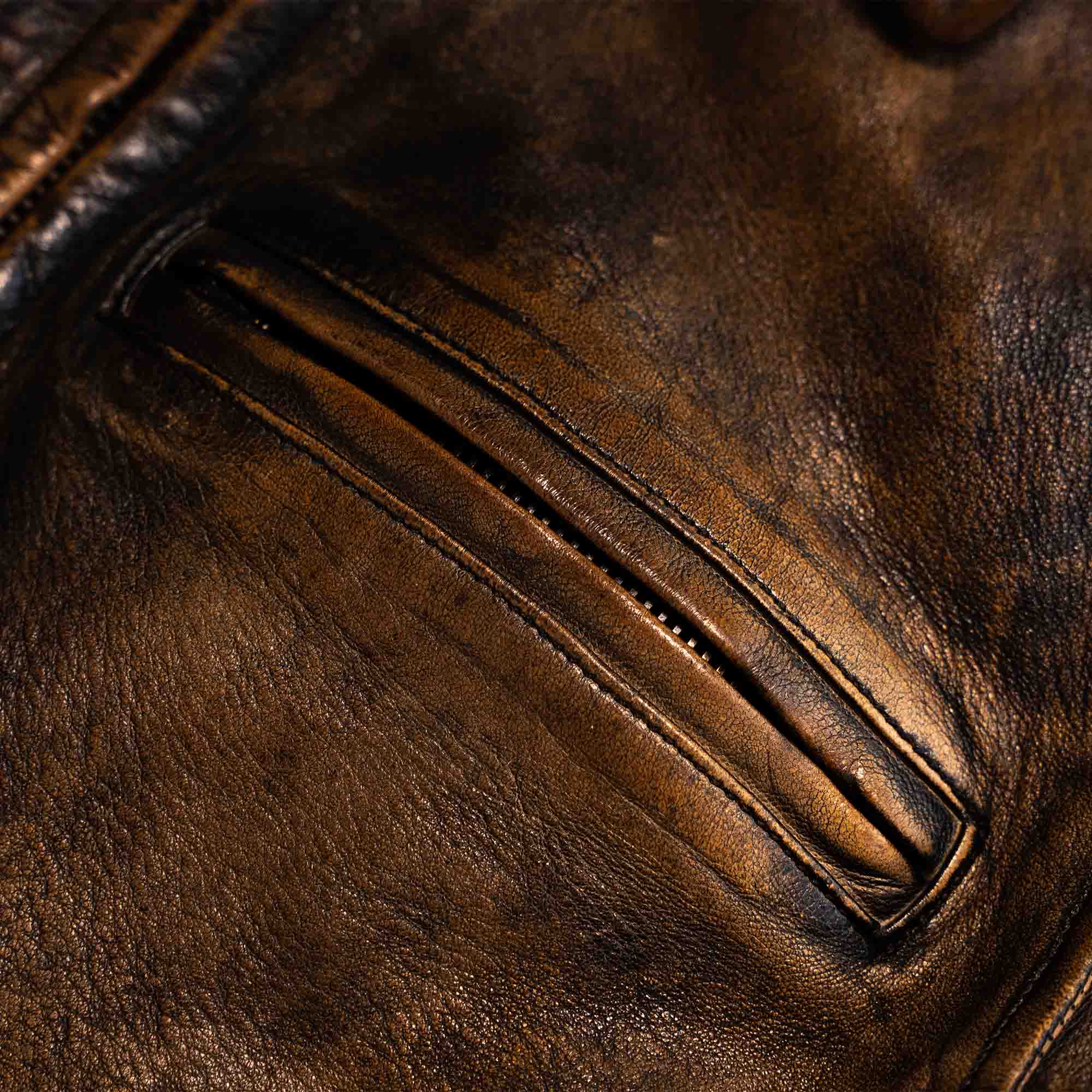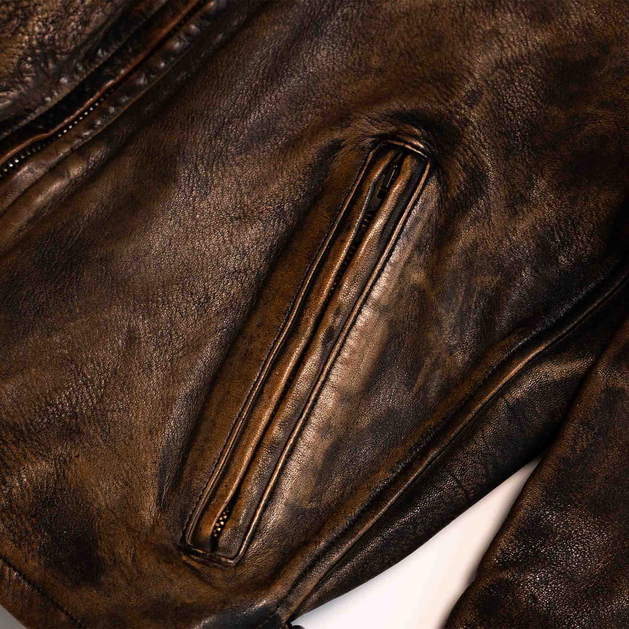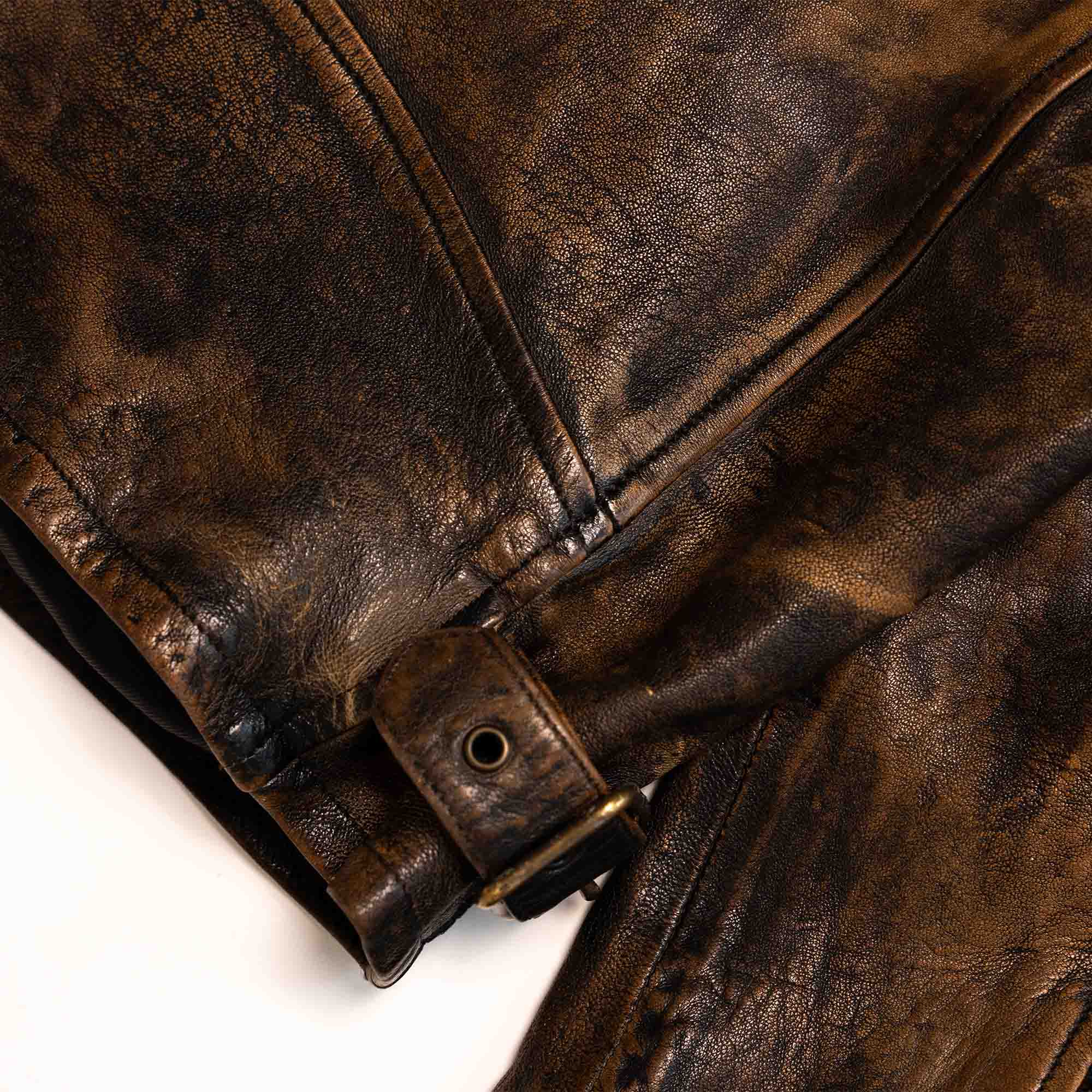 An exceptional jacket from Shangri-La Heritage. The leather treatment is fabulous, it looks like it has already been in numerous adventures but indeed is brand new. The color is also amazing with a full palette of brown nuances. Stylish design. Highly recommended.